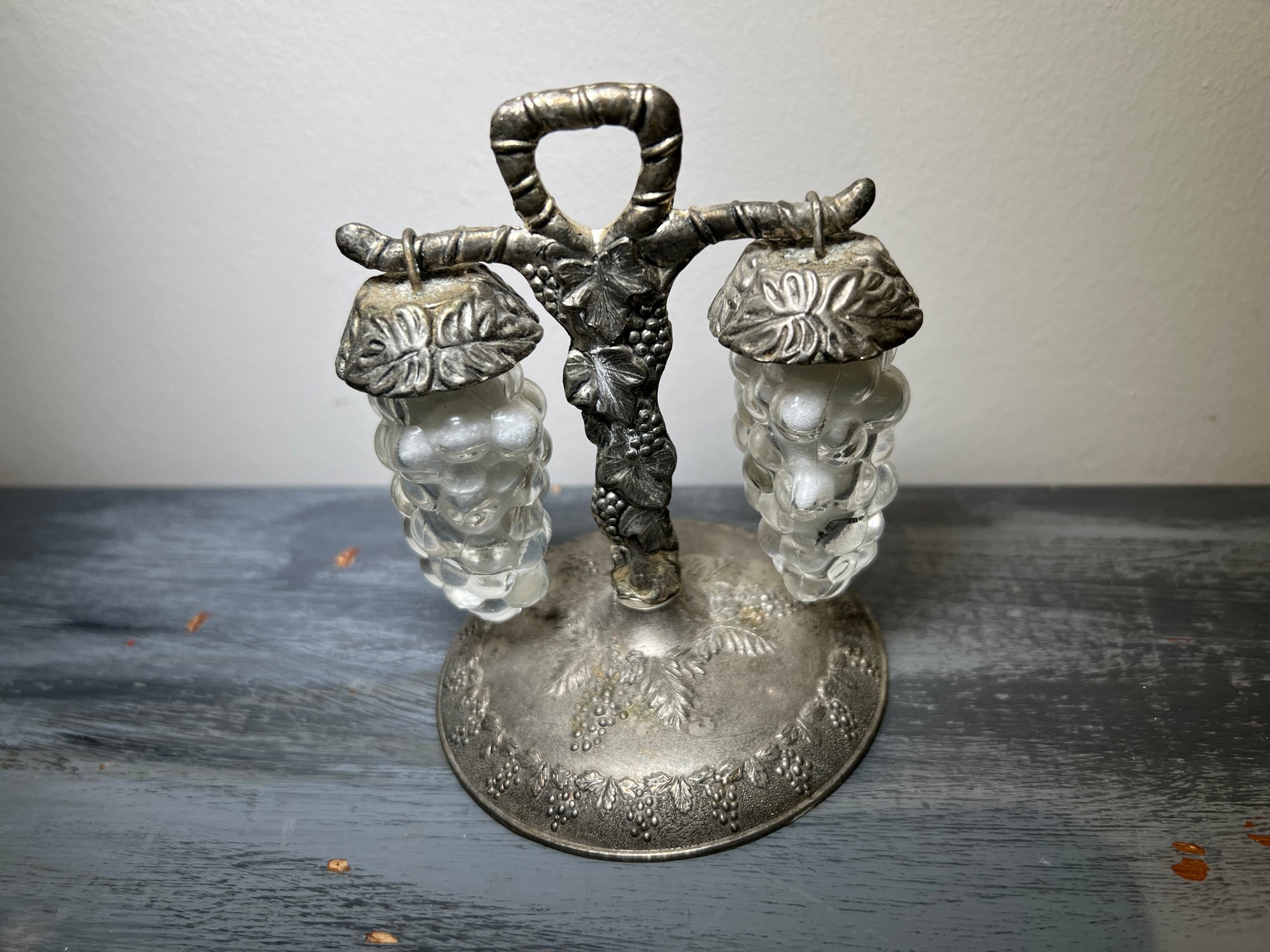 Charming little vintage 1950s silver-plated tabletop stand with two hanging salt shakers in the form of bunches of grapes, made in Japan Apco.