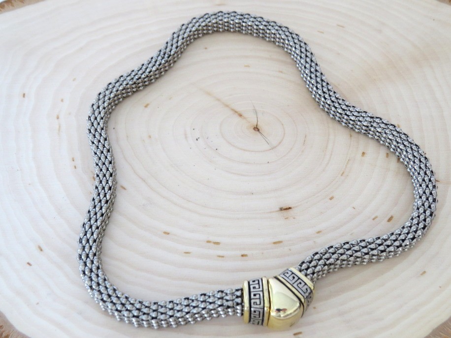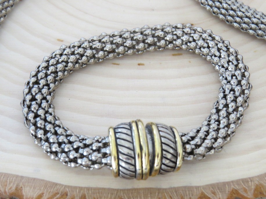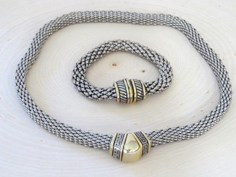 Vintage woven necklace & bracelet set with two tone magnetic clasp. Necklace and bracelet are done in a silver tone heavy mesh squared rope design. Necklace measures 17 1/2" long X 1/4" wide X 1/4" thick. Bracelet is 7 3/4" long.