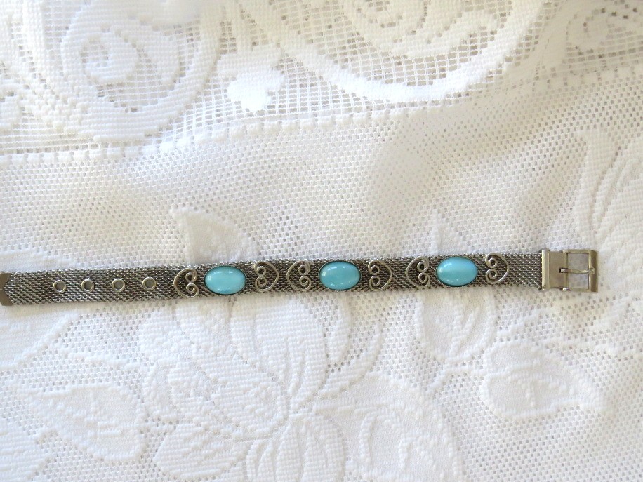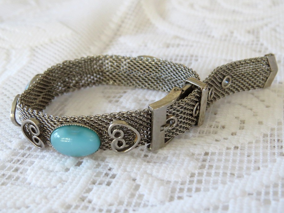 This vintage silver tone mesh buckled belt style bracelet is a unique and eye-catching accessory with a beautiful glass bead design and adjustable versatility. Fashioned in a sleek silver finish, the bracelet features a flexible mesh belt design that fastens at multiple stations, allowing it to comfortably fit a variety of wrist sizes from 5 3/4" to 7" in length at the different fastening holes and is 7/16" wide,
