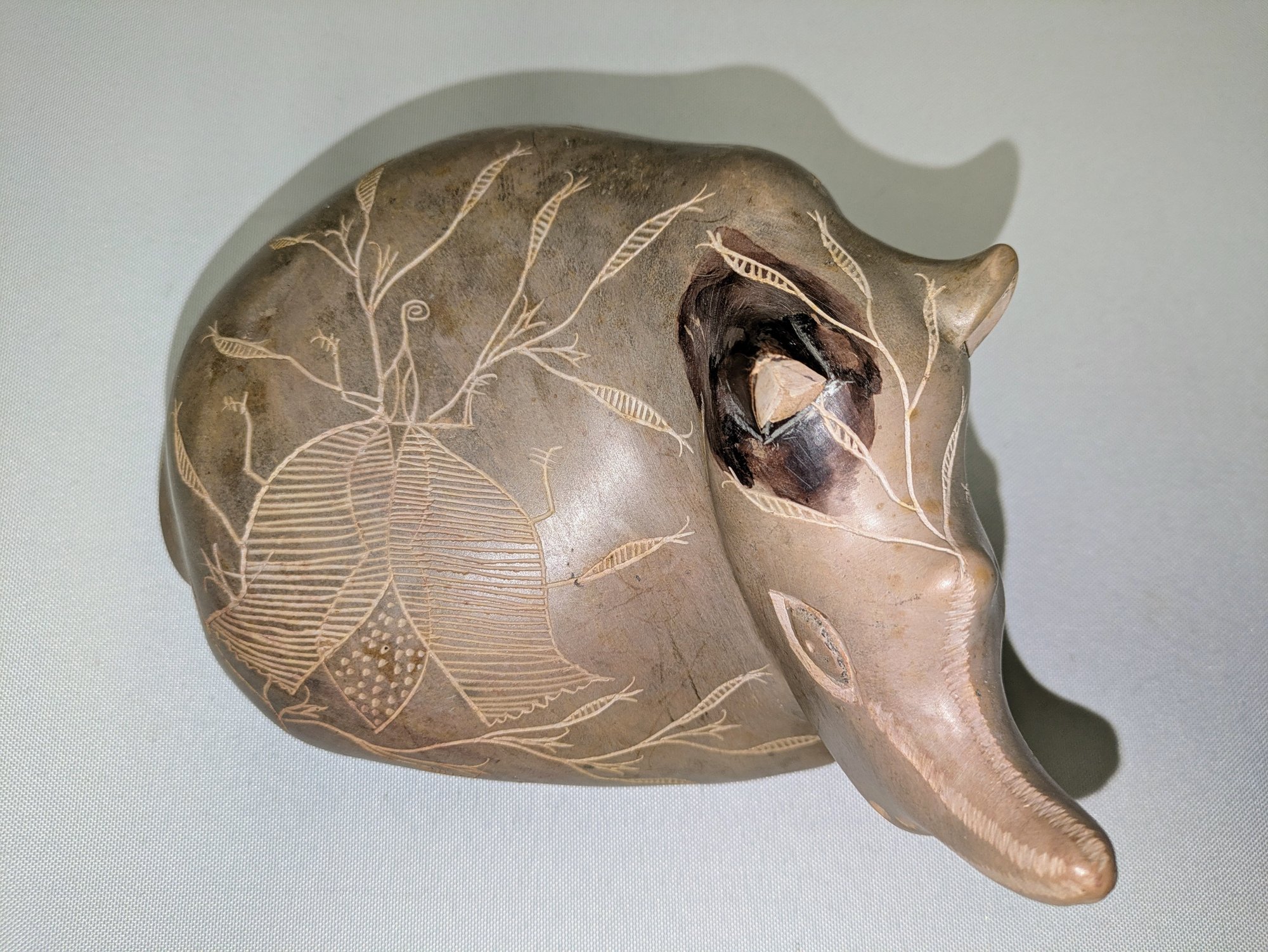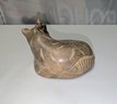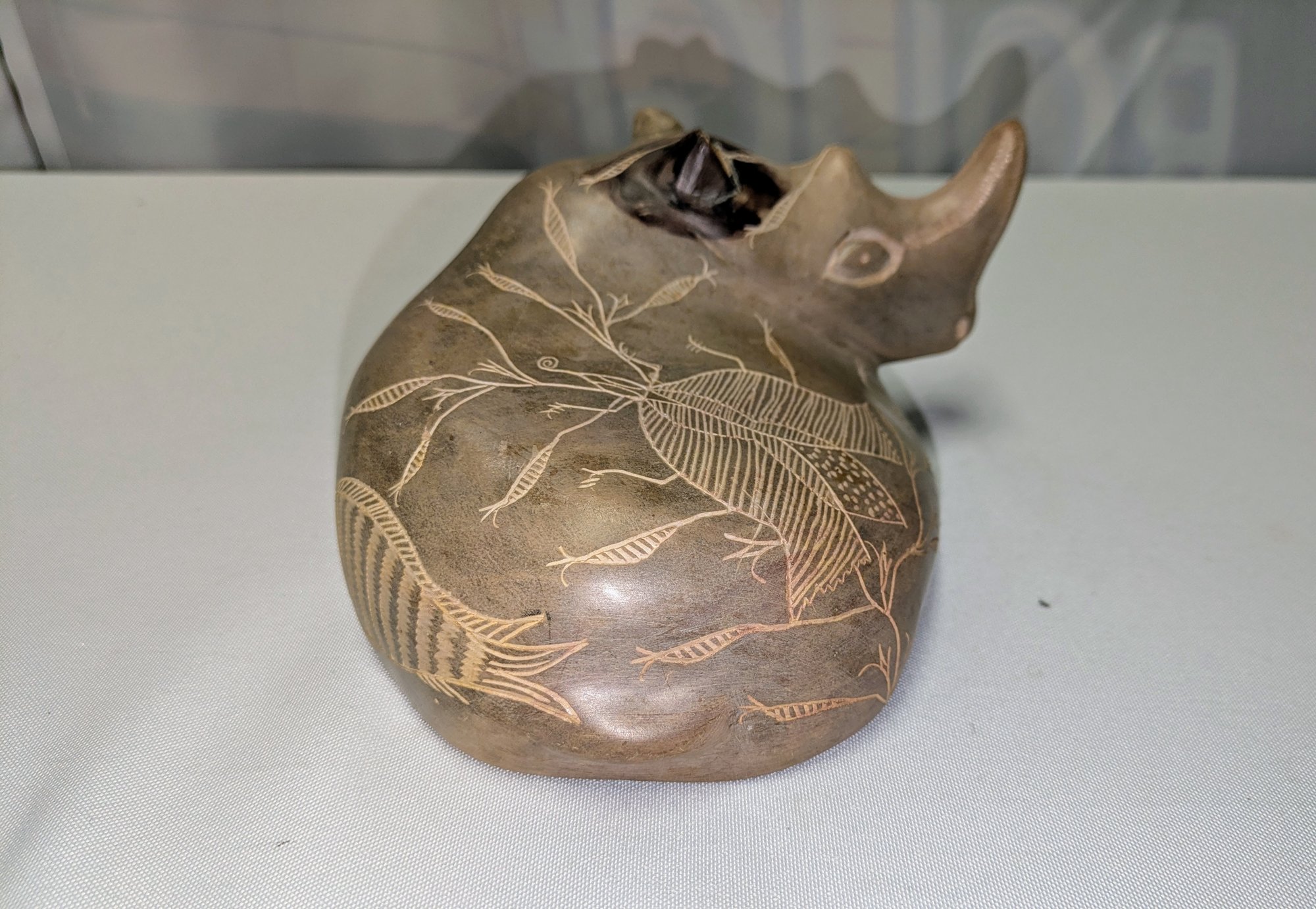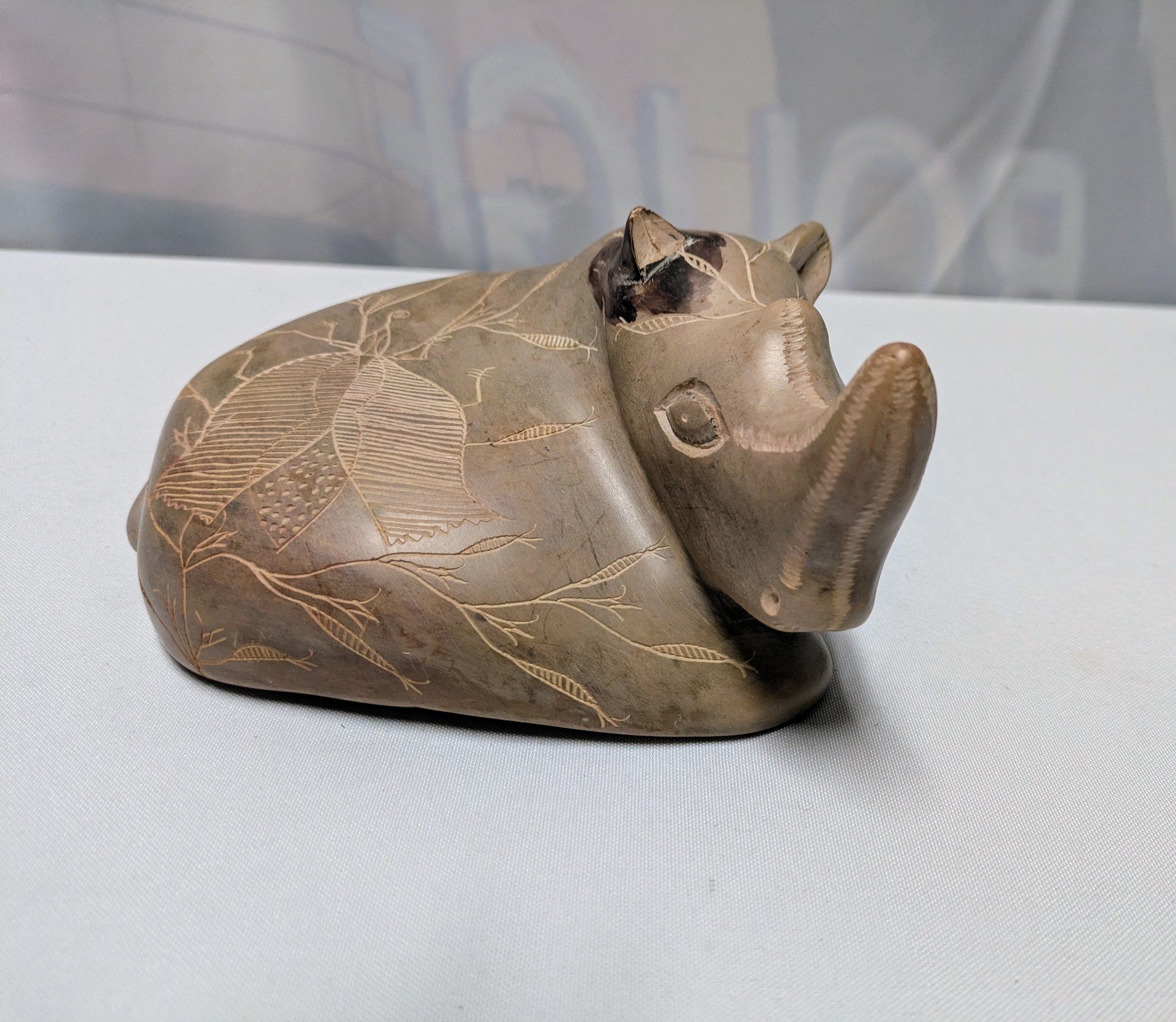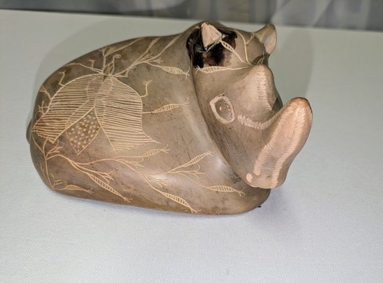 Vintage Soapstone/Stone hand-carved stone Hippo. Reclining Hippo with detailed, incised patterns of leaves and branches on its body. Excellent Vintage Condition. 3.25"H x 5" x 7"