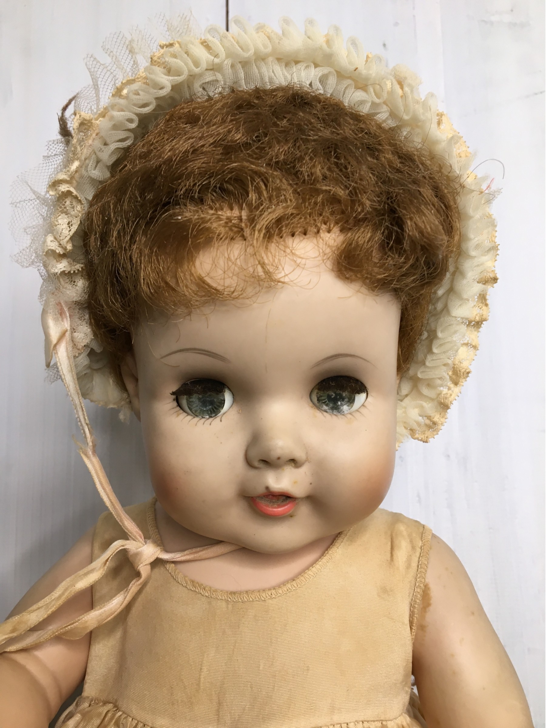 Vintage, soft-vinyl baby doll with very pretty features. She's older than she looks, over 70 years! Generally good condition for her age; see pics.
