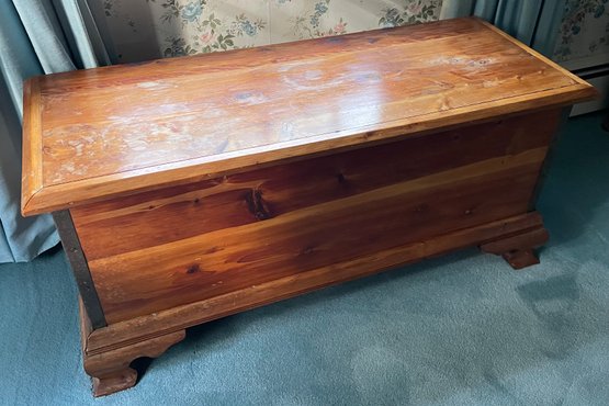 A very useful solid cedar chest with nice lines, and solid brass handles on the sides. The condition is good but the top could be refinished.