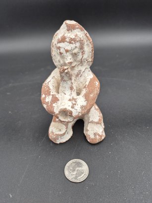 A nice vintage South American effigy, kiln fired with good age. A seated figure with a vessel rested in his hands. Good condition.