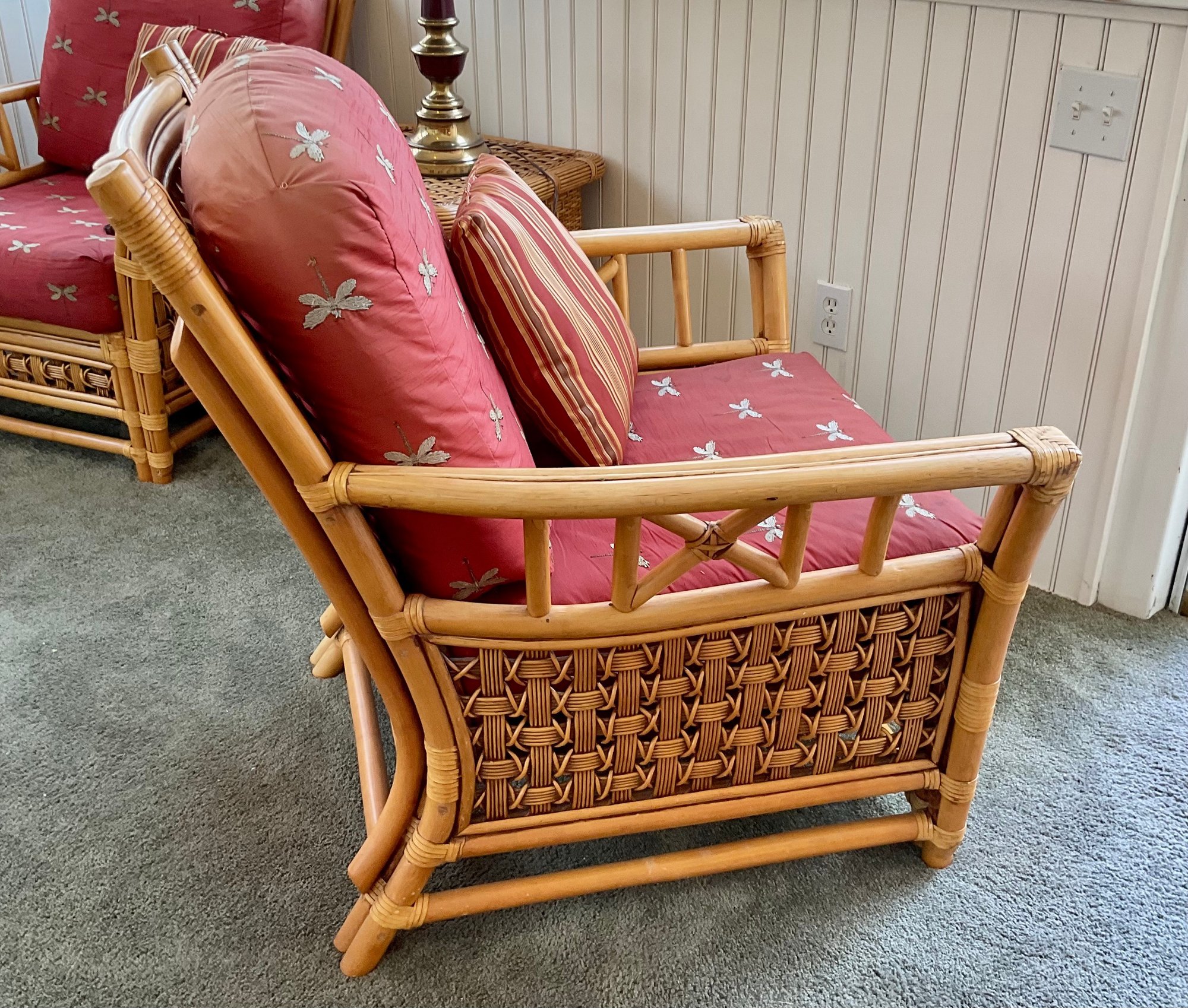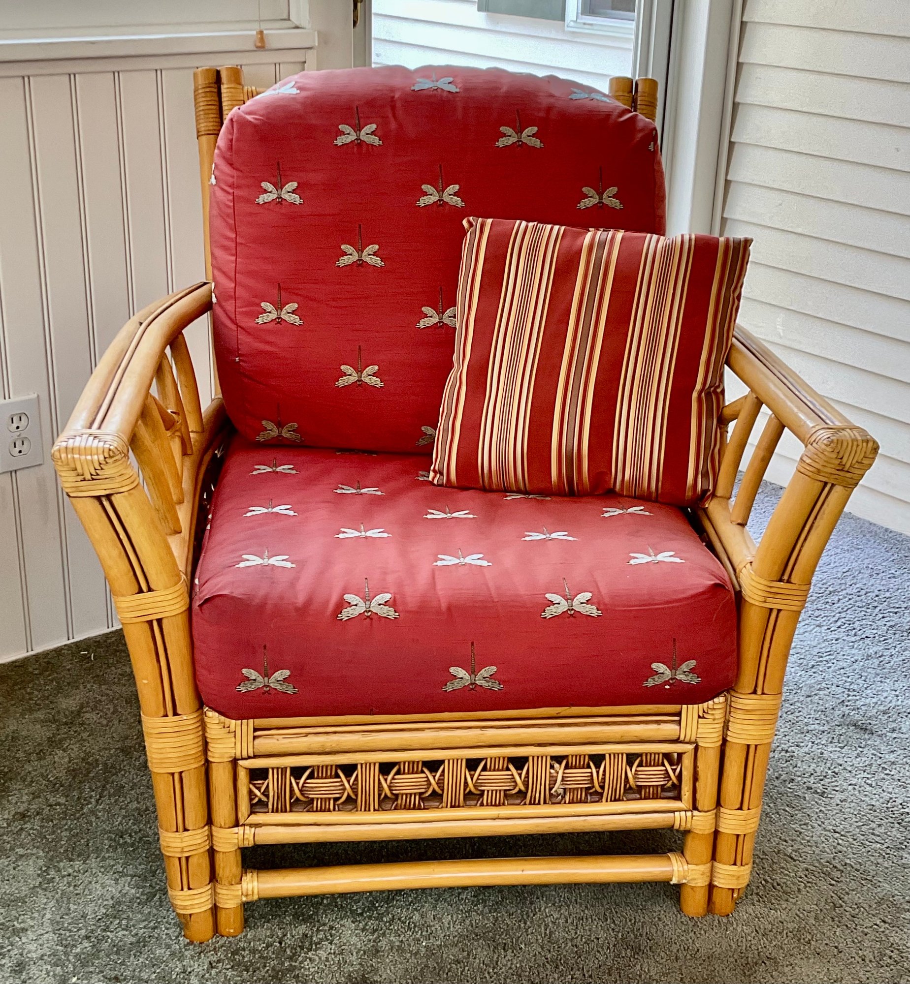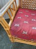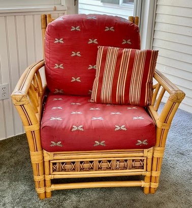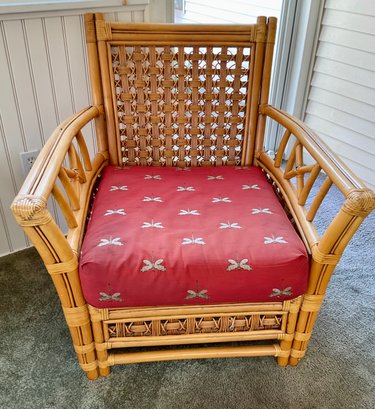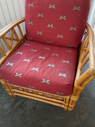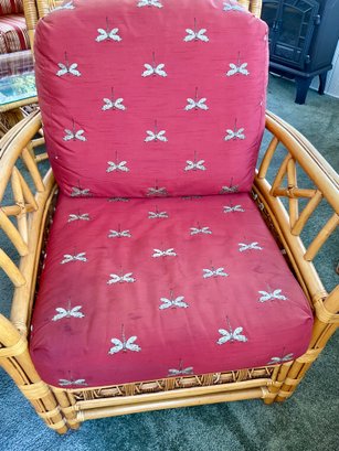 The chair is paired with plush, overstuffed cushions in a warm red fabric featuring a subtle dragonfly pattern, offering both comfort and a classic tropical flair.