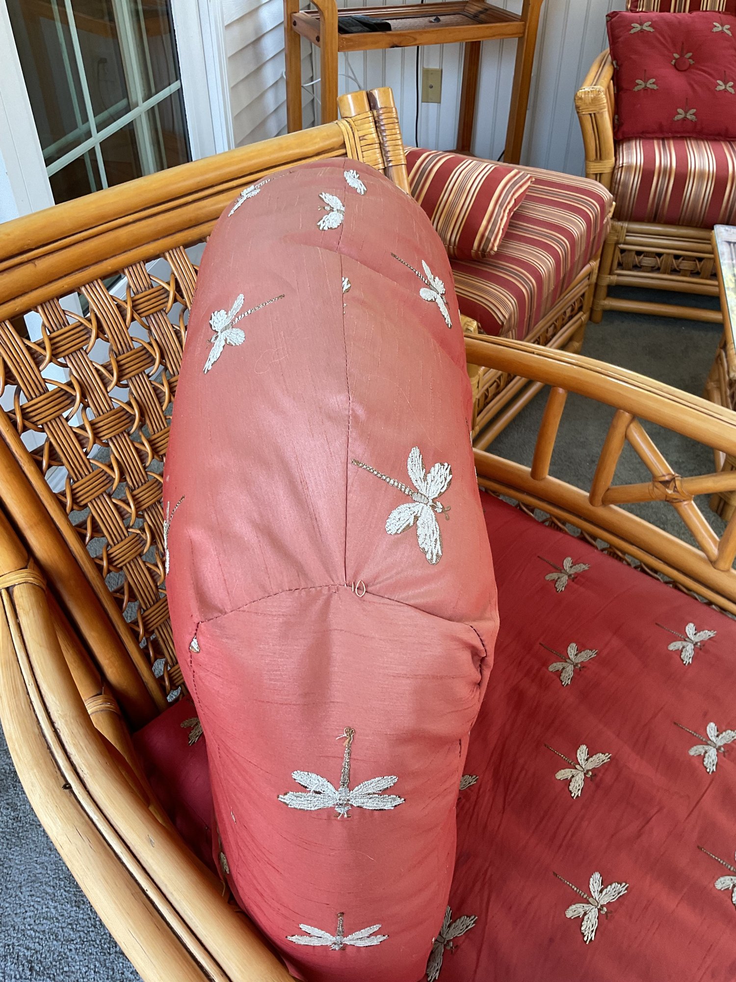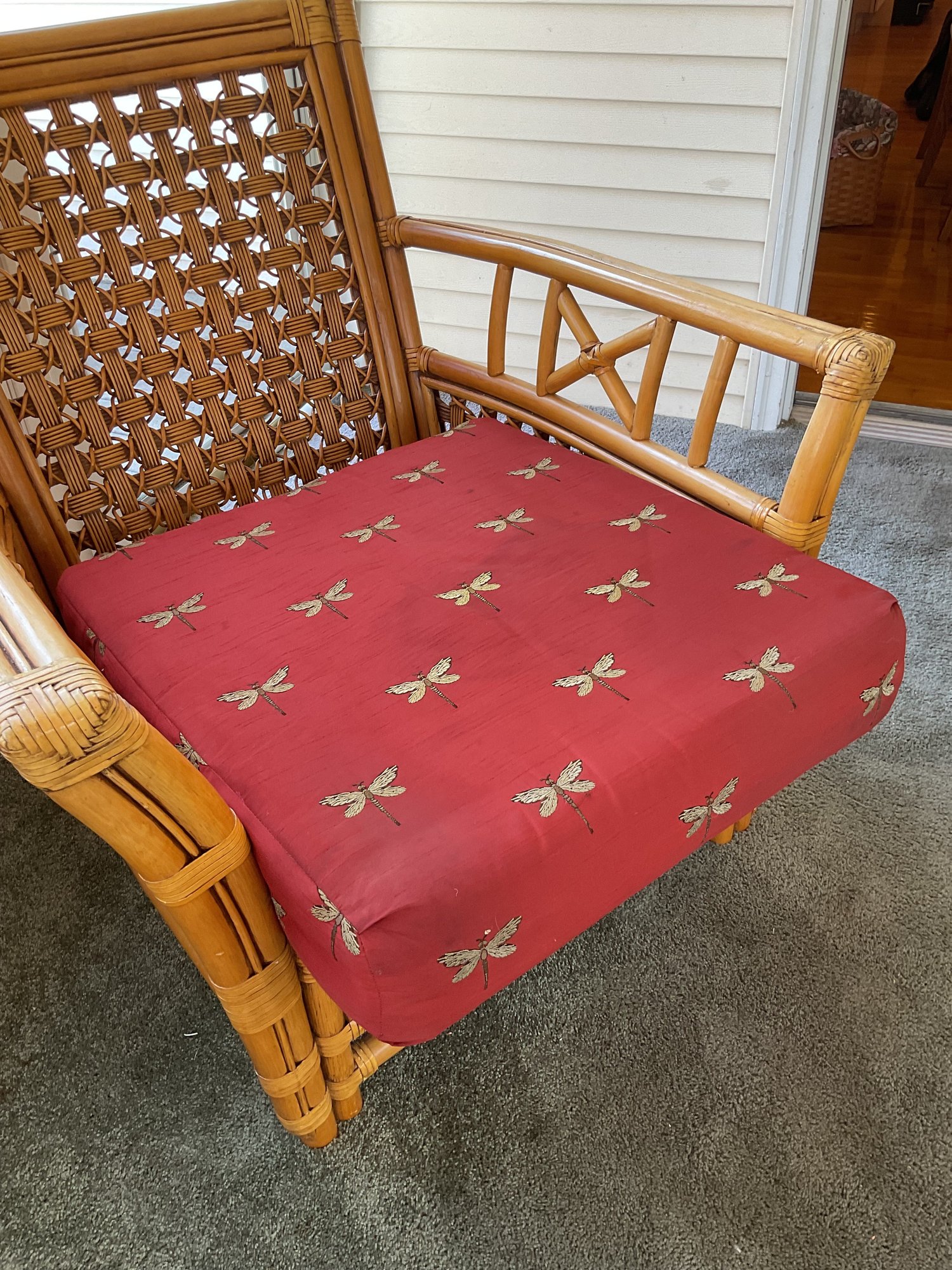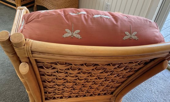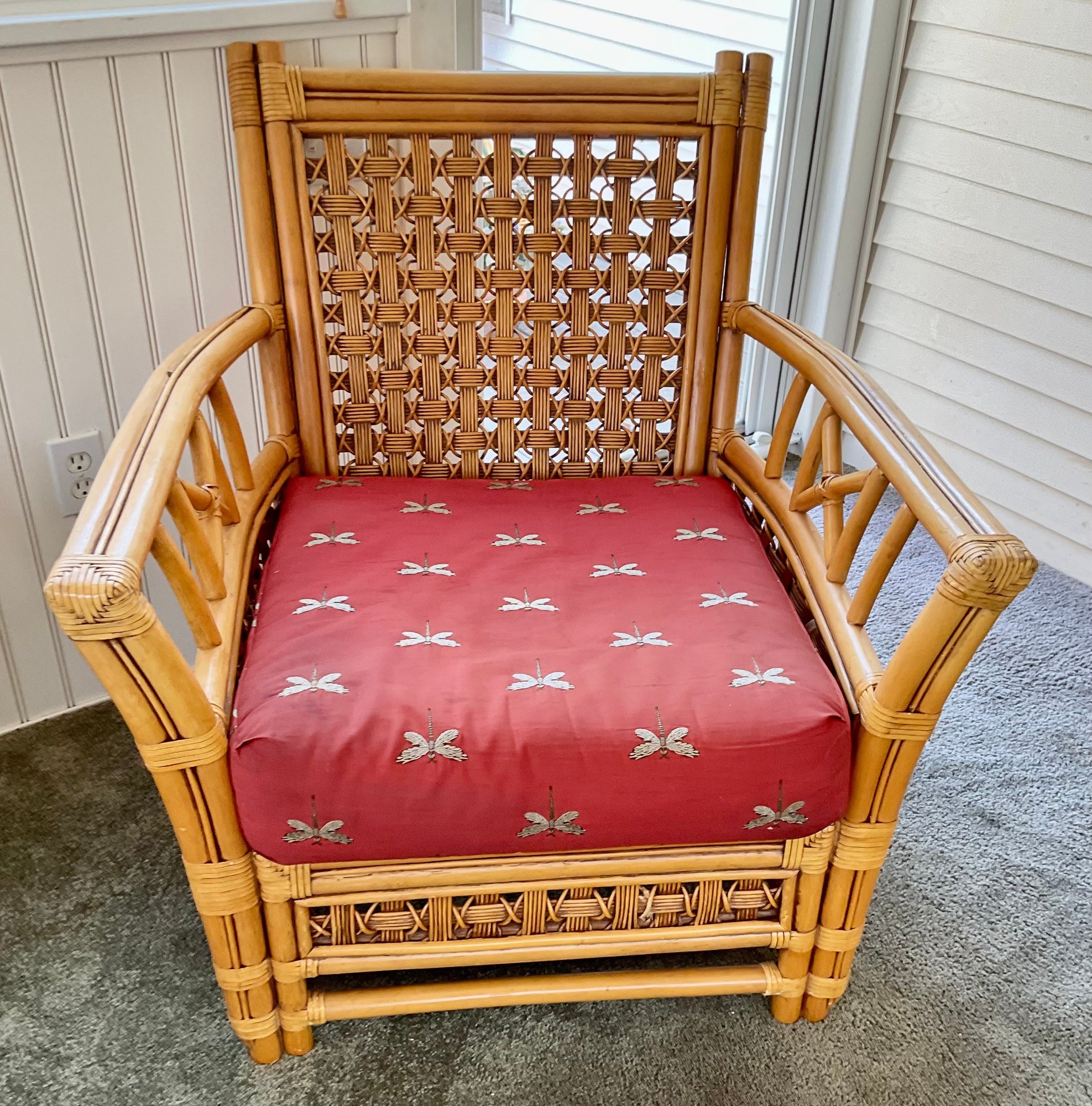 The chair is paired with plush, overstuffed cushions in a warm red fabric featuring a subtle dragonfly pattern, offering both comfort and a classic tropical flair.