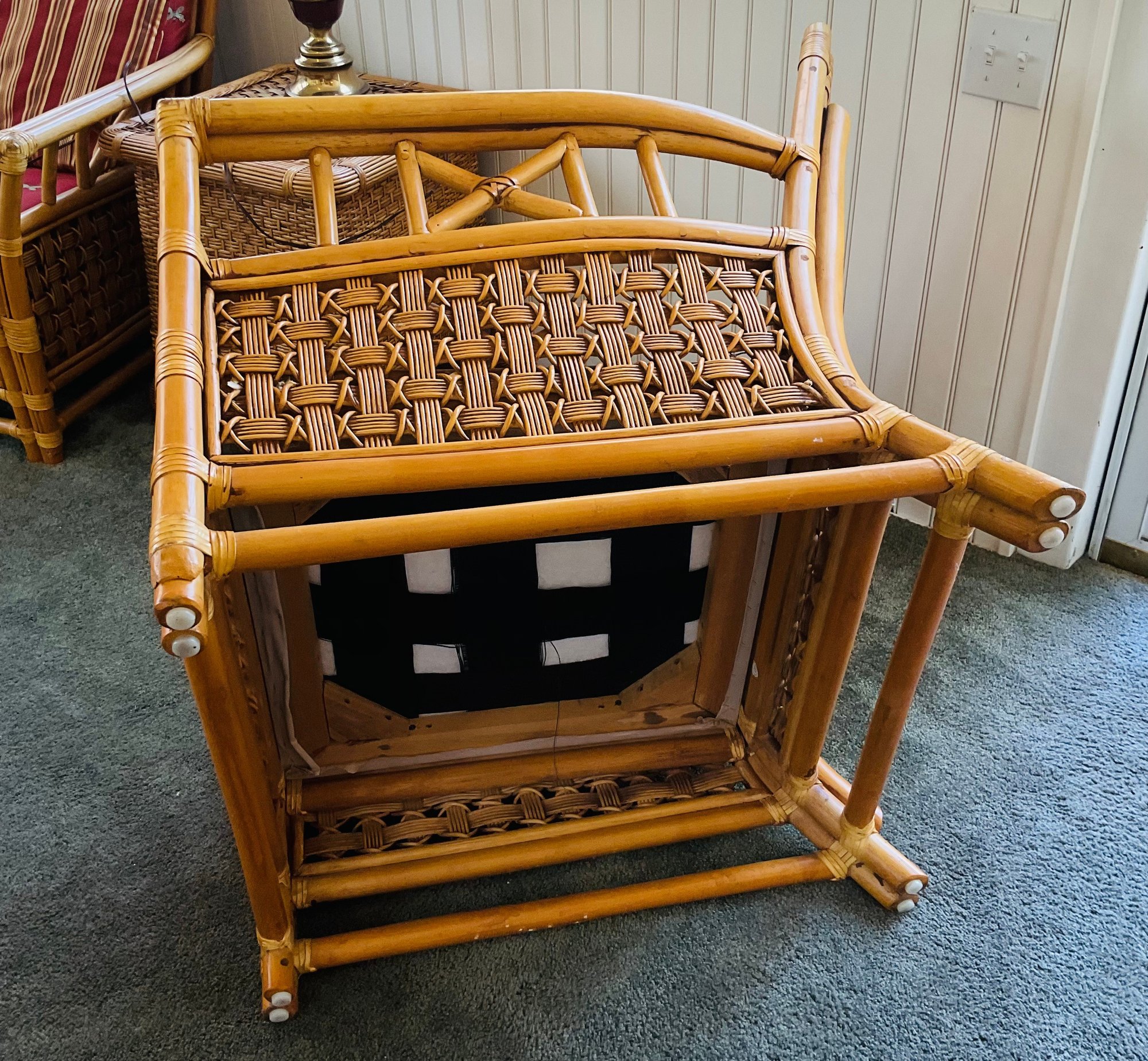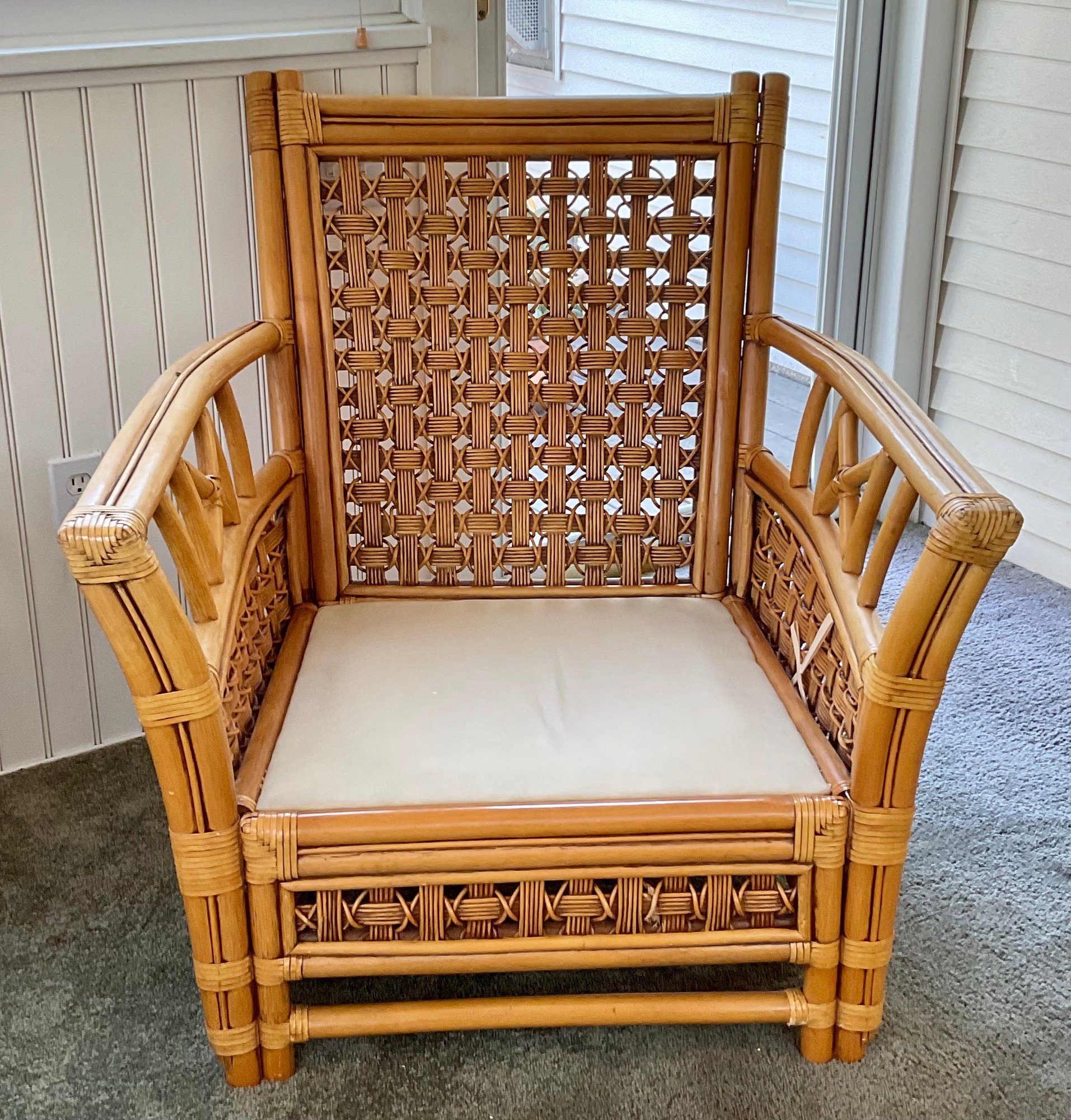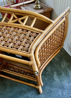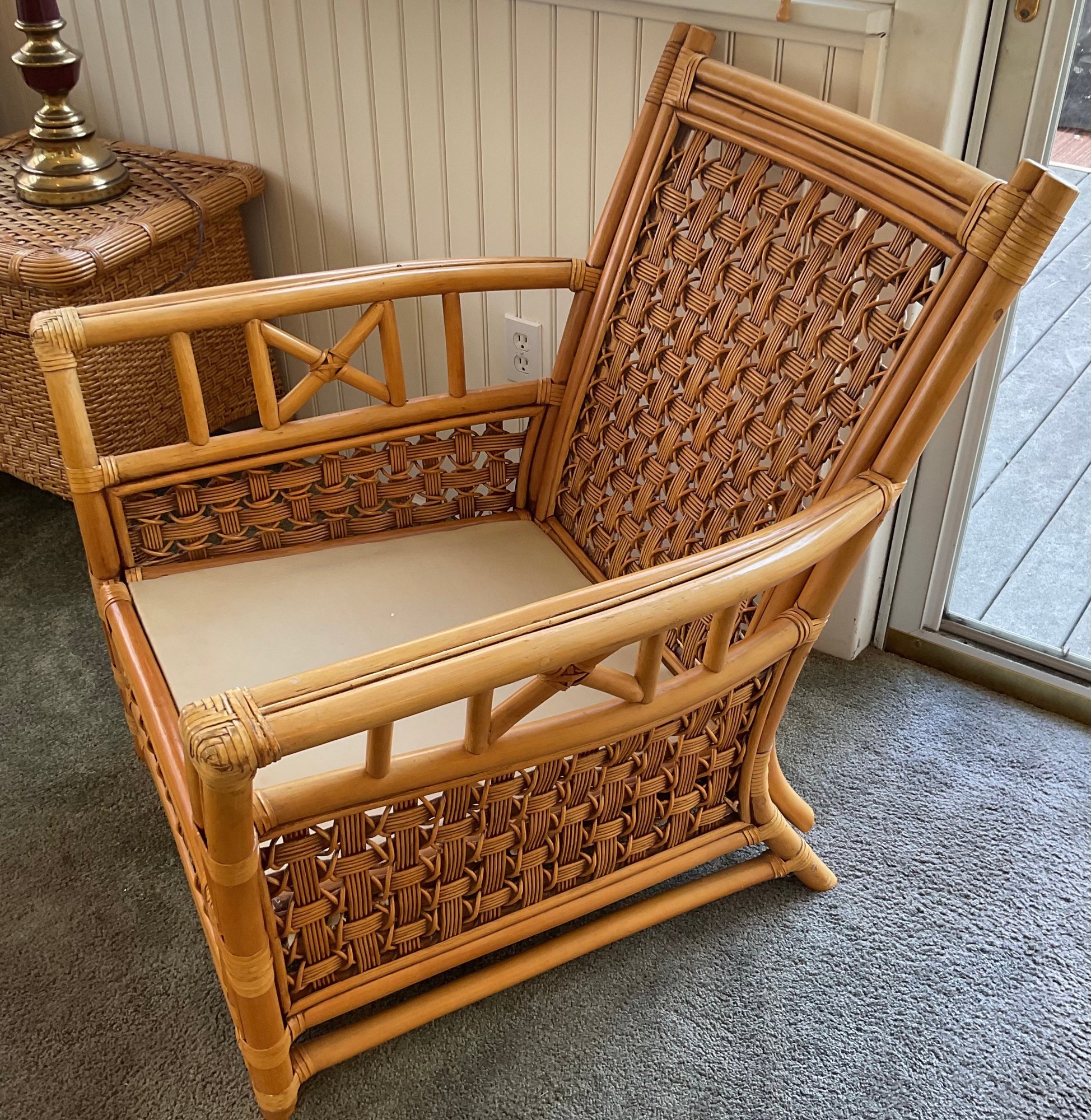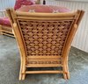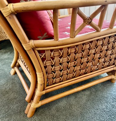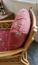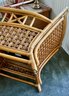 Condition: Excellent structural integrity. Note some sun fading to the upholstery and frame finish, characteristic of vintage rattan furniture.
