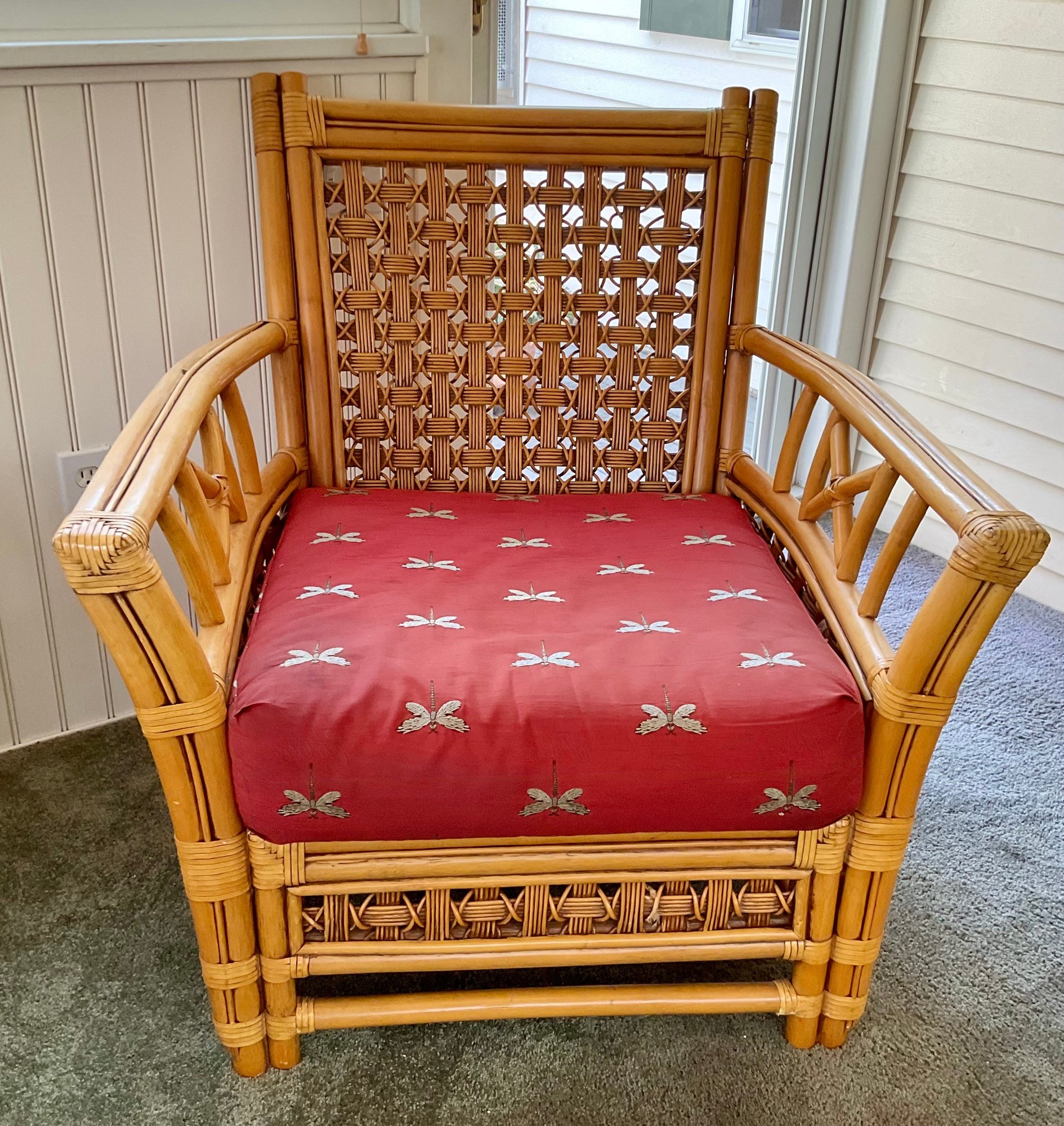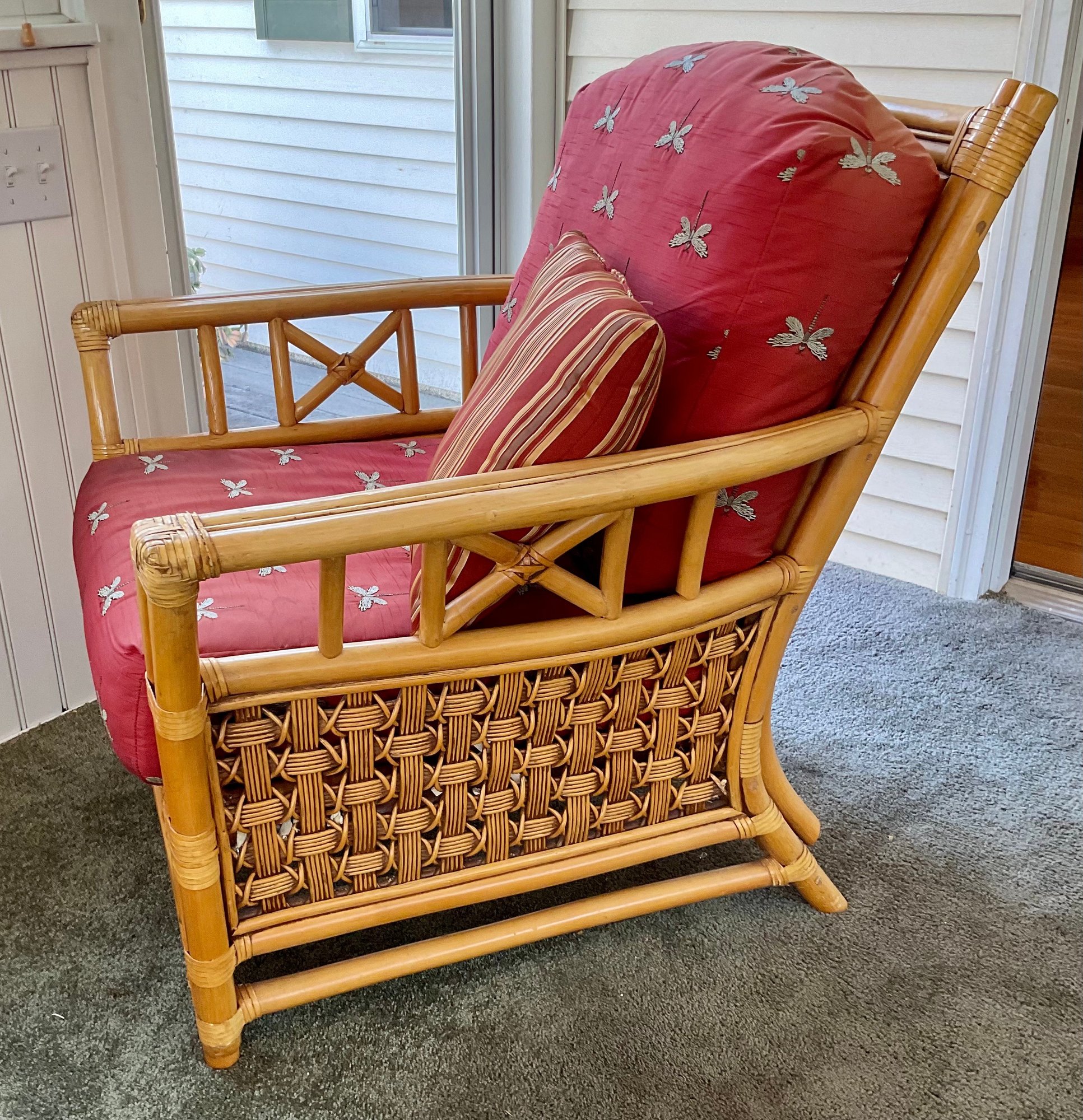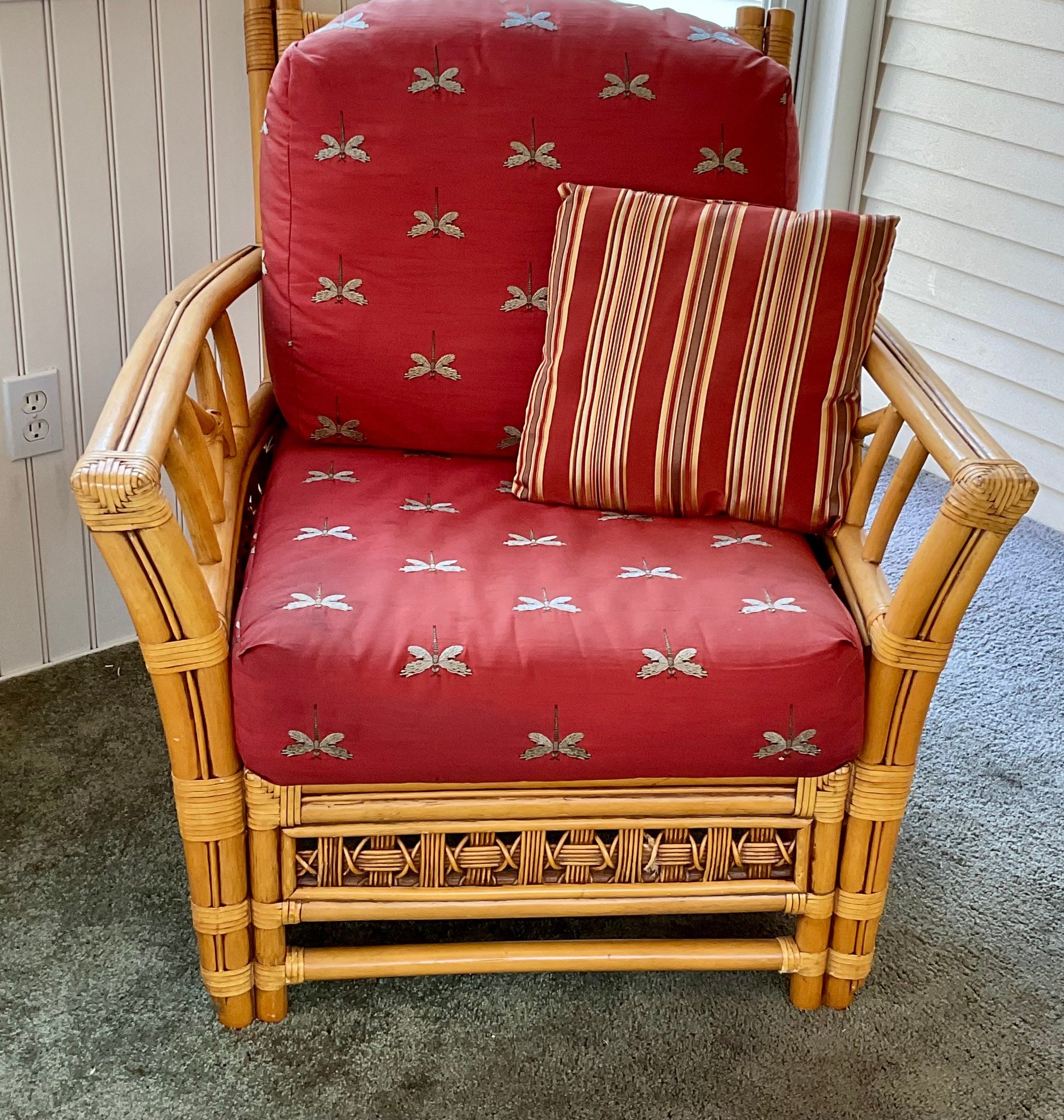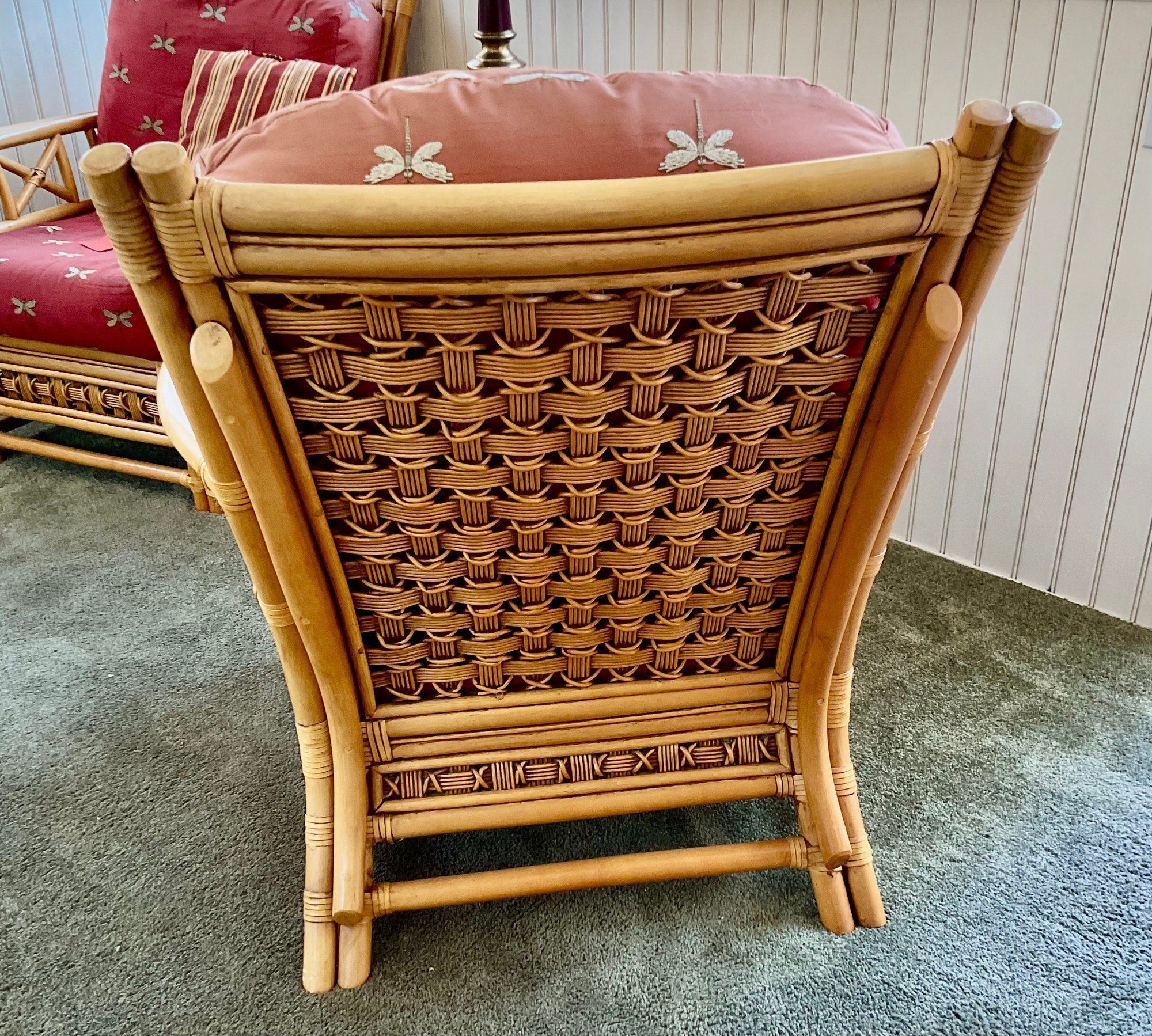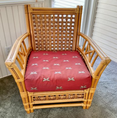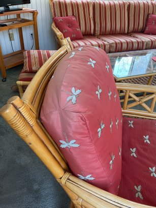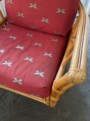 ​The chair is paired with plush, overstuffed cushions in a warm red fabric featuring a subtle dragonfly pattern, offering both comfort and a classic tropical flair.