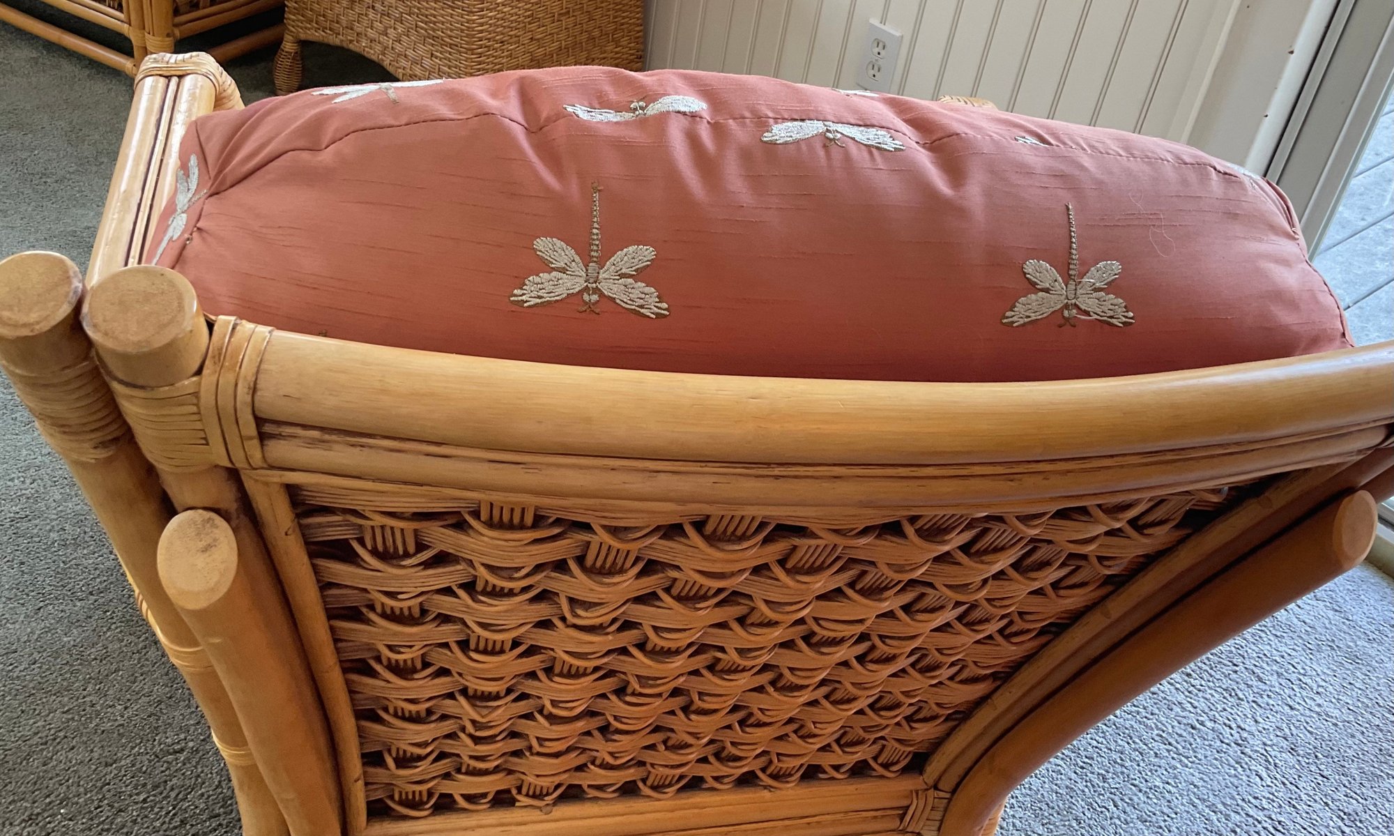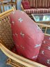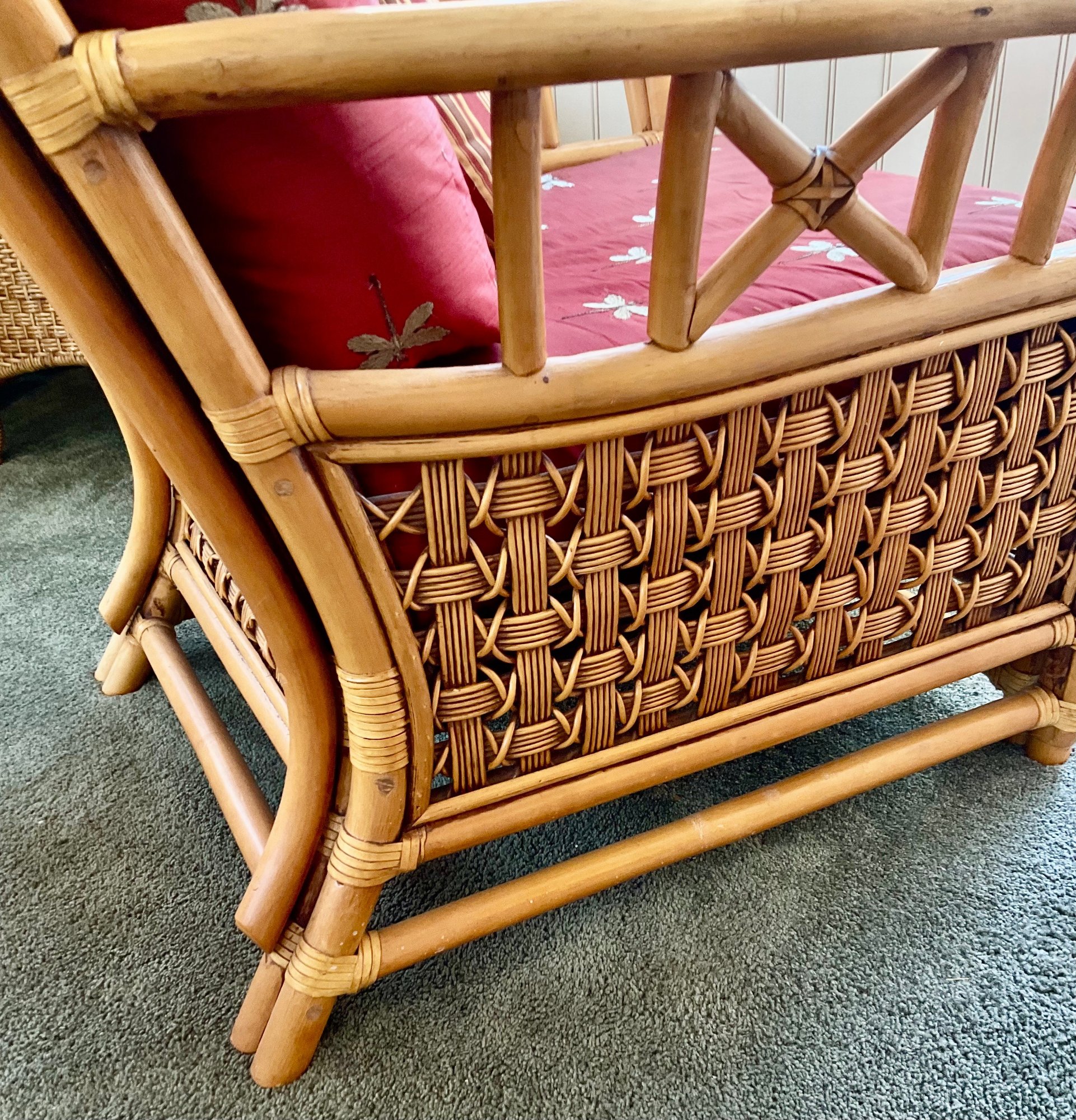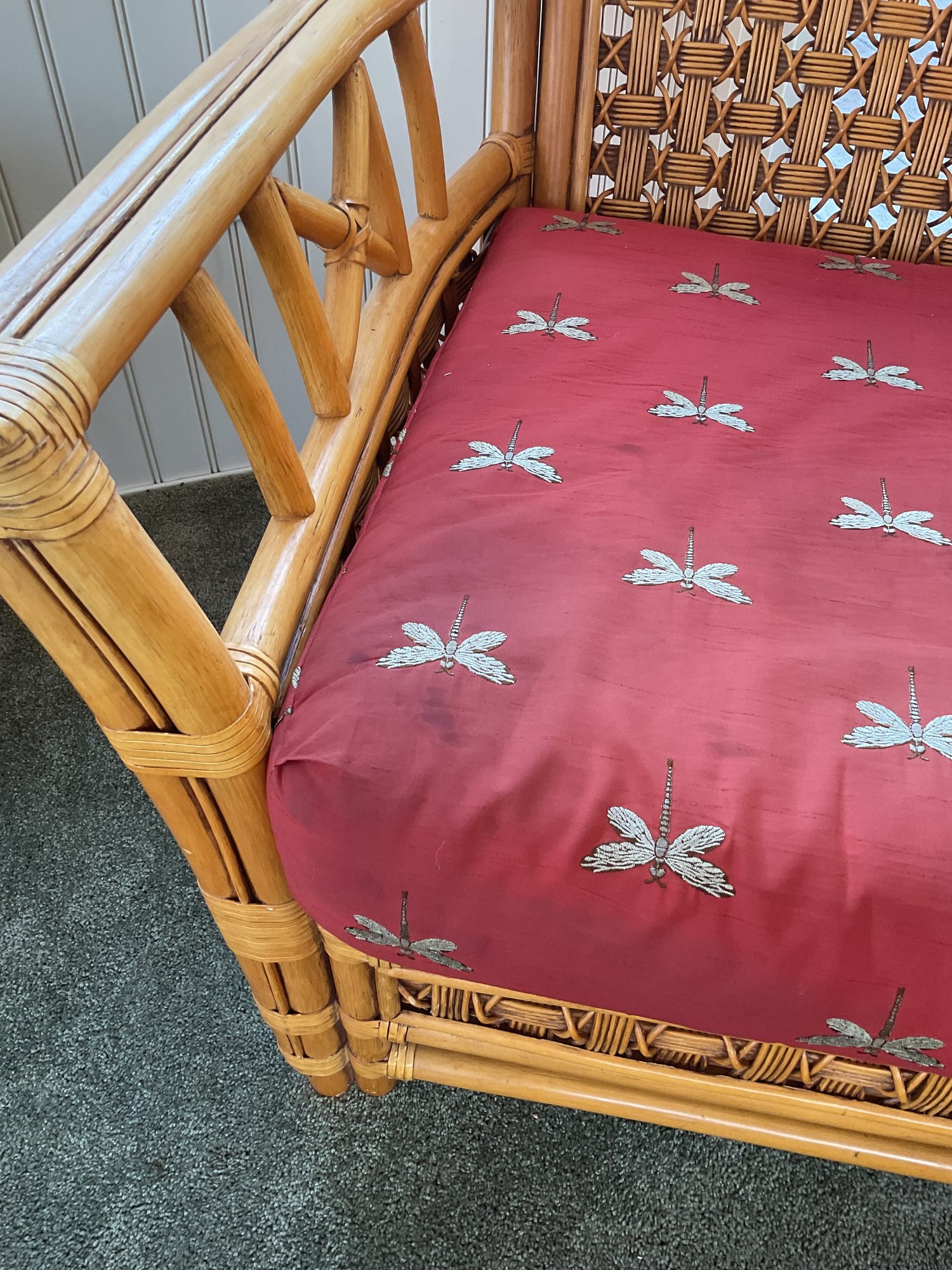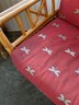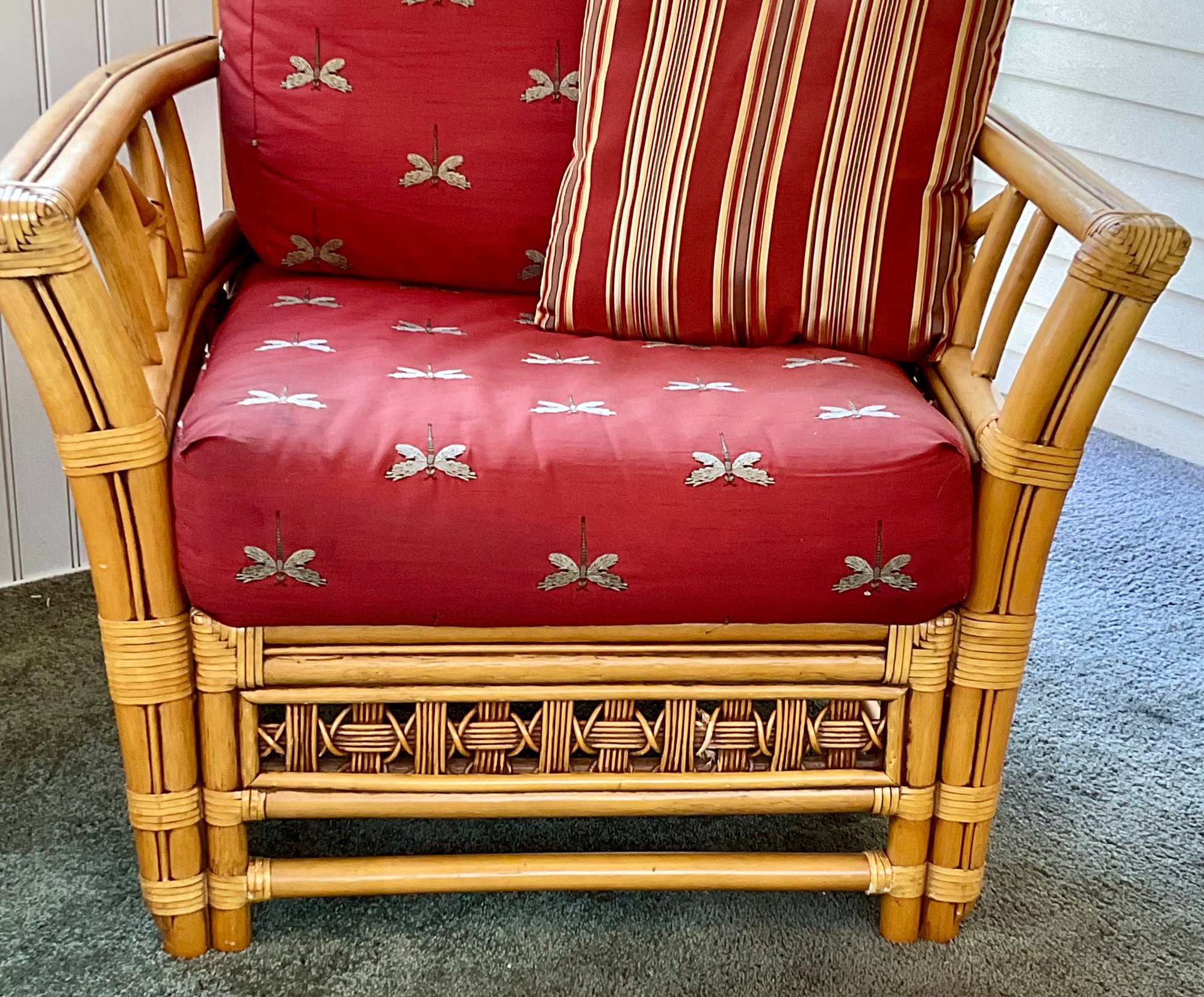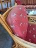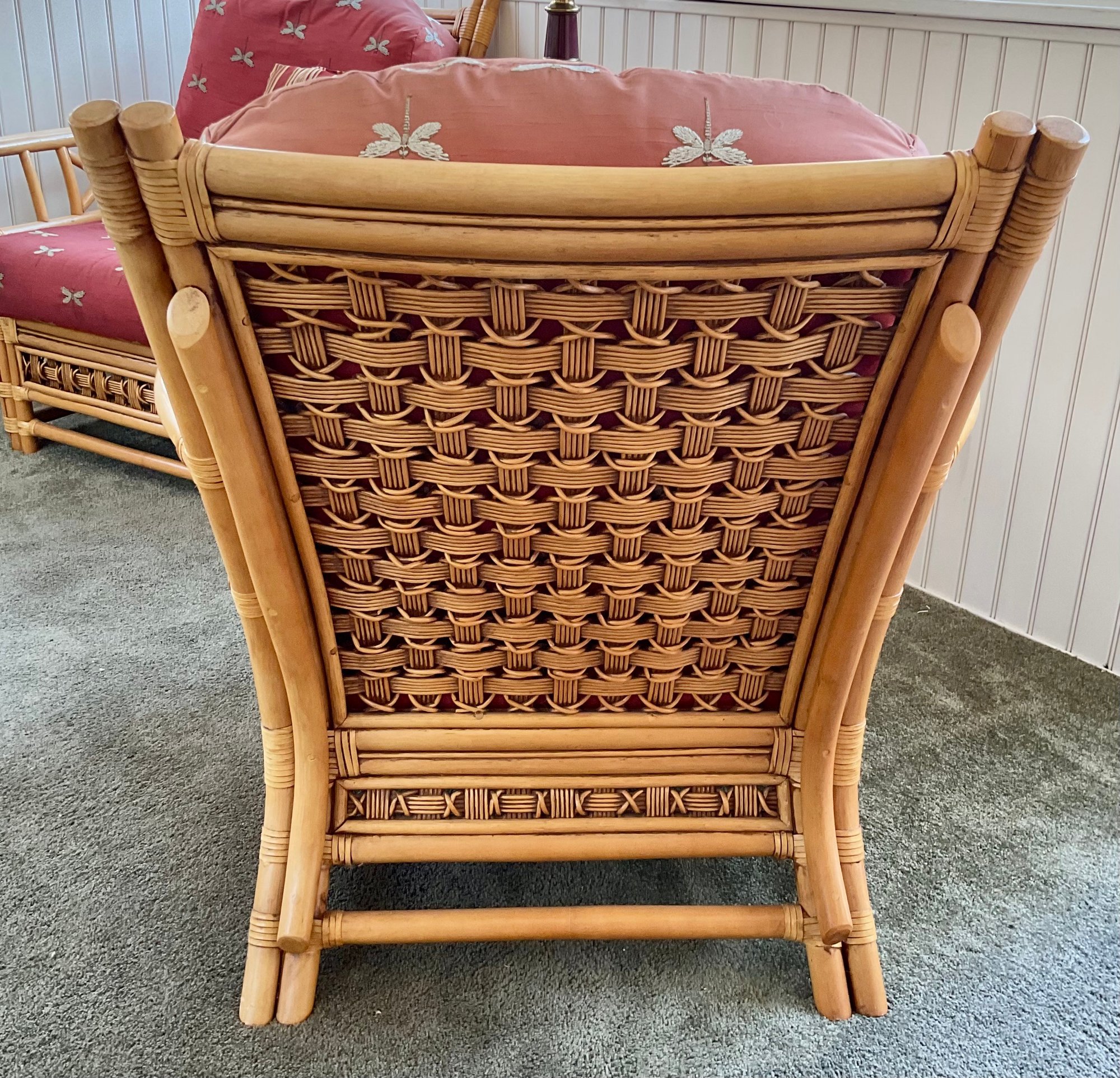 ​The chair is paired with plush, overstuffed cushions in a warm red fabric featuring a subtle dragonfly pattern, offering both comfort and a classic tropical flair.