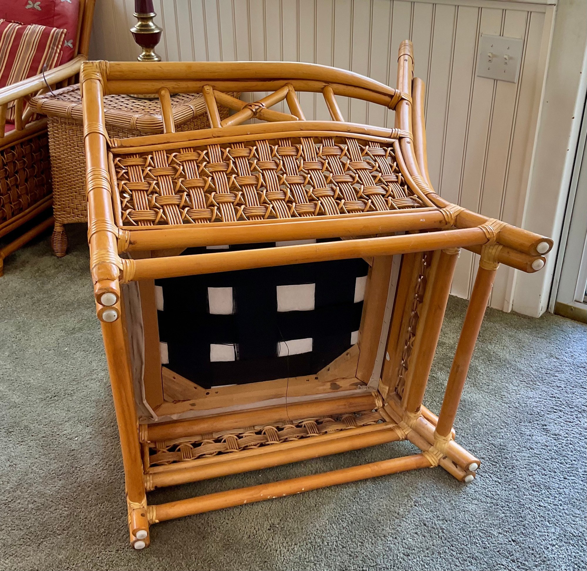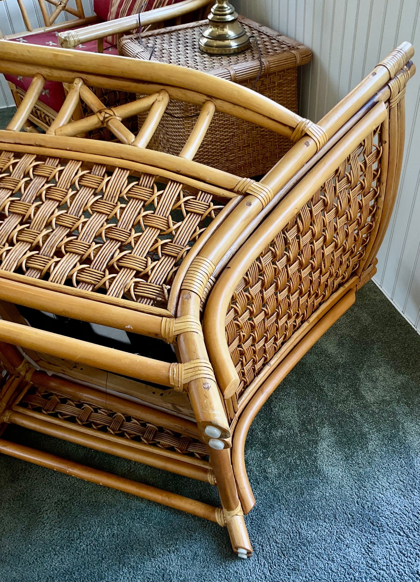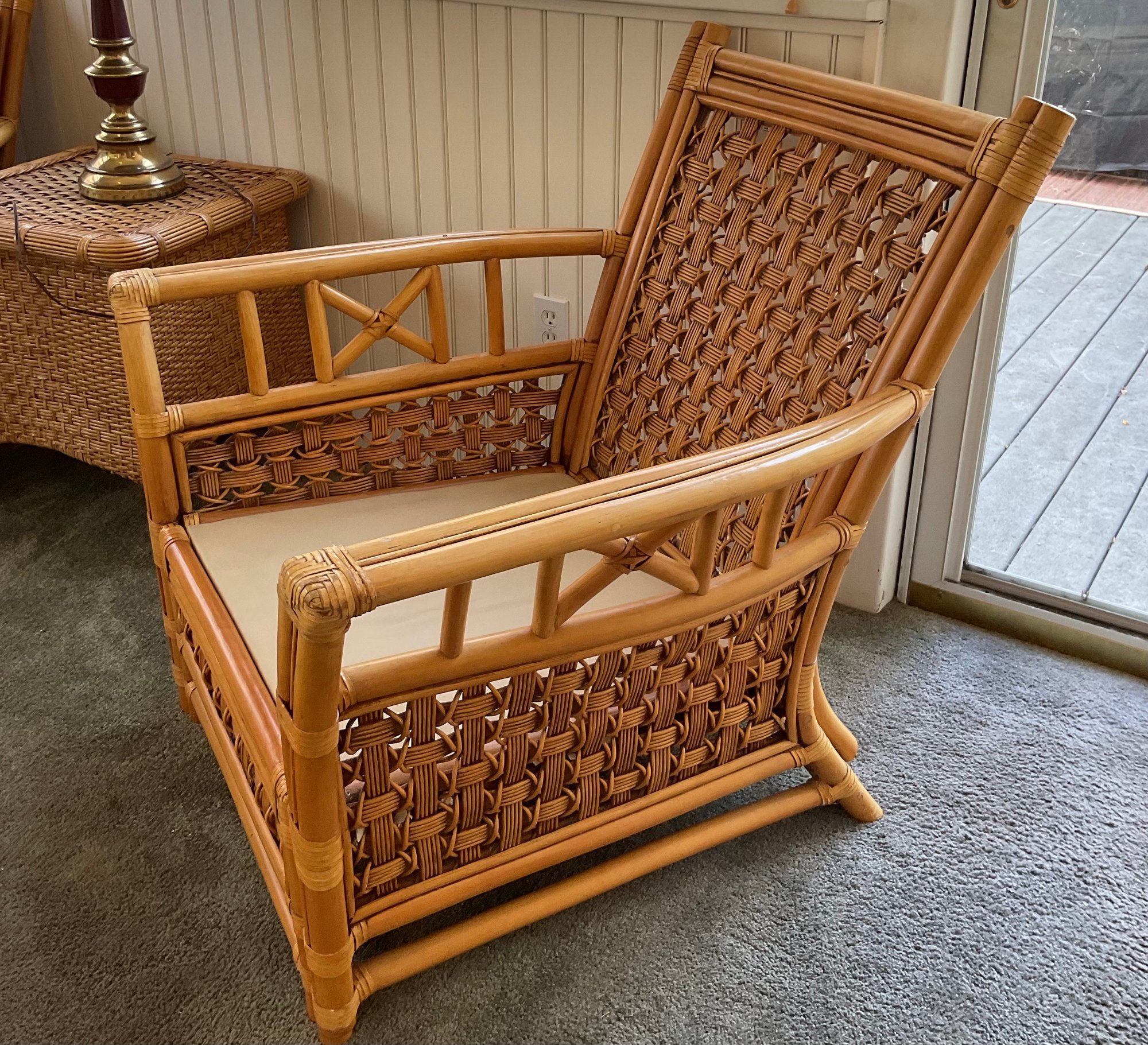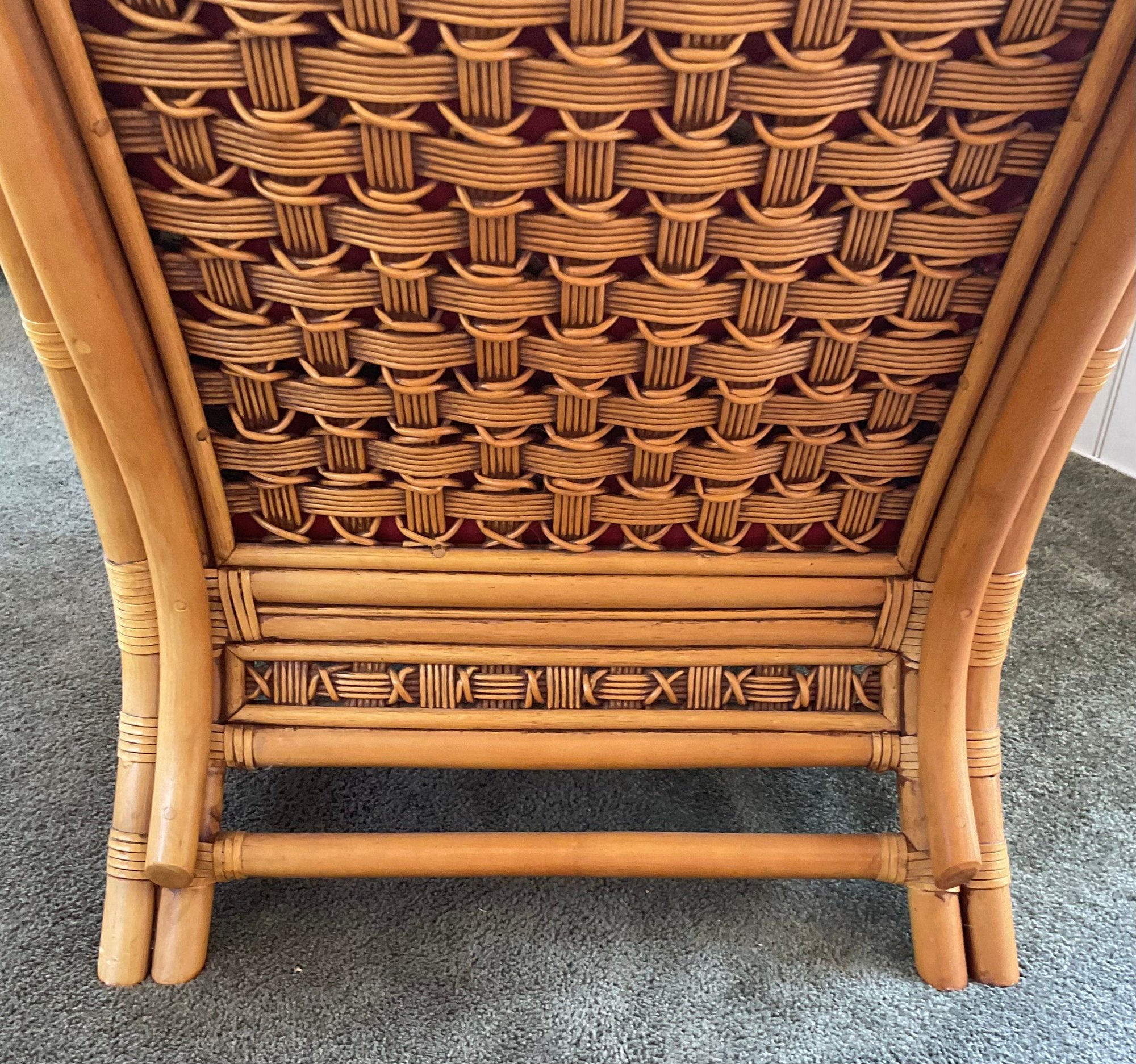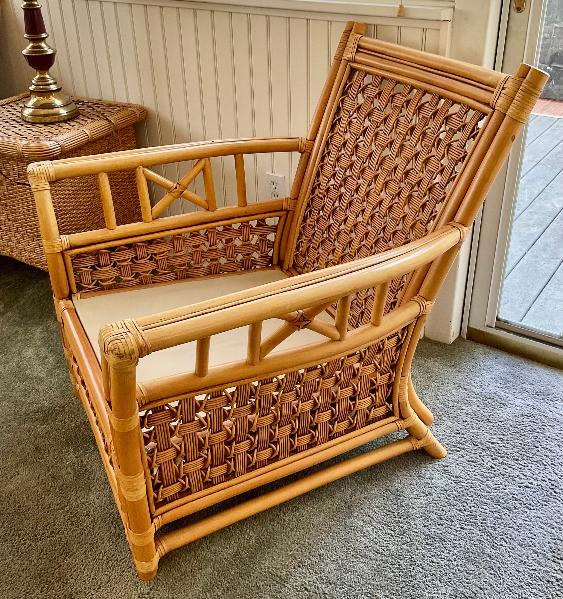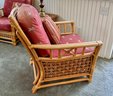 ​Condition: Excellent structural integrity. Note some sun fading to the upholstery and frame finish, characteristic of vintage rattan furniture.