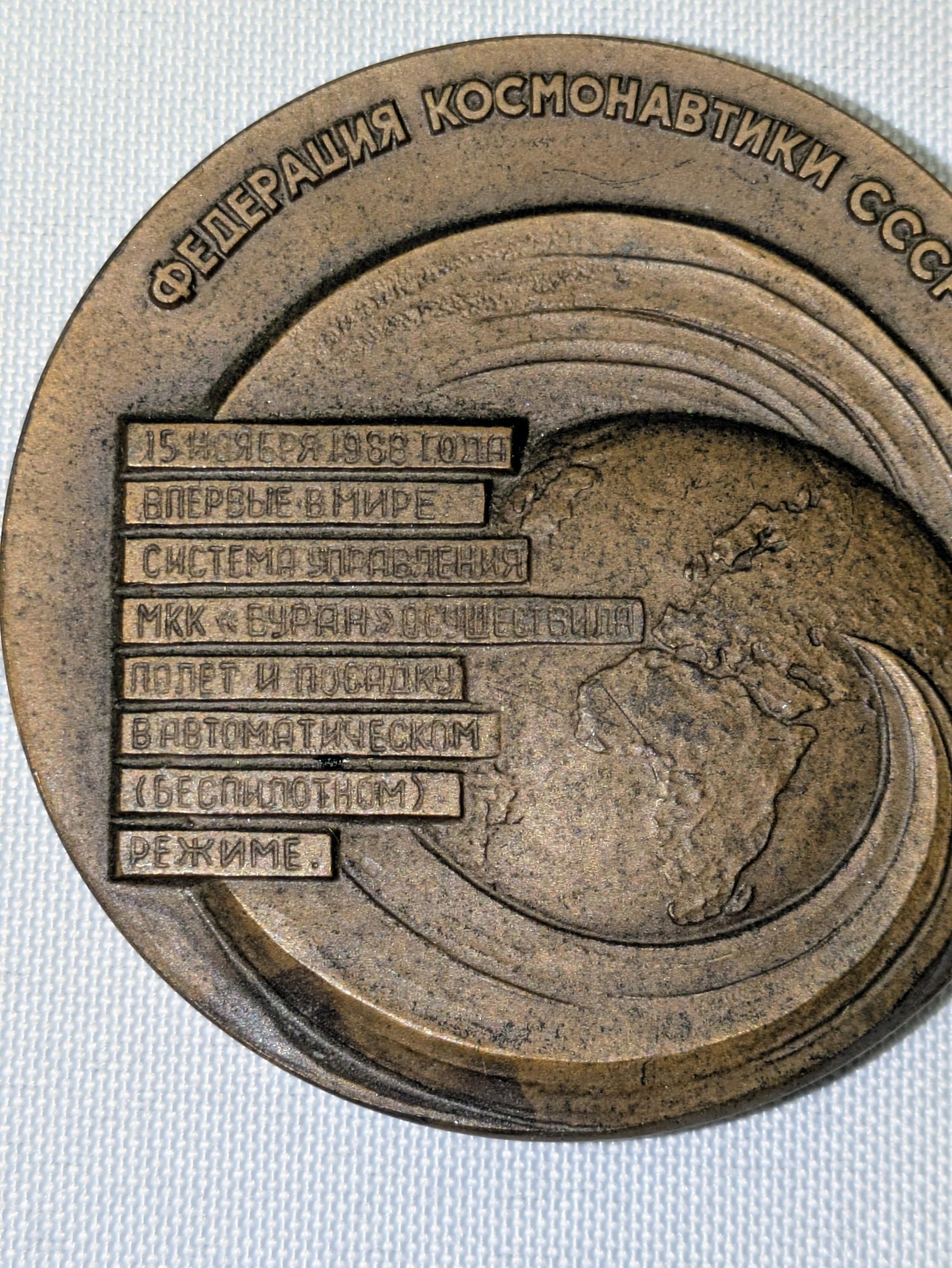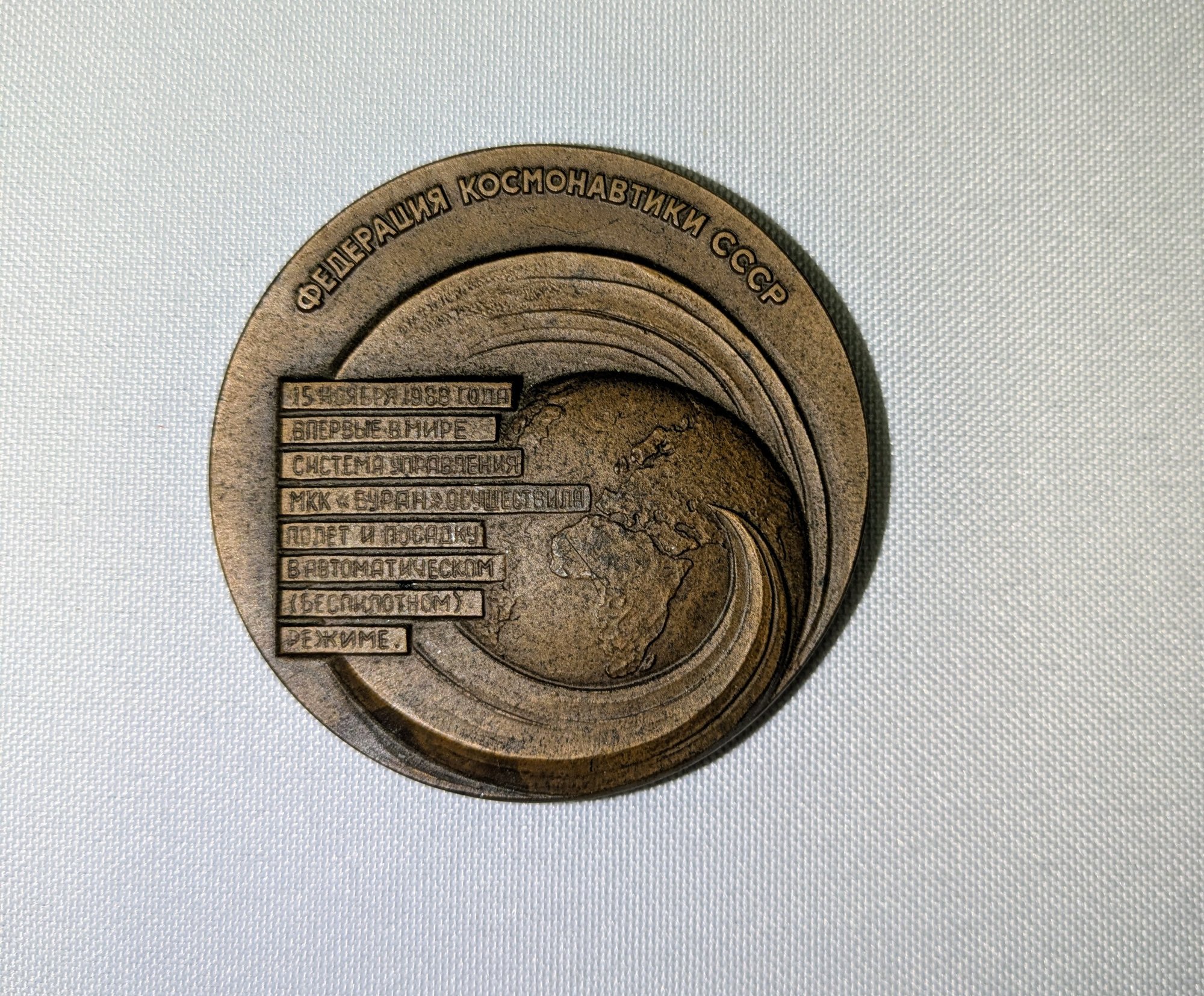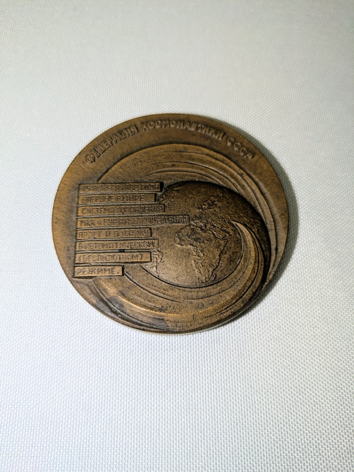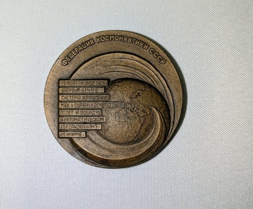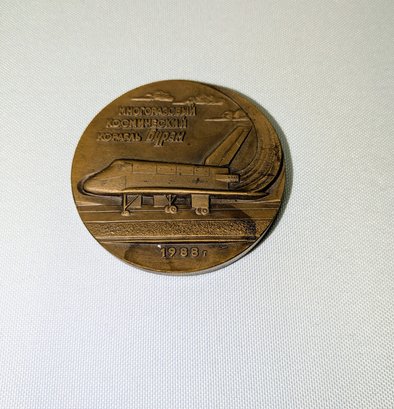 Celebrating the 1988 maiden flight and landing of the Soviet Buran reusable space craft. It was produced by the Leningrad Mint (LMD) in 1989. Some light marks are consistent with age and movement. Overall, Very Good Vintage Condition. Please see all photos as part of the description and condition. 2.5" Diam.