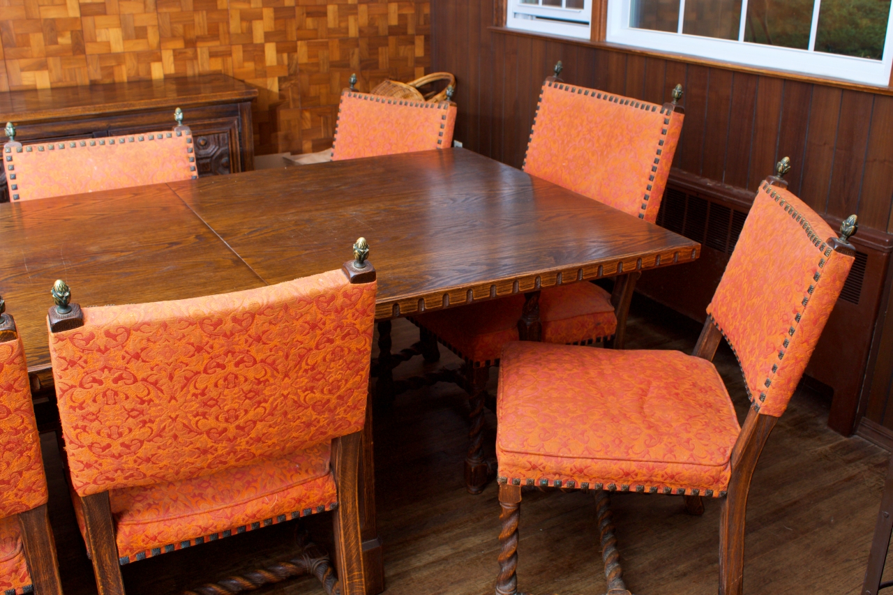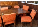 The Chairs, consisting of two arm chairs and six side chairs, in need of reupholstering. Fabric slightly worn and faded. Minor scrapes and scratches to the legs and feet for normal use.