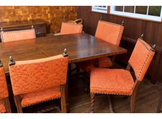 Fabulous carved oak Spanish table with two extension. Very heavy, Good condition. Some minor dinge.