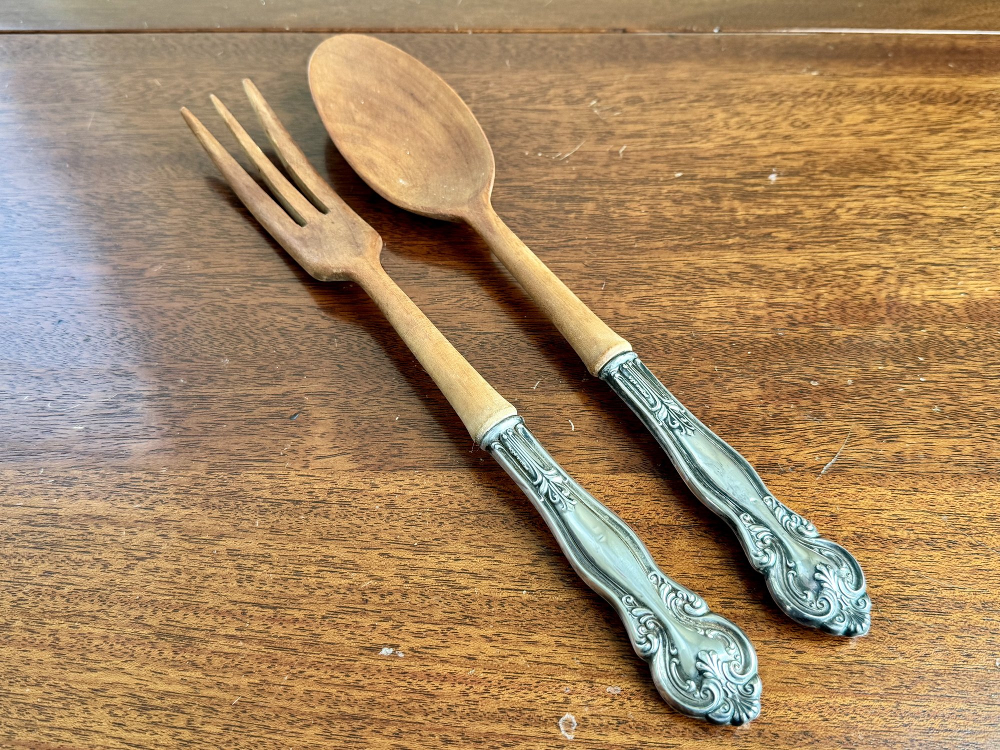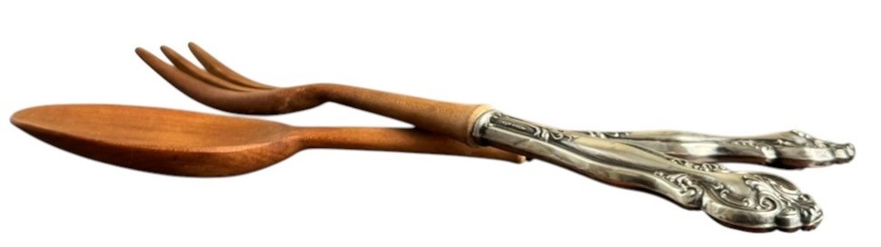 Elegant vintage salad serving set featuring carved wooden spoon and fork heads paired with ornate sterling silver handles. The handles are richly detailed with scrolling, floral-inspired motifs and are clearly marked “STERLING.” Sterling handles measure 4 inches.