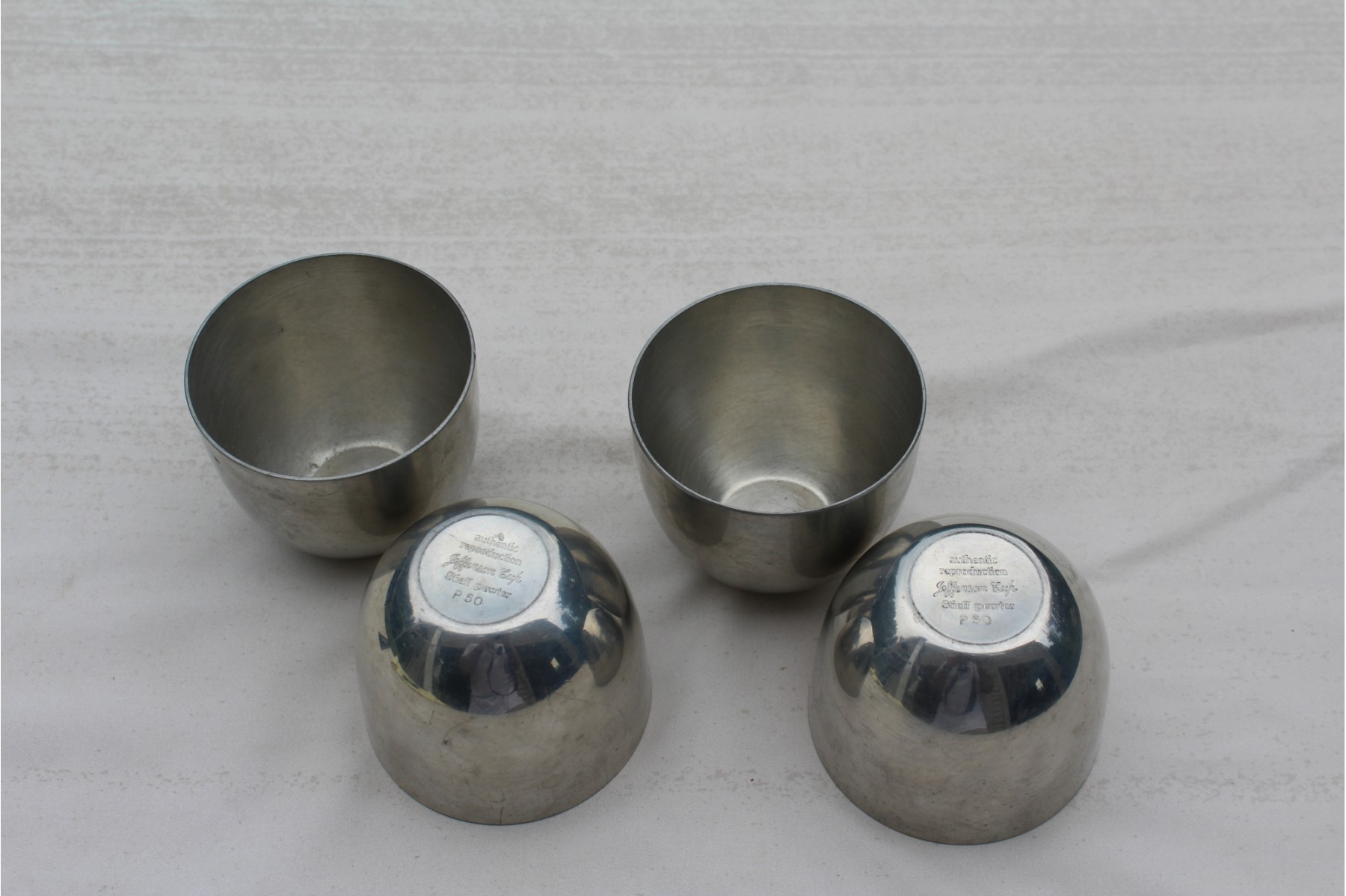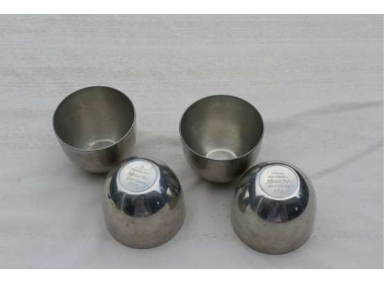 "Pewter Jefferson cups are a piece of American history! In 1806, Thomas Jefferson sent two silver cups given to him by friend and teacher, George Wythe, along with two other silver cups to Virginia silversmith, John Letelier. Jefferson's instructions were to melt the cups and make them into eight smaller cups similar to a model he'd sent along. The style was known as a tumbler - a low, round-bottomed cup popular from the 17th through 18th century." There are 4 of these here in this lot, Celebrate the history.