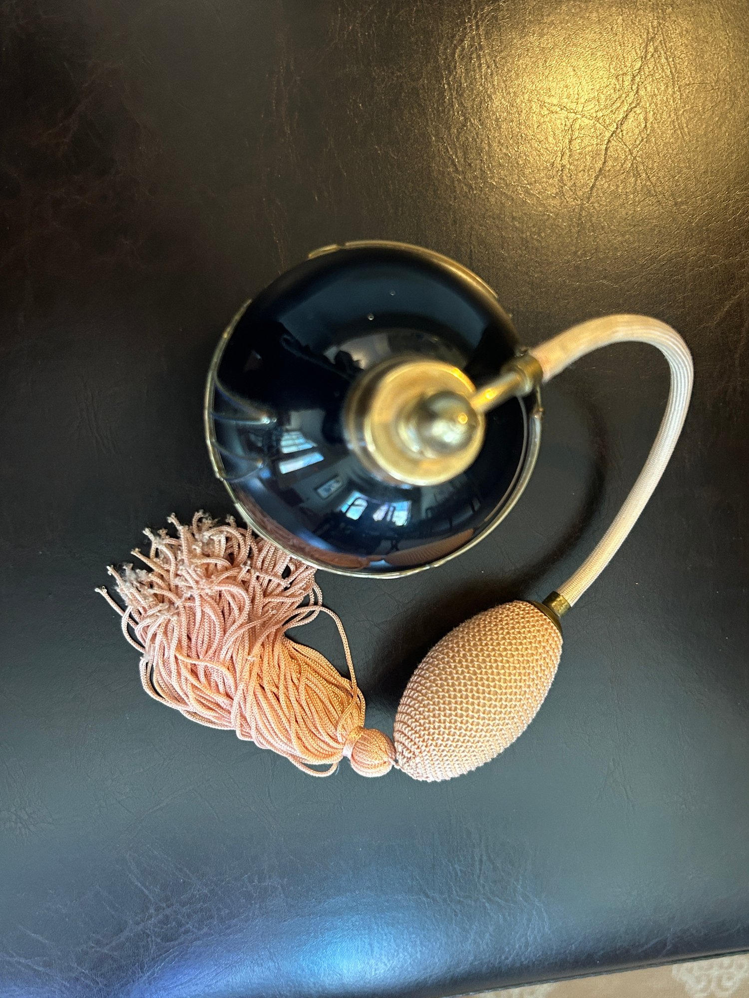 • Condition: Excellent vintage condition; no visible chips or cracks. The glass retains a high-gloss, reflective finish. (Please see photos for detail on hardware patina and atomizer cord).