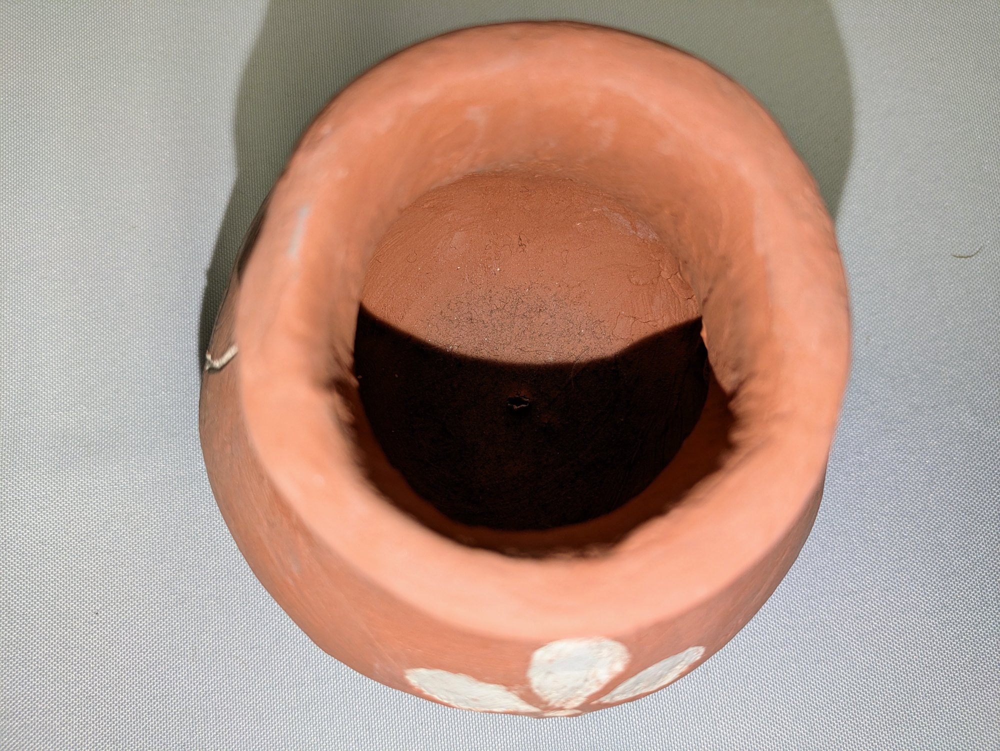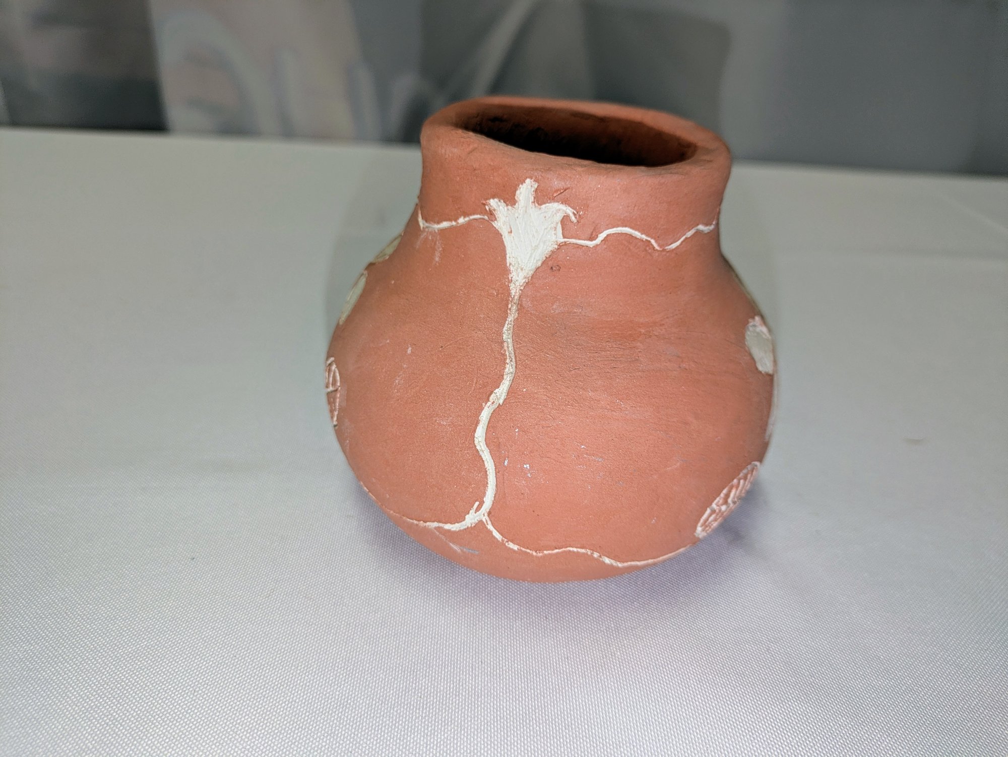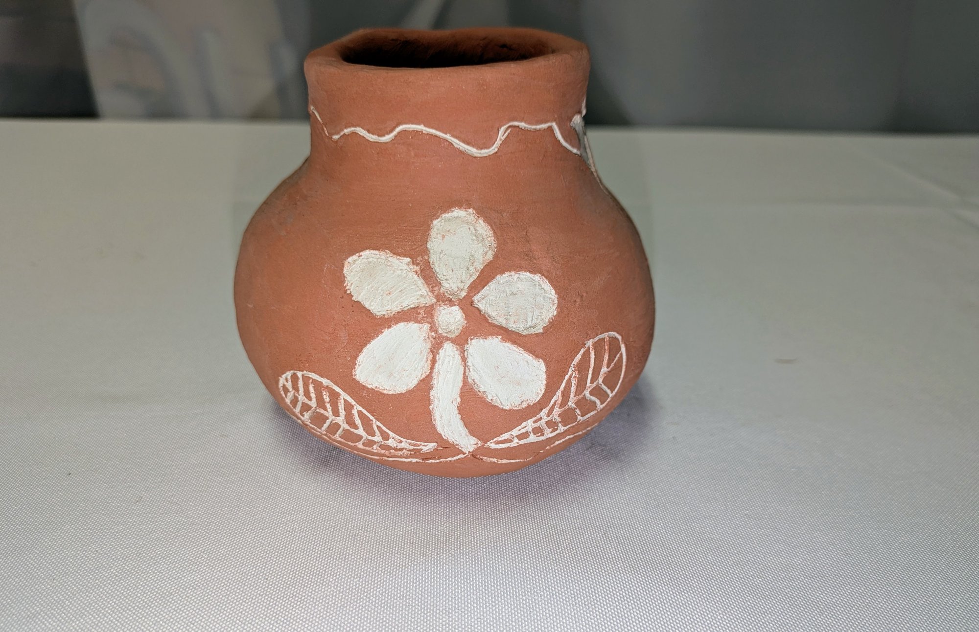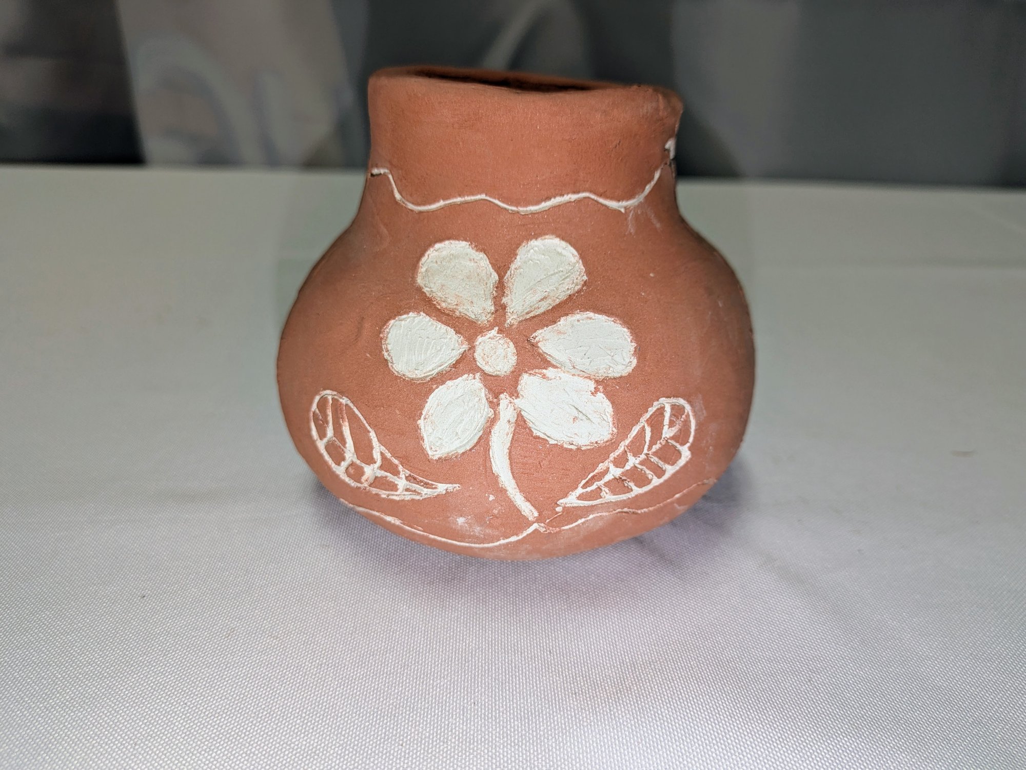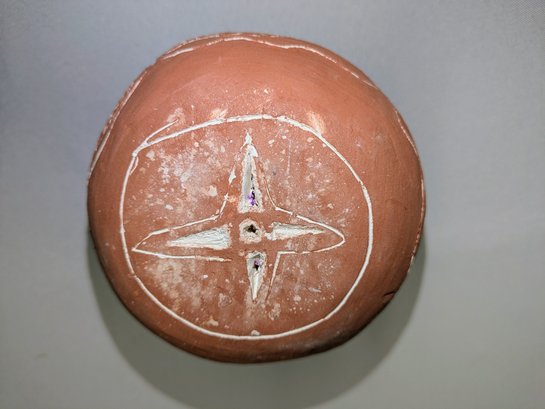 Beautiful Design, Features White Flower Design Accents. Some light marks are consistent with age and movement. Overall, Very Good Vintage Condition. Please see all photos as part of the description and condition. 4.25"H x 4.25" Diam.
