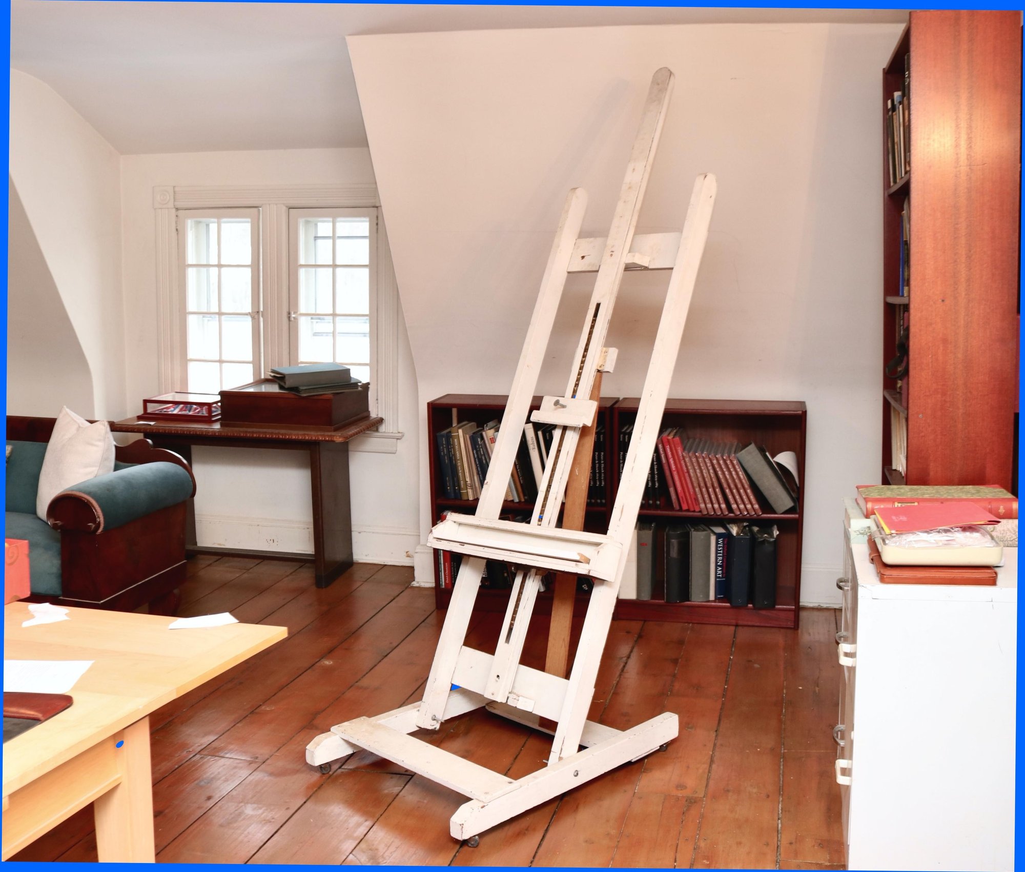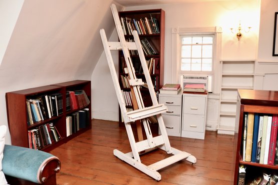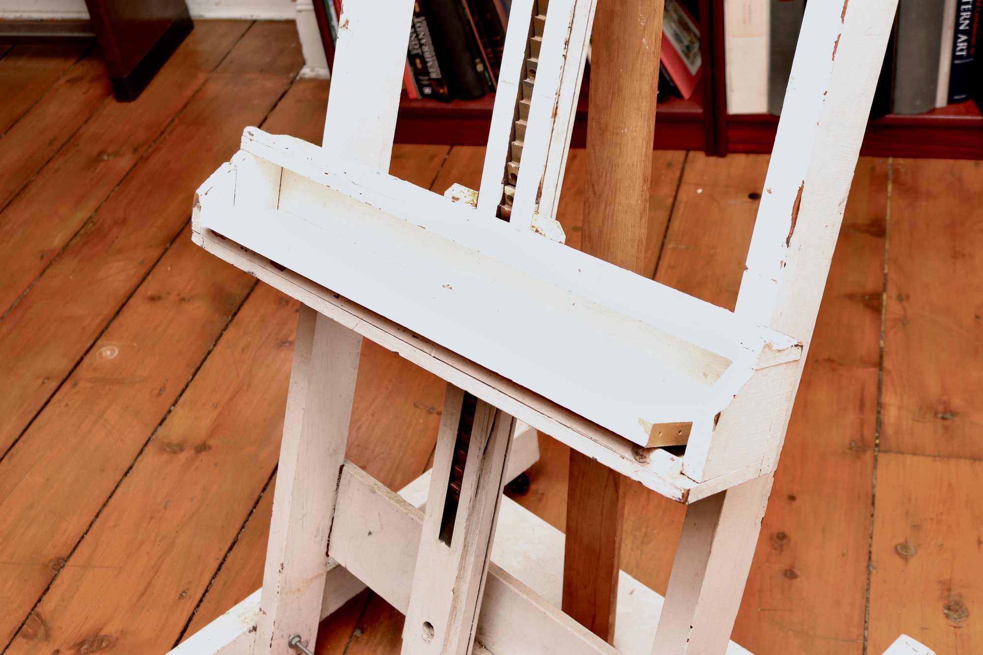 Substantial studio floor easel crafted in hardwood and later painted white, featuring an adjustable center mast, sliding canvas support ledge, and tilt capability for vertical or angled working positions. The wide H-form base is fitted with casters for easy movement around a studio. Classic utilitarian construction with exposed bolts and wood braces typical of 20th-century art-school or atelier equipment. Ideal for large canvases, display, or decorative studio staging.
