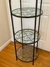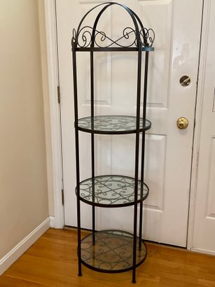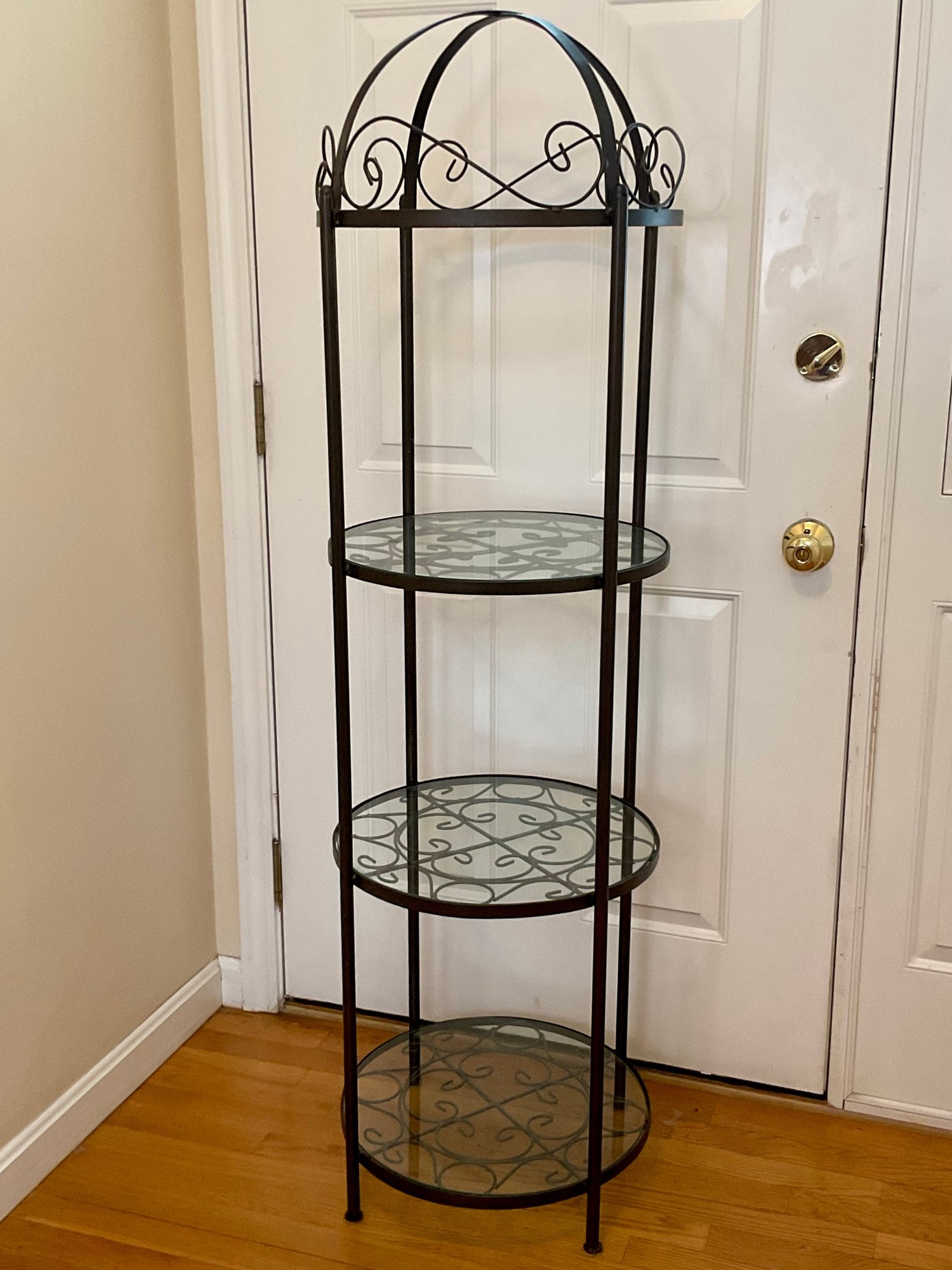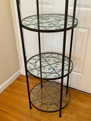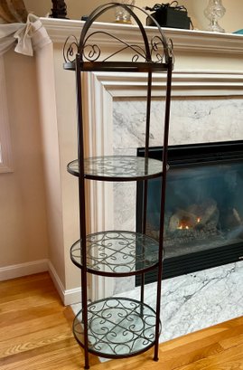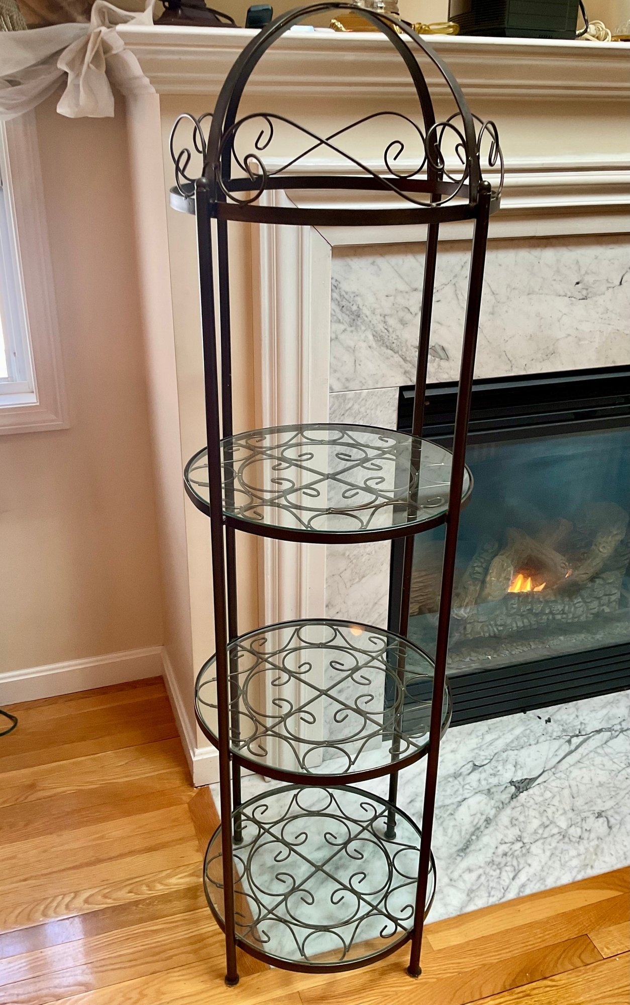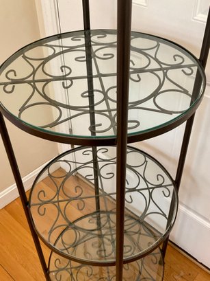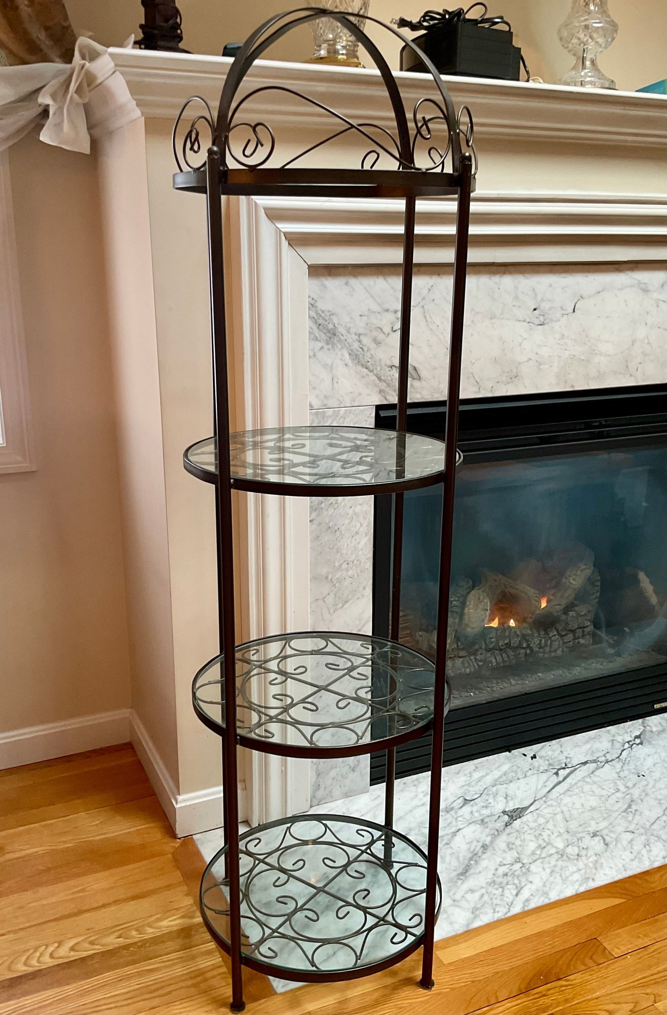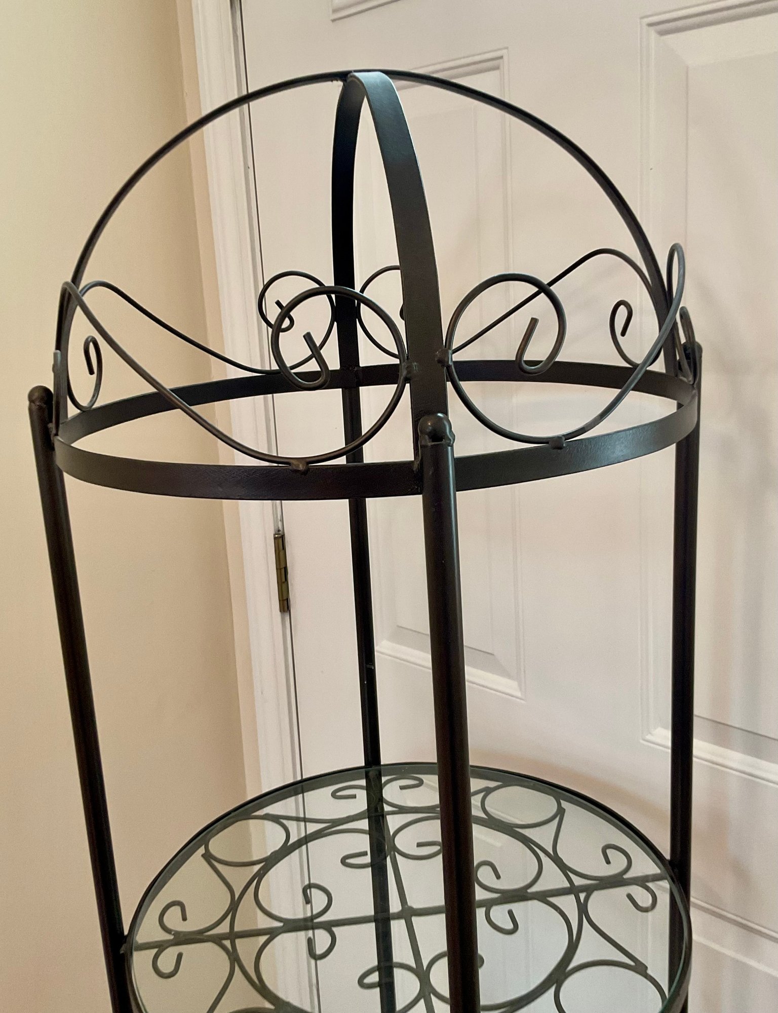 3-tier etagere, featuring a sturdy black wrought iron frame with a decorative arched dome top and scrollwork detailing. Each of the three circular levels features a tempered glass shelf over an ornate metal scroll pattern, offering both durability and a sophisticated aesthetic.