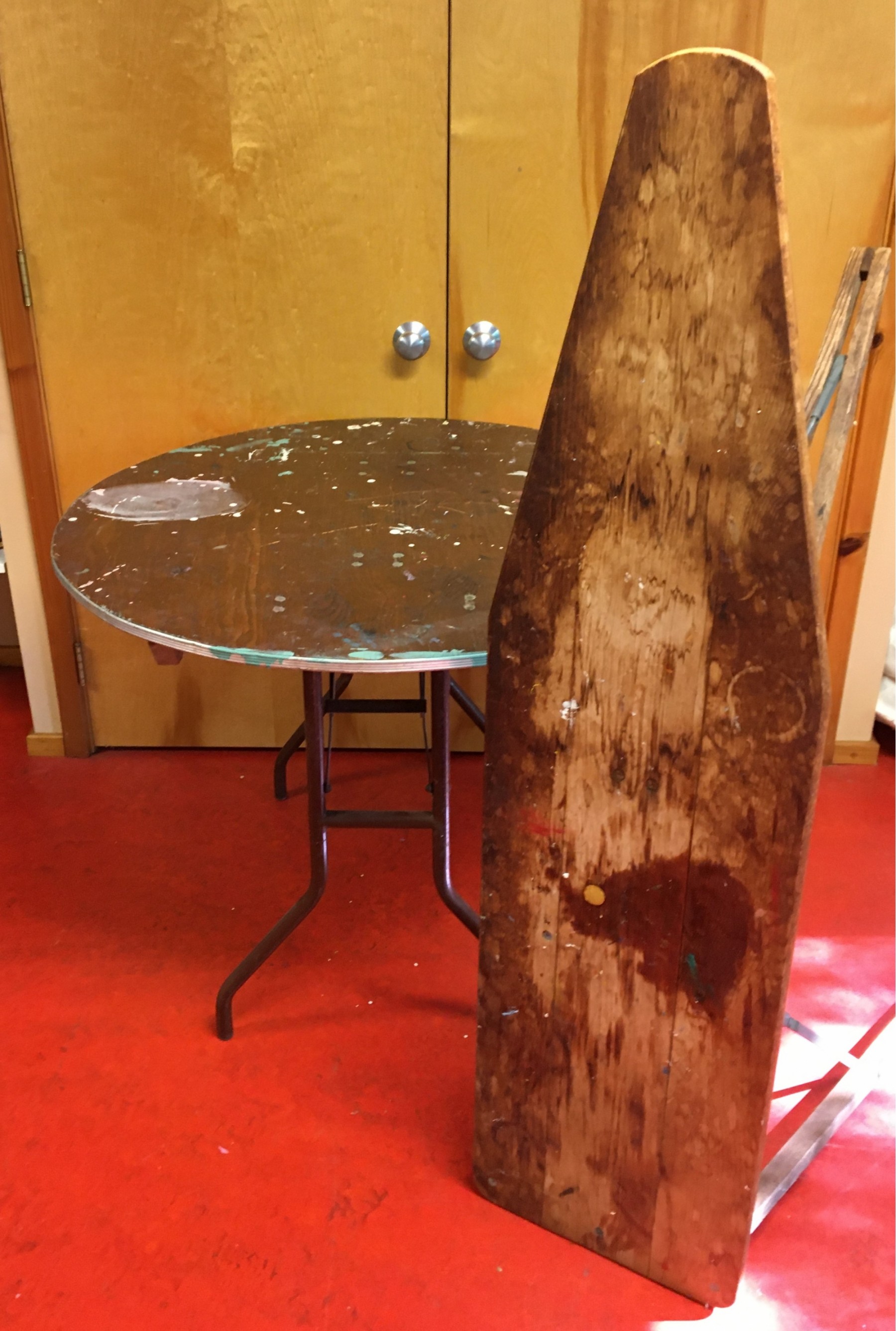 One paint-splattered round, vintage folding table and one fabulous antique wooden folding ironing board, both repurposed as artist's tables. They're great work surfaces for creating arts and crafts.