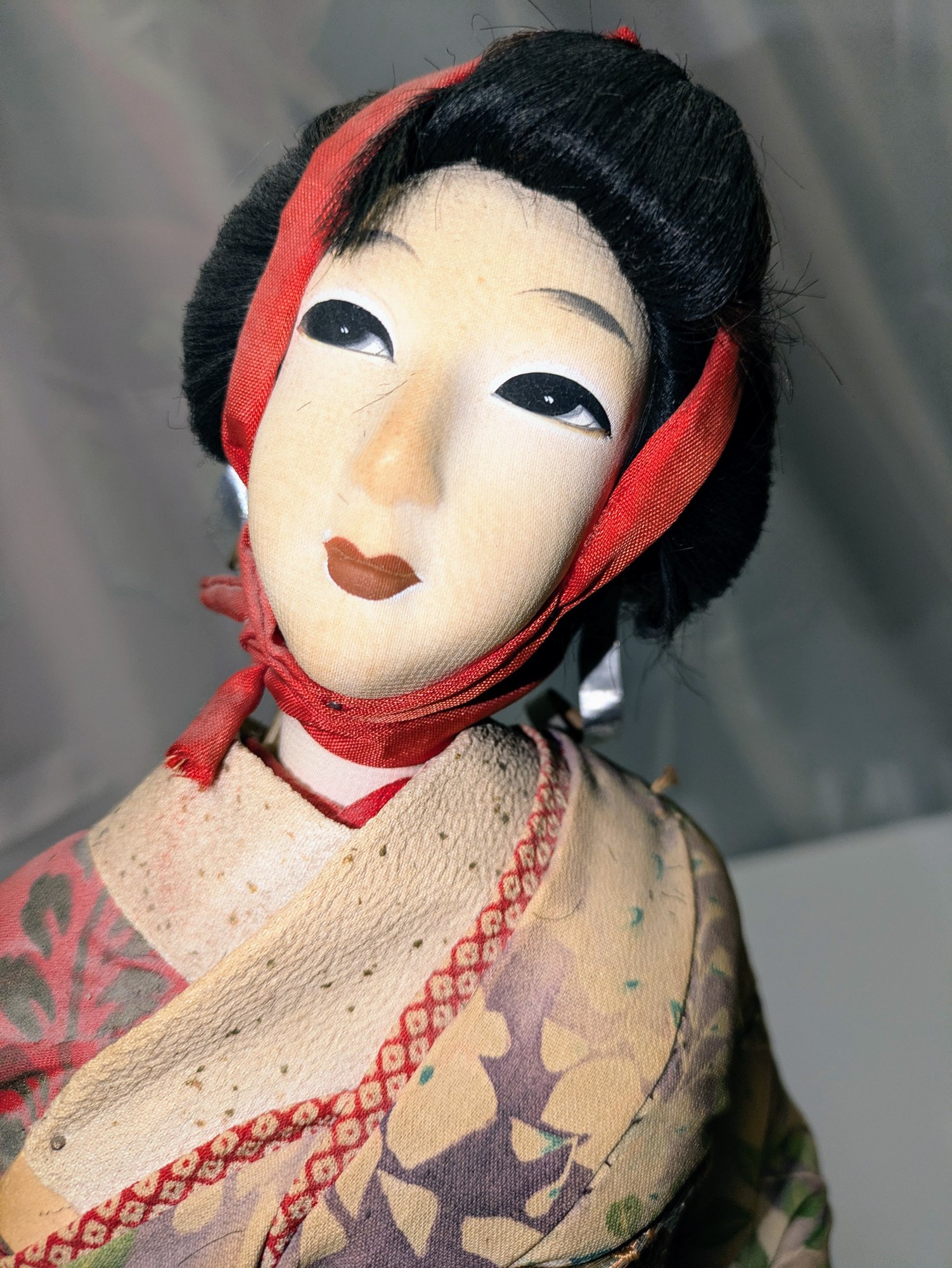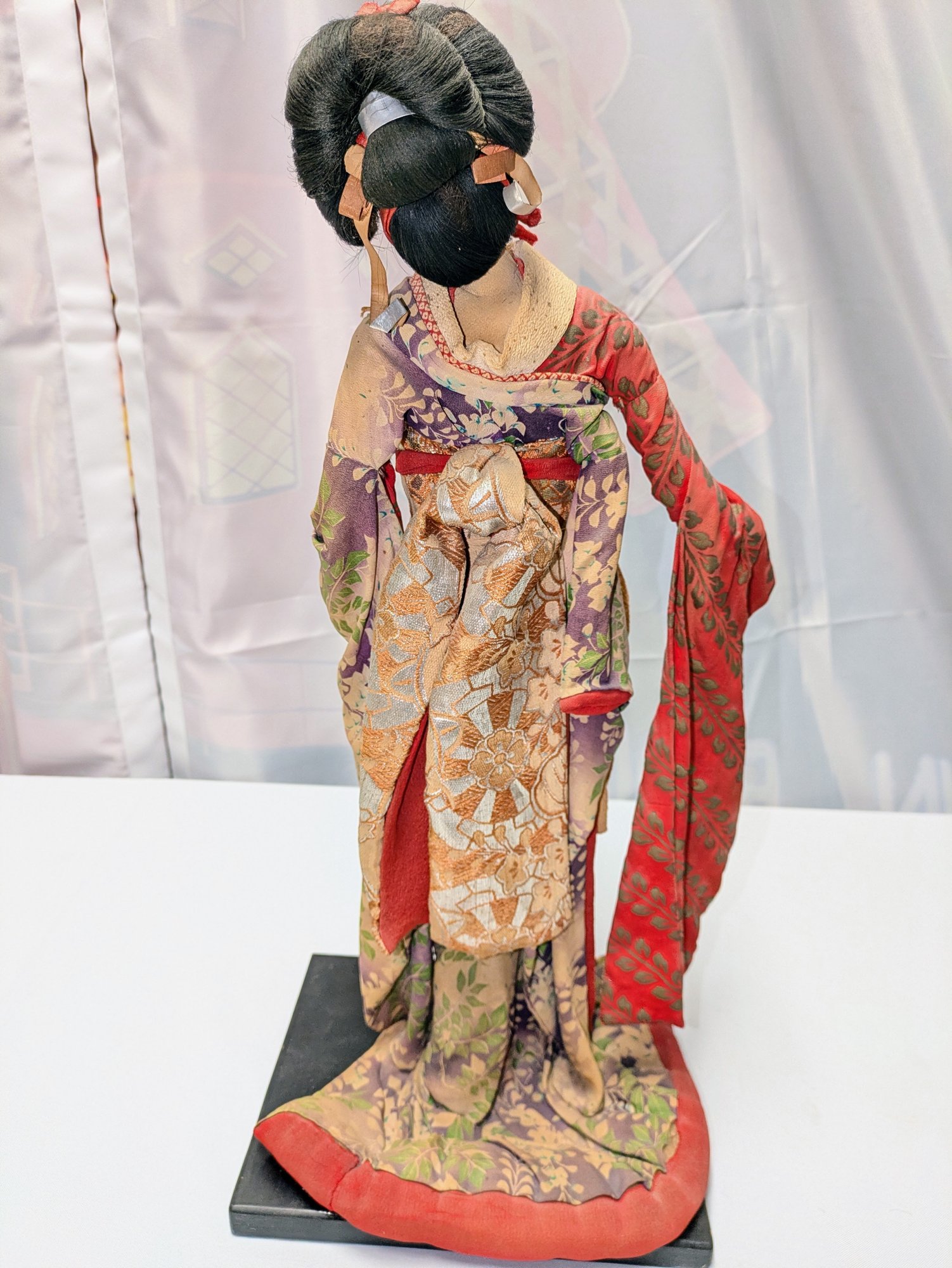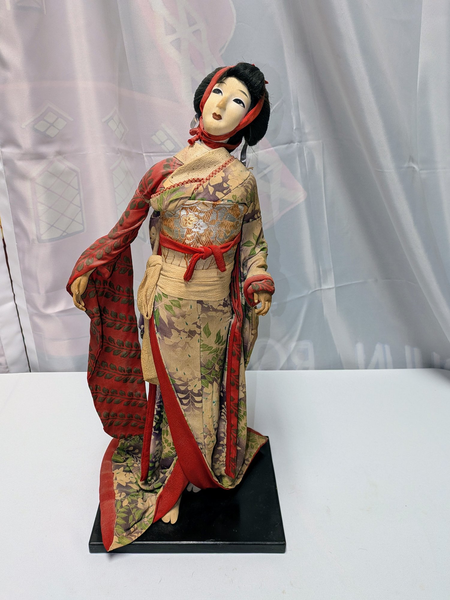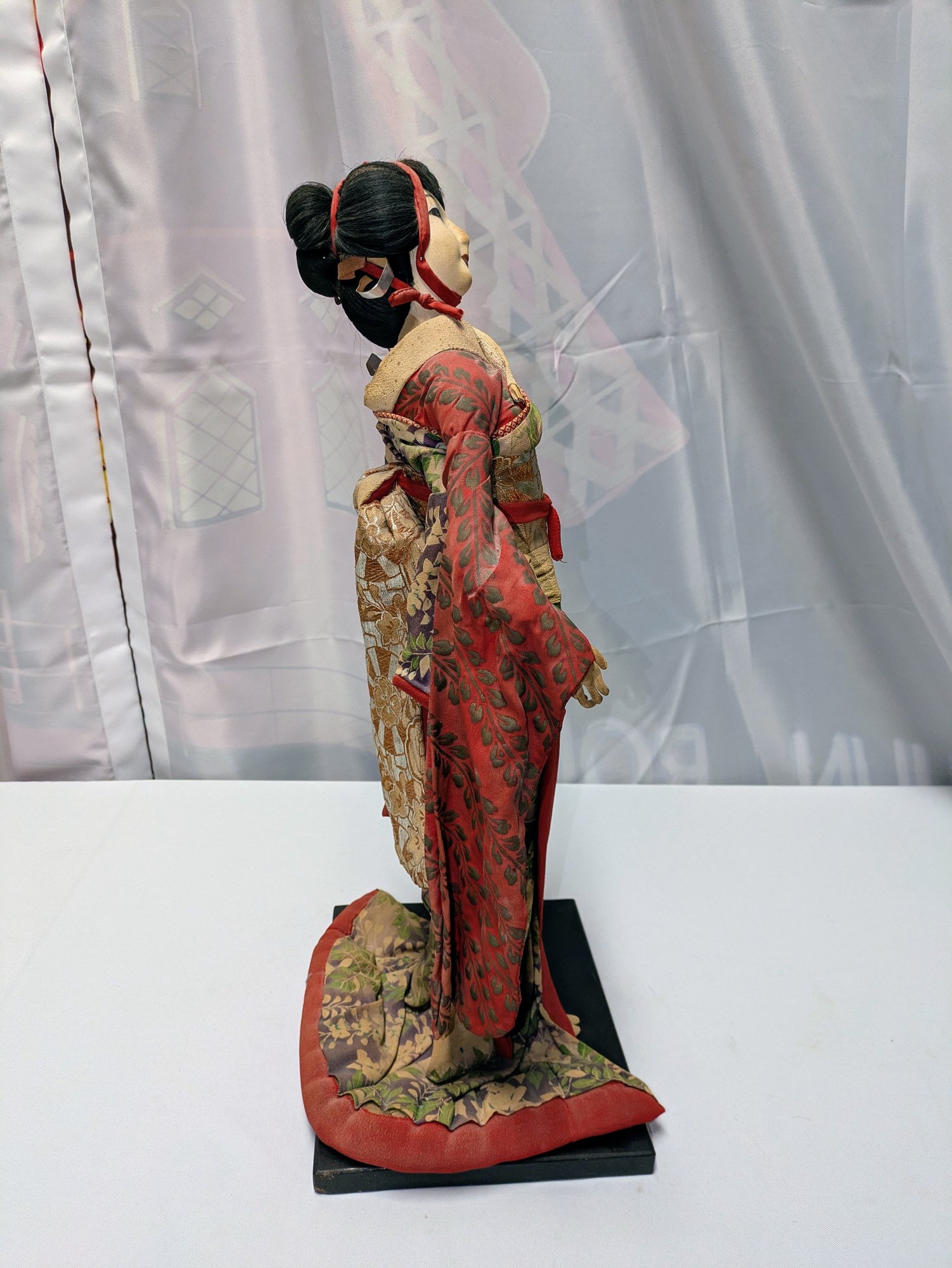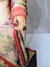 Stunning Detailing and Design. Made of Fabric, Featuring Beautiful traditional attire. Needs some dusting off. Some light discoloration on the face and hands, and light marks on the base, consistent with age and use. Overall, Very Good Vintage Condition. Please see all photos as part of the description and condition. 22"H / 8" x 9.5" Base