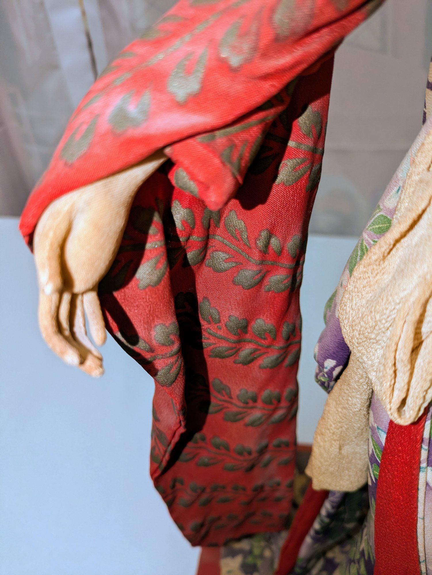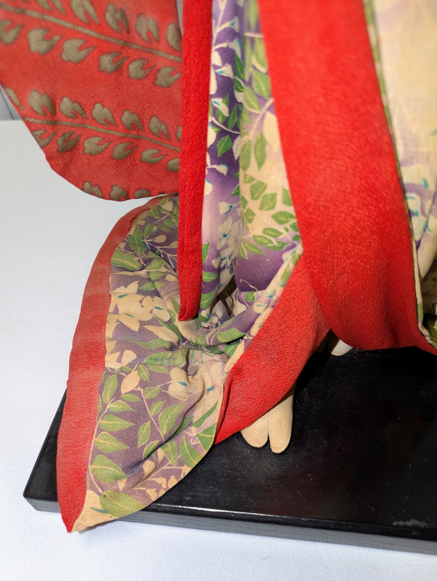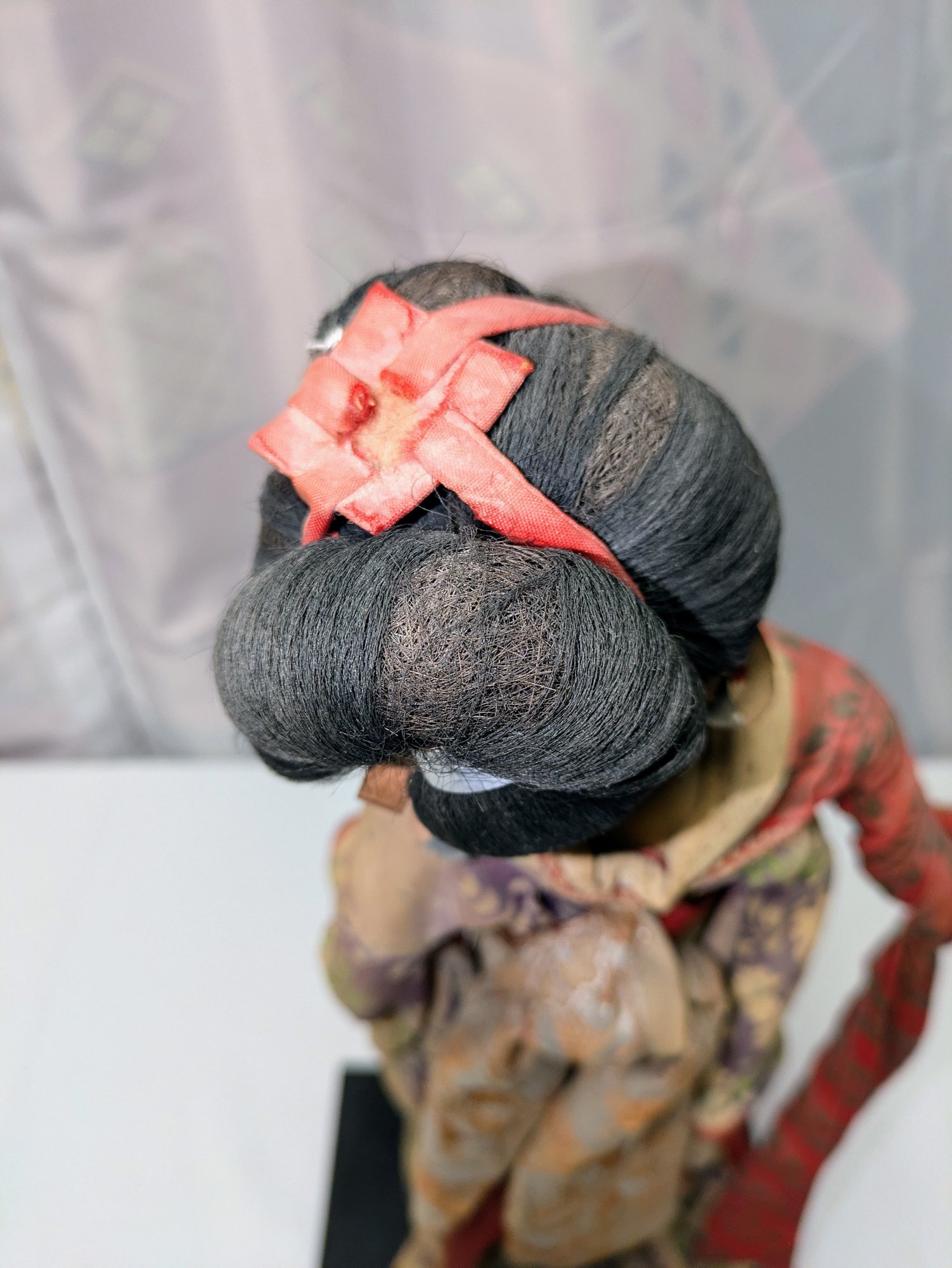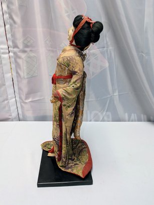 Stunning Detailing and Design. Made of Fabric, Featuring Beautiful traditional attire. Needs some dusting off. Some light discoloration on the face and hands, and light marks on the base, consistent with age and use. Overall, Very Good Vintage Condition. Please see all photos as part of the description and condition. 22"H / 8" x 9.5" Base