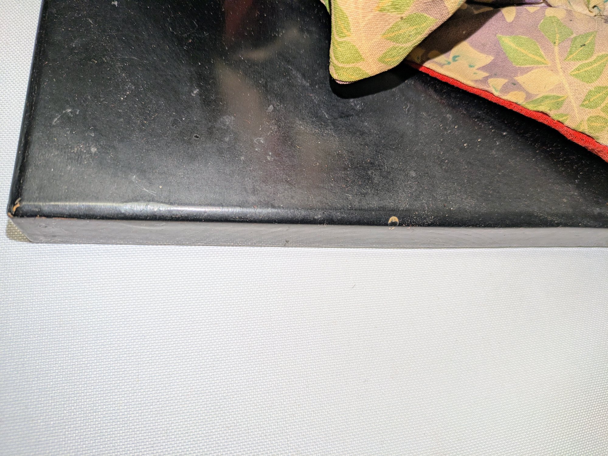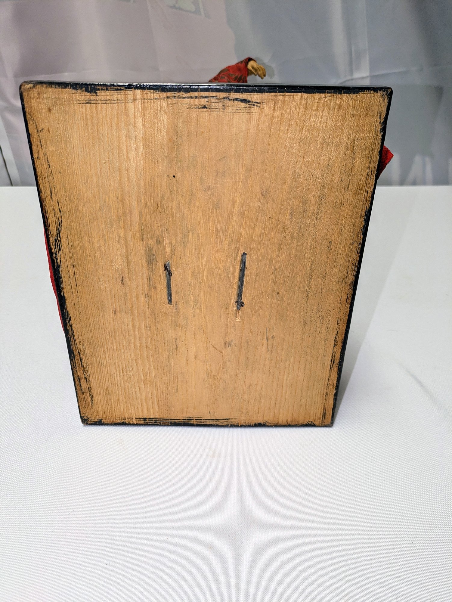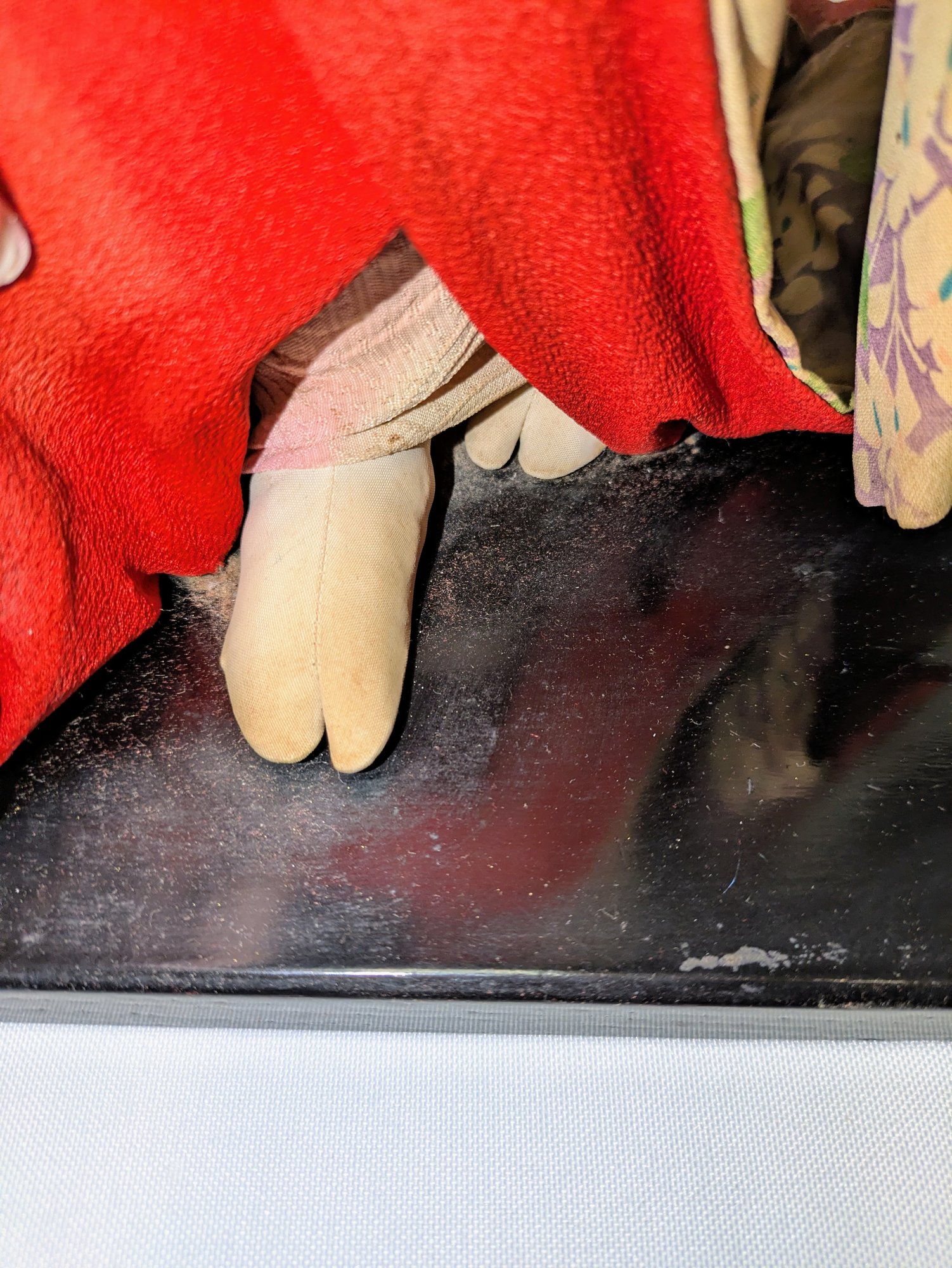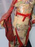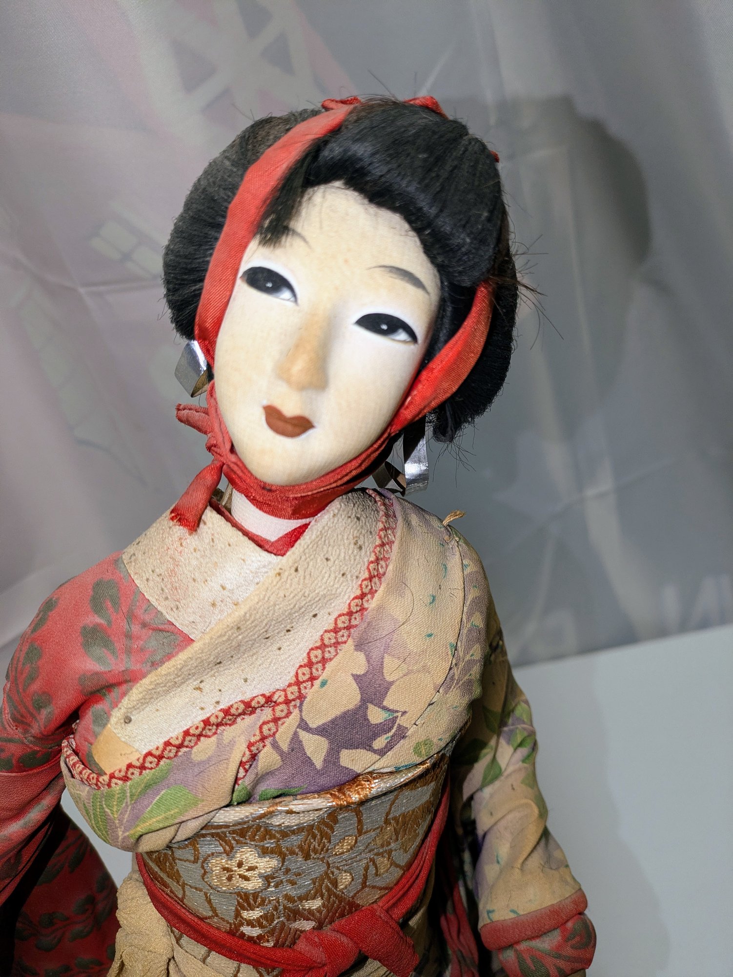 Stunning Detailing and Design. Made of Fabric, Featuring Beautiful traditional attire. Needs some dusting off. Some light discoloration on the face and hands, and light marks on the base, consistent with age and use. Overall, Very Good Vintage Condition. Please see all photos as part of the description and condition. 22"H / 8" x 9.5" Base