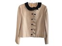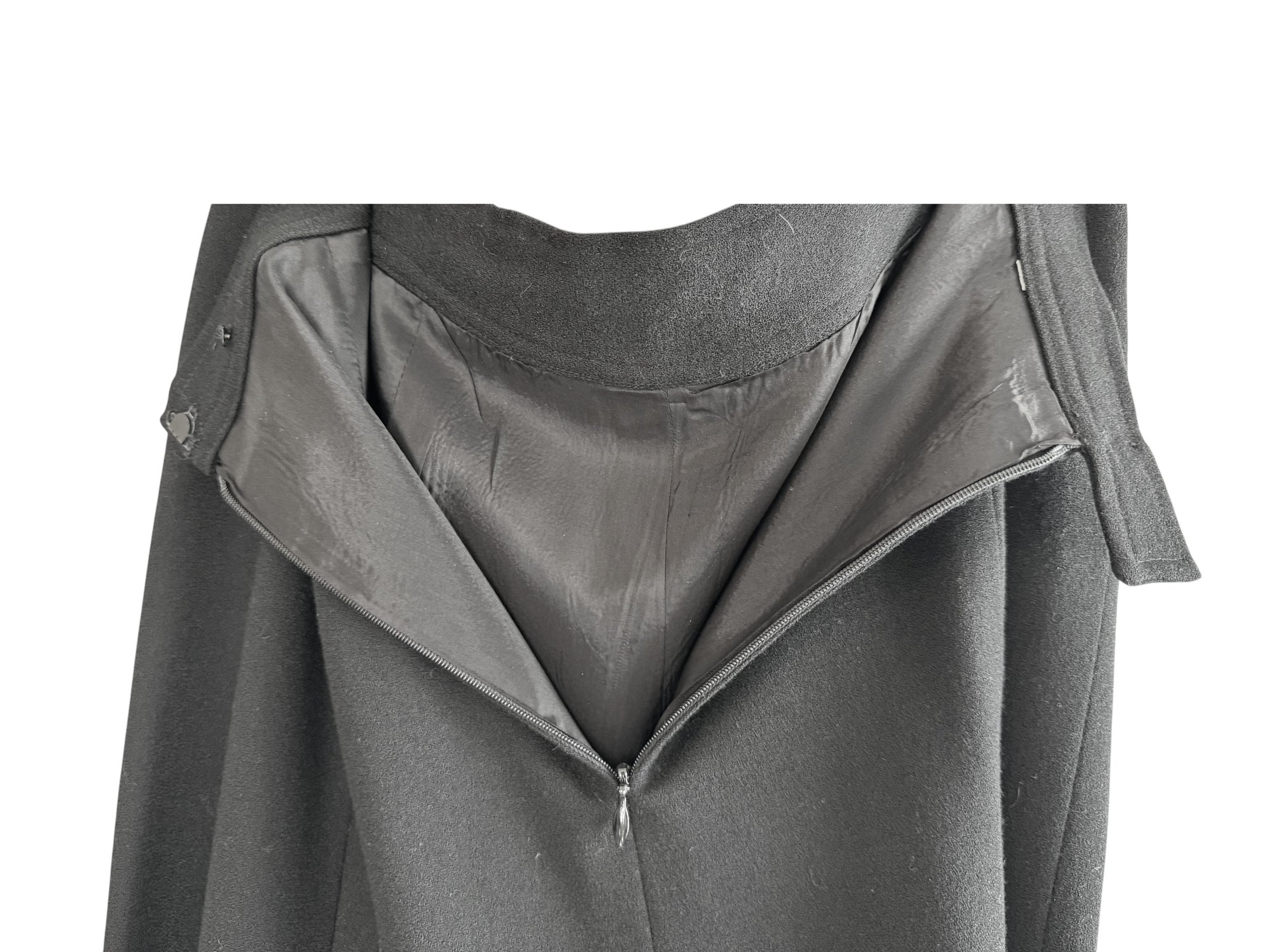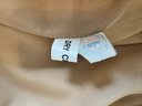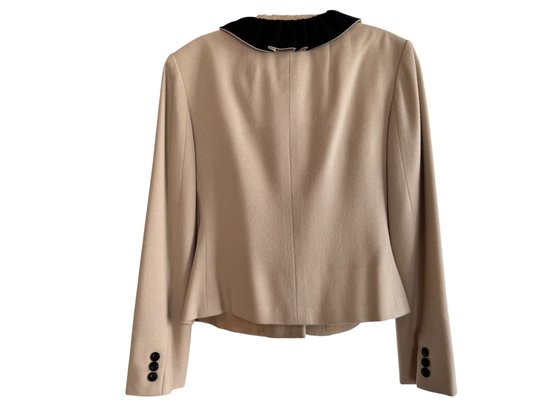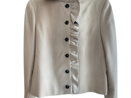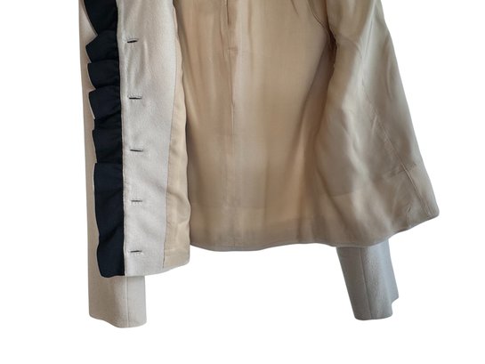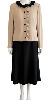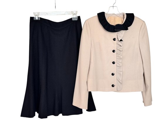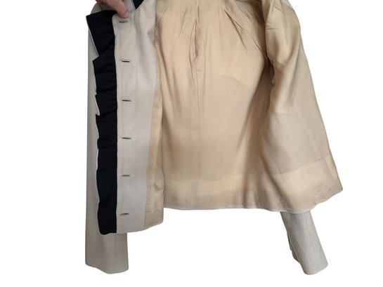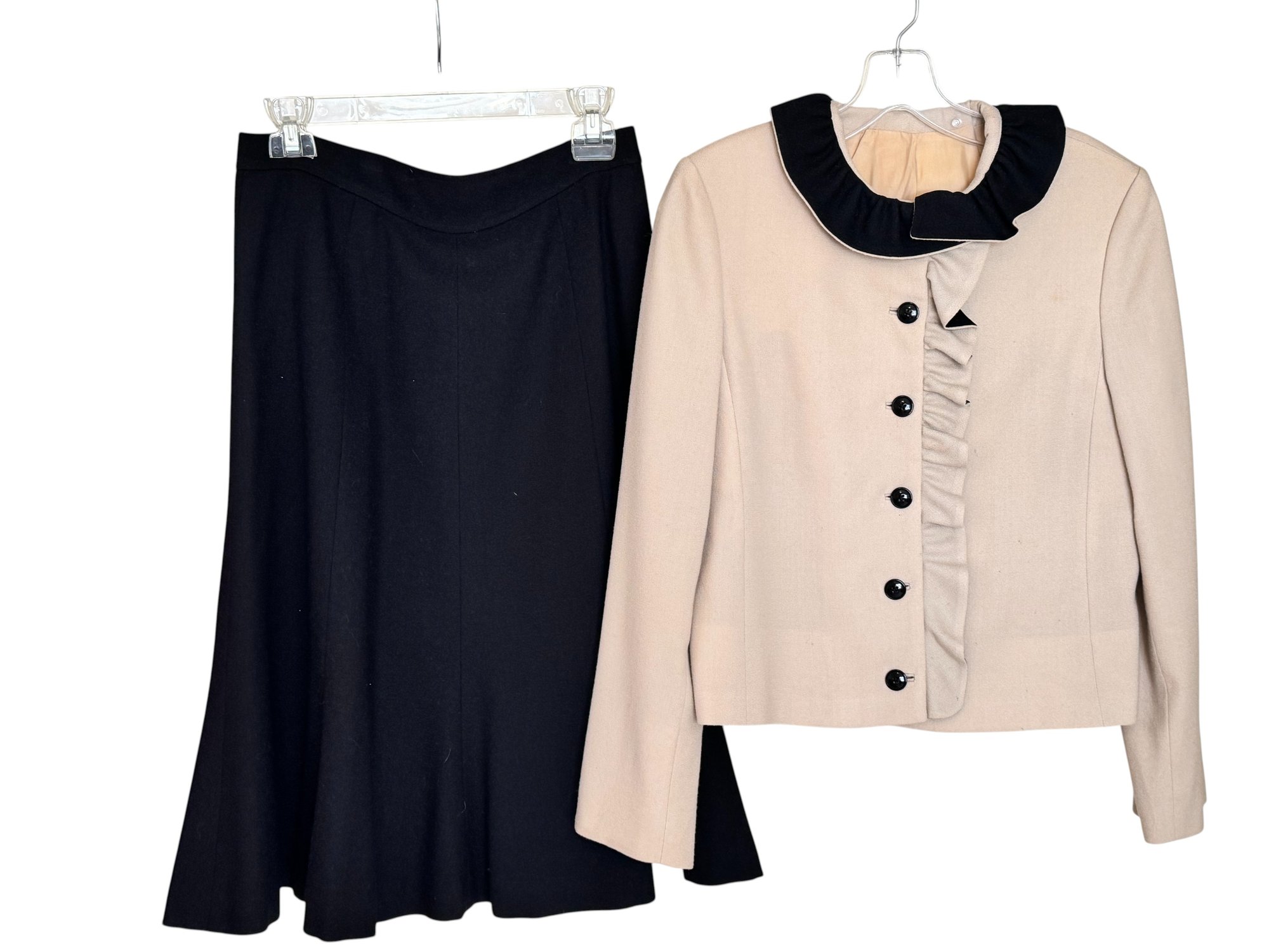 There are no tags in the items, but feels like wool blend crepe. Minor spots on the left side of jacket, both pieces fully lined, and made in USA.