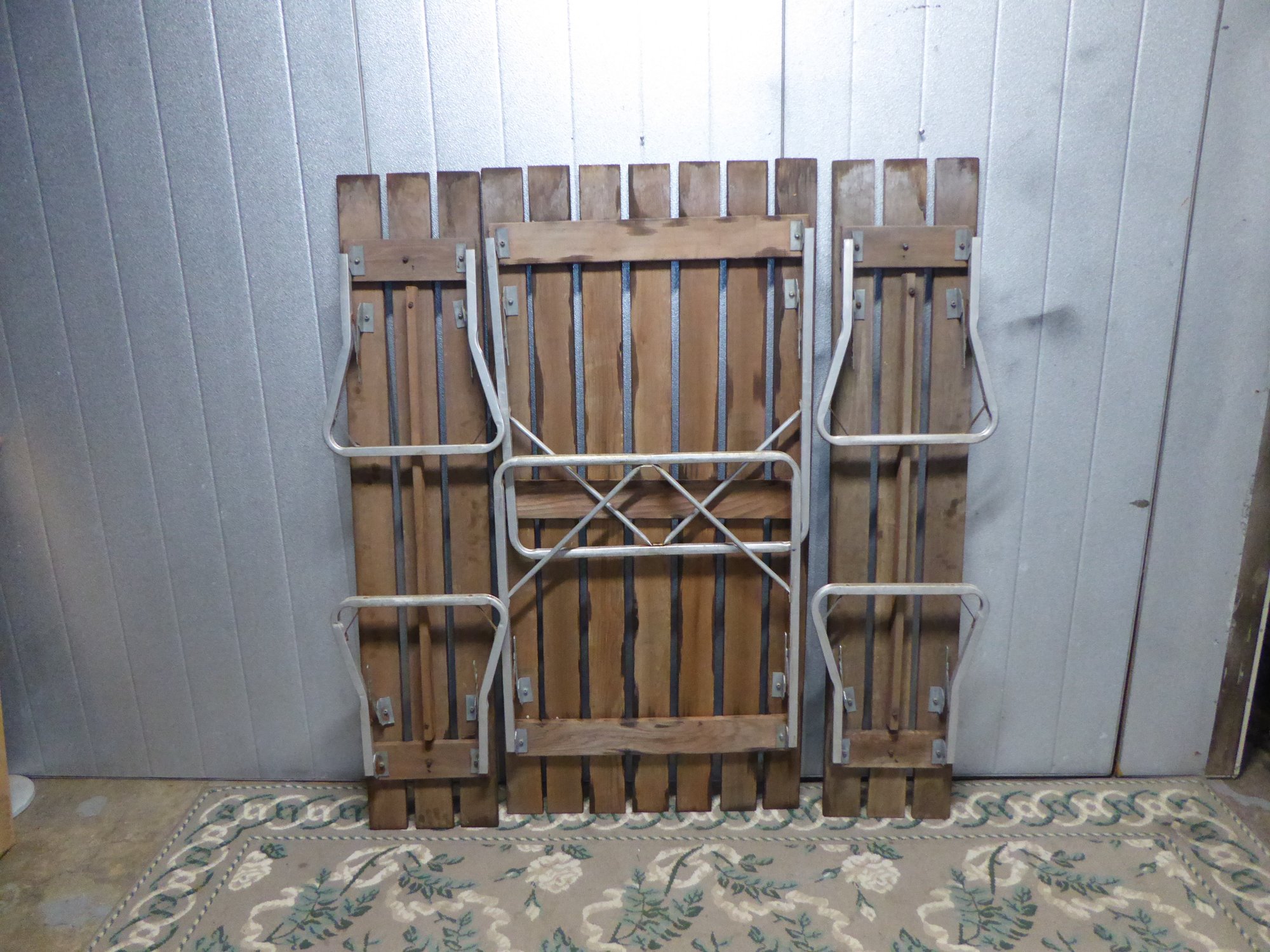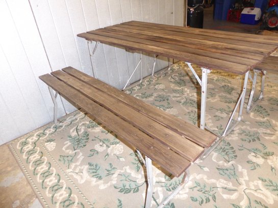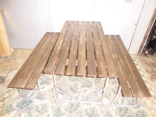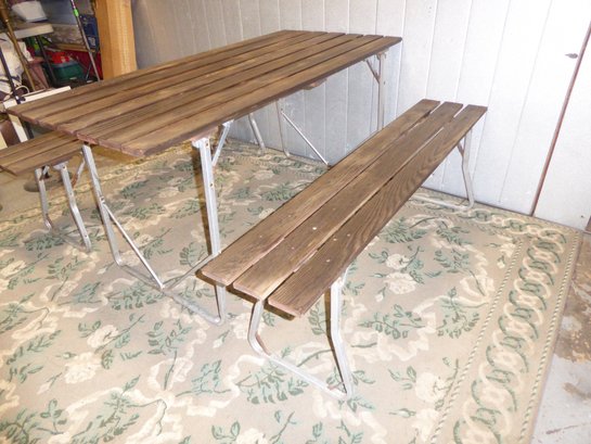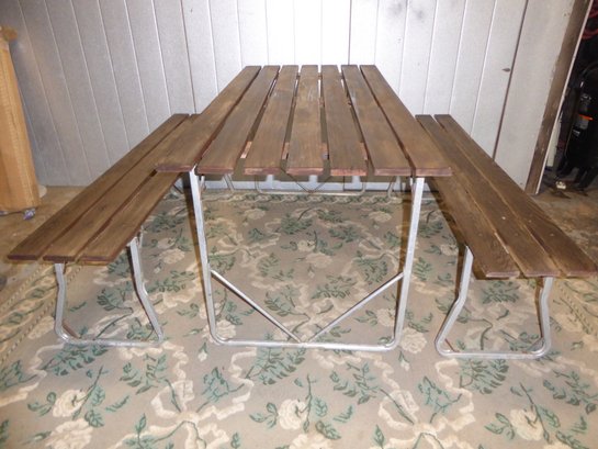 Vintage Teak Or Cedar And Aluminum Folding Picnic Table And 2 Benches