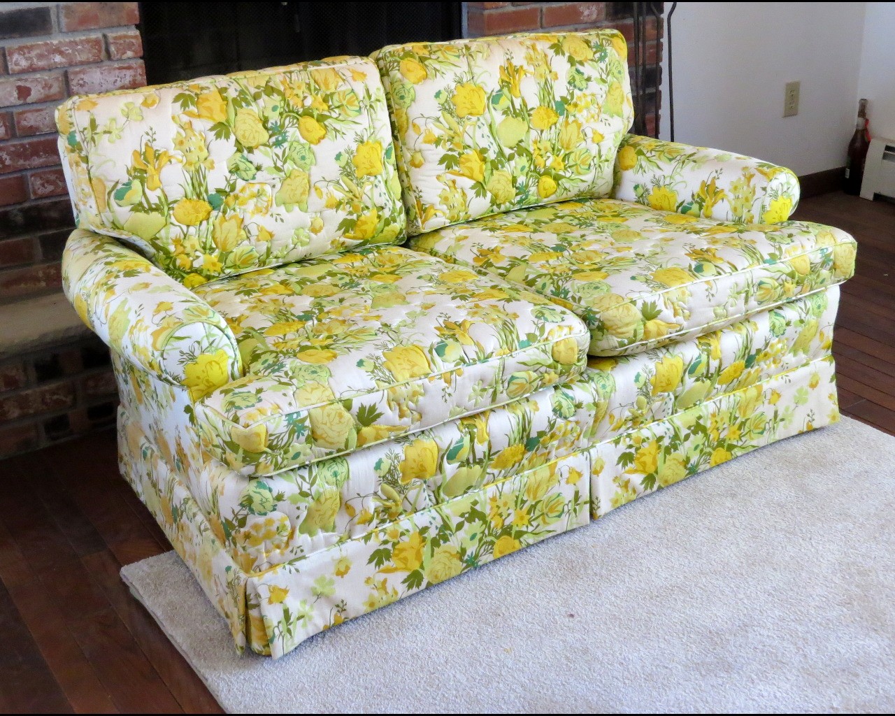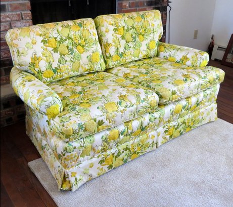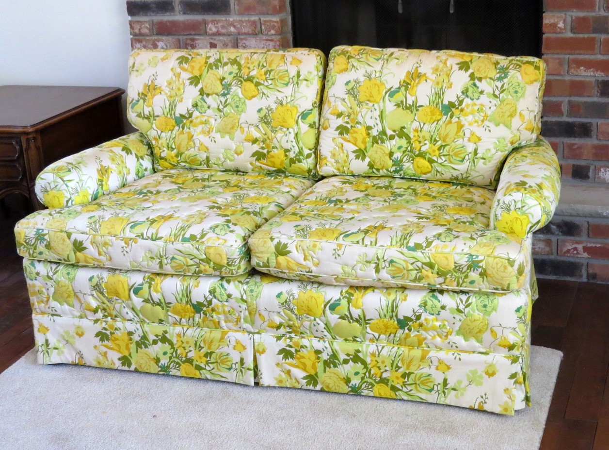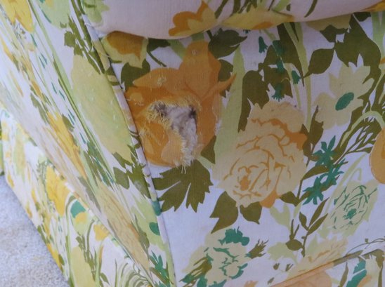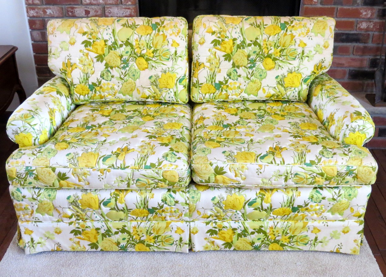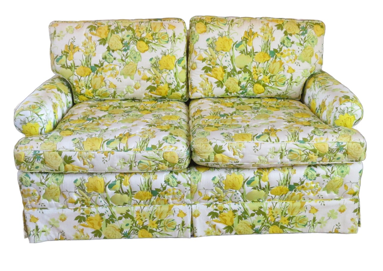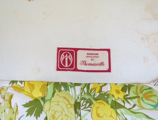 A vintage Thomasville, NC made love seat in a wild 1970's era yellow daisies pattern, 57" wide, 30" height at back, about 36" deep overall. Overall decent condition, there was an incident with a glass of wine a couple of decades ago, thus the staining , the back and seat cushions are zip outs so they got saved by the washing machine at the time. You can't see it with the cushions on top. One tear underside of arm, back corner edge as shown can be resewn or otherwise just ignored, its at the back.