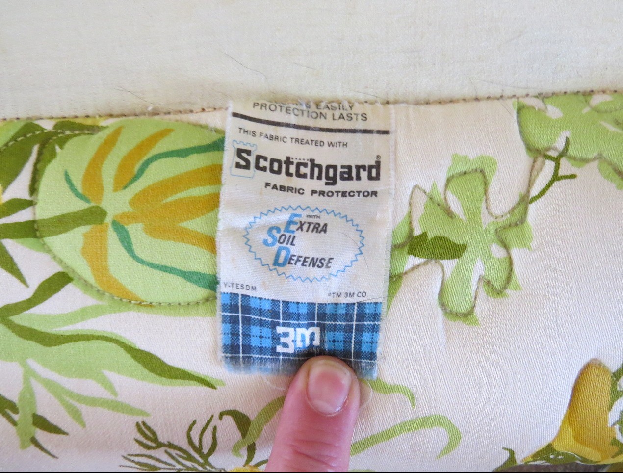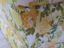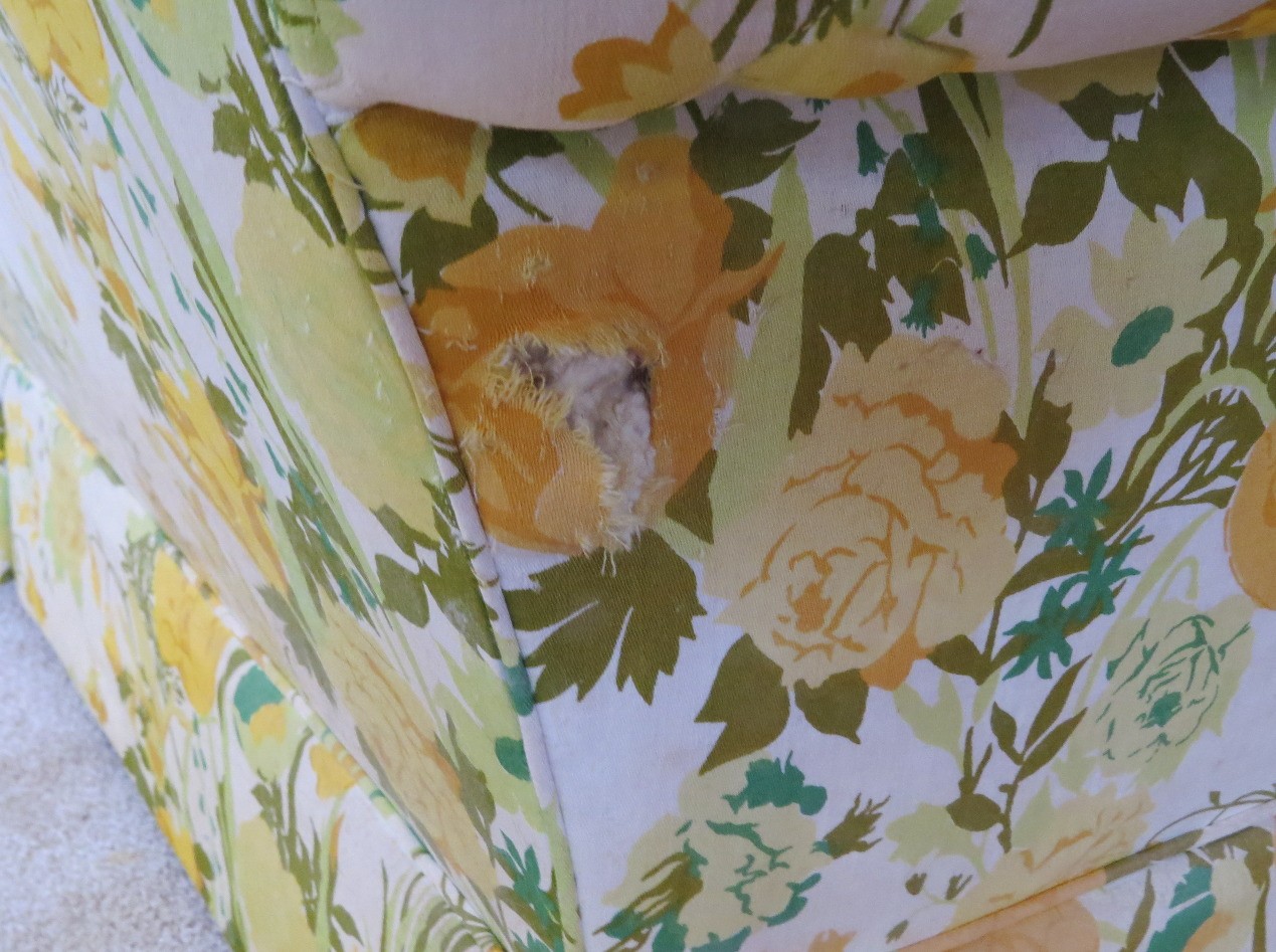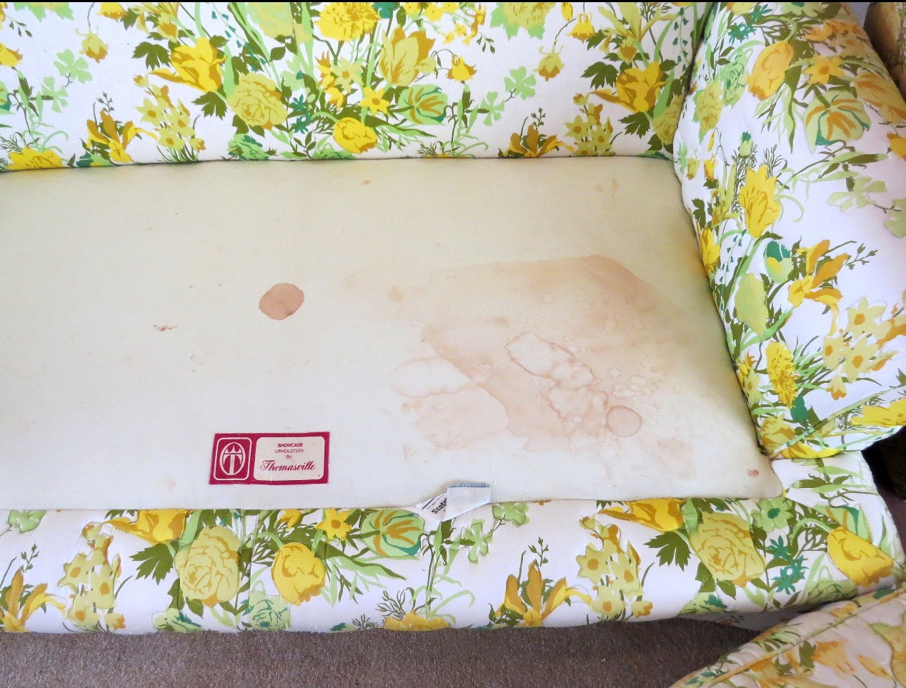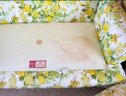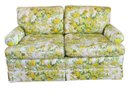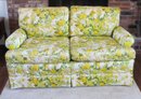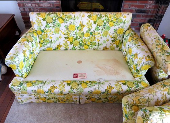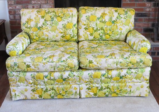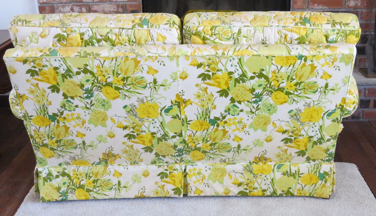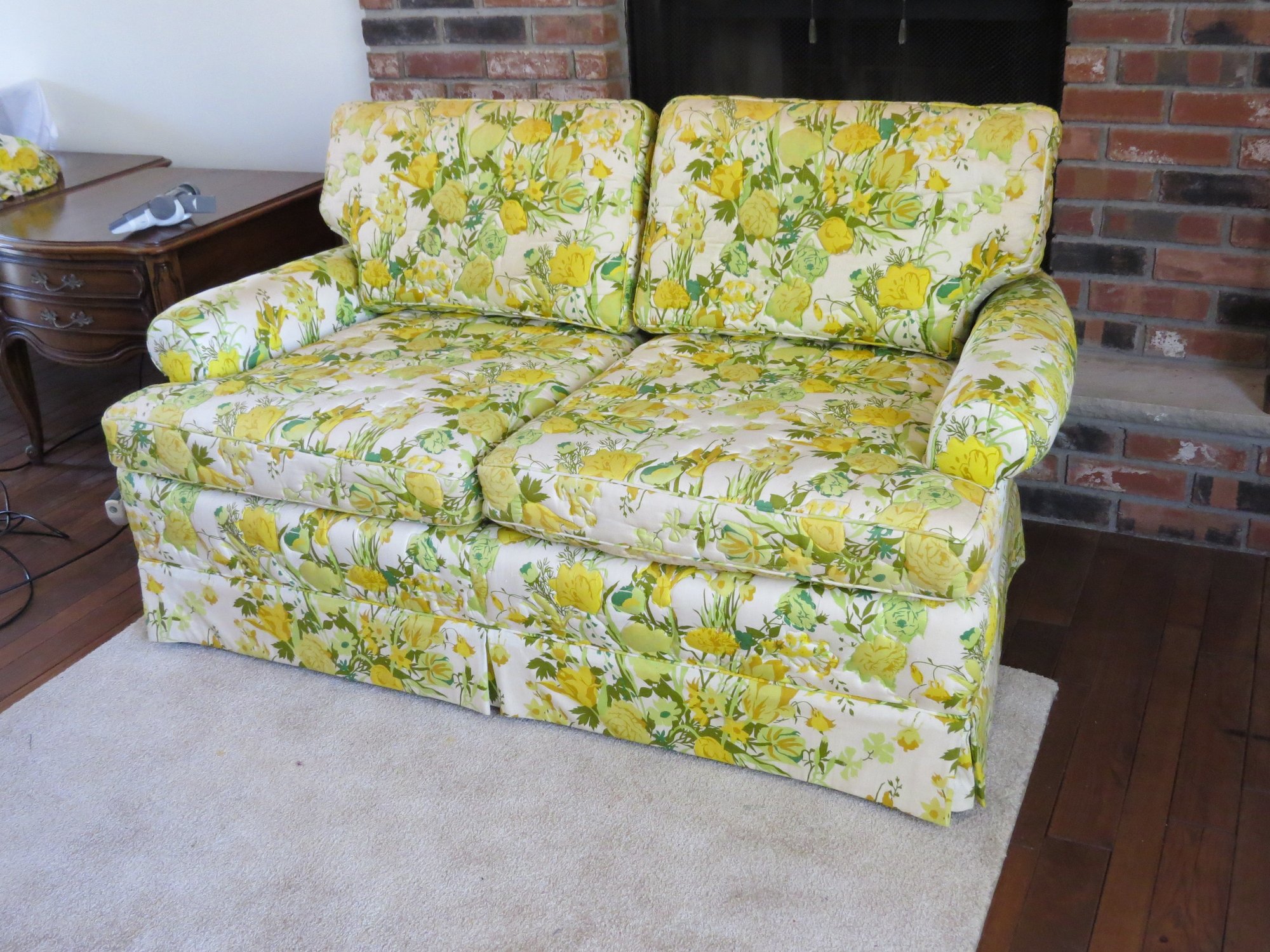 A vintage Thomasville, NC made love seat in a wild 1970's era yellow daisies pattern, 57" wide, 30" height at back, about 36" deep overall. Overall decent condition, there was an incident with a glass of wine a couple of decades ago, thus the staining , the back and seat cushions are zip outs so they got saved by the washing machine at the time. You can't see it with the cushions on top. One tear underside of arm, back corner edge as shown can be resewn or otherwise just ignored, its at the back.