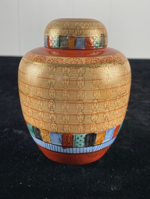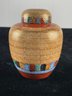 White base, multi colored designed and painted. Lid included. No label. See photos for more conditions and sizing.