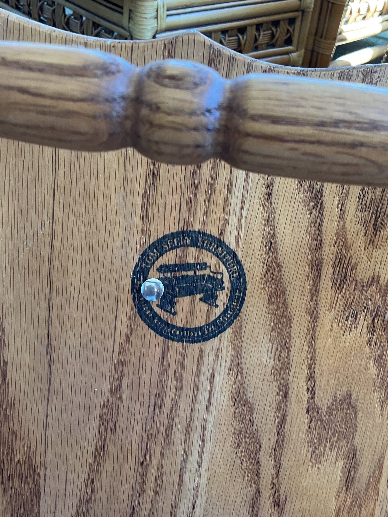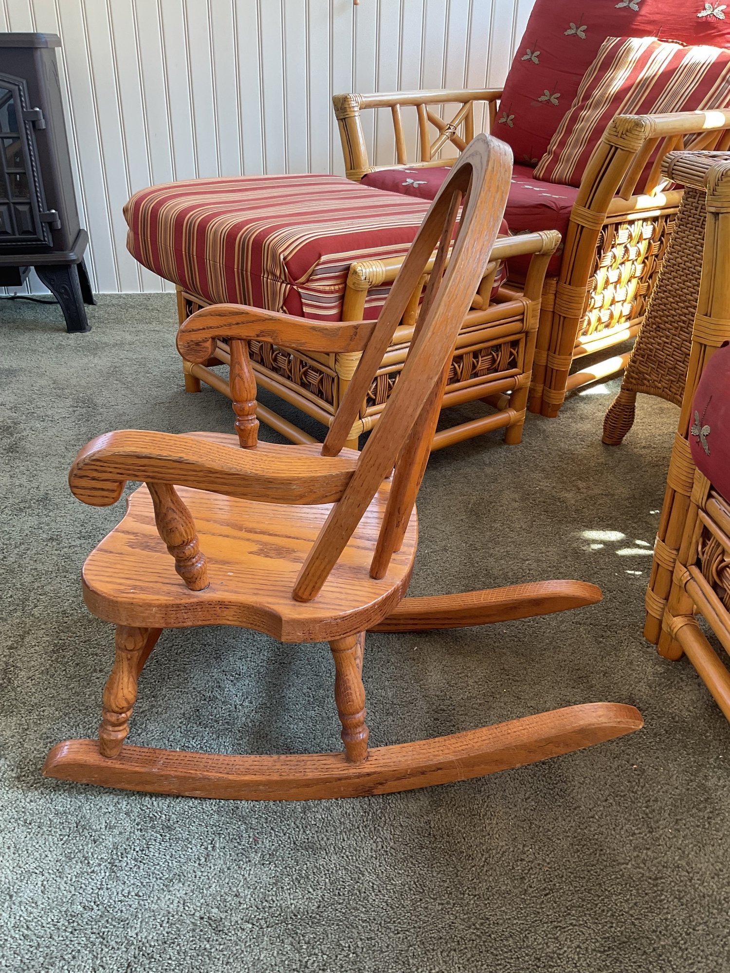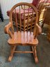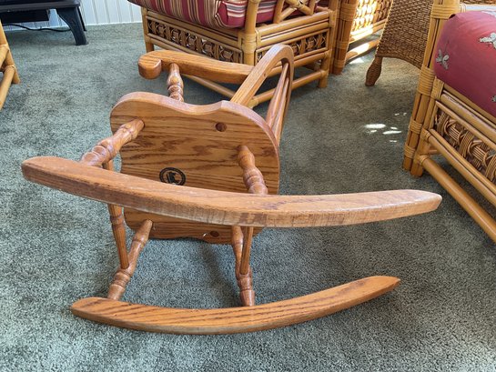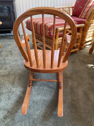 Beautifully crafted child’s rocking chair from Tom Seely Furniture, known for their high-quality, solid wood construction. This piece features a classic hoop-back design with supportive slats, curved armrests, and a sturdy contoured seat. Its timeless honey-oak finish allows it to fit perfectly in a nursery, playroom, or as a charming accent piece in a living room.