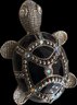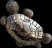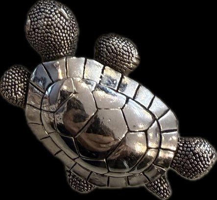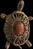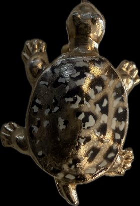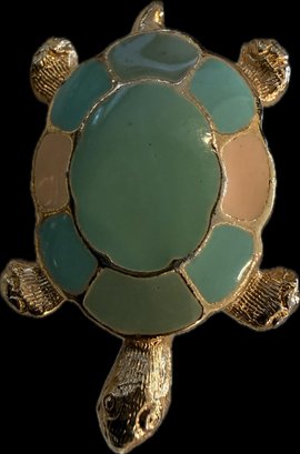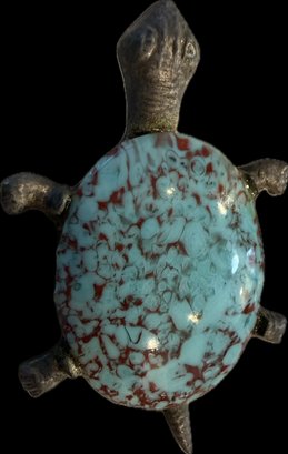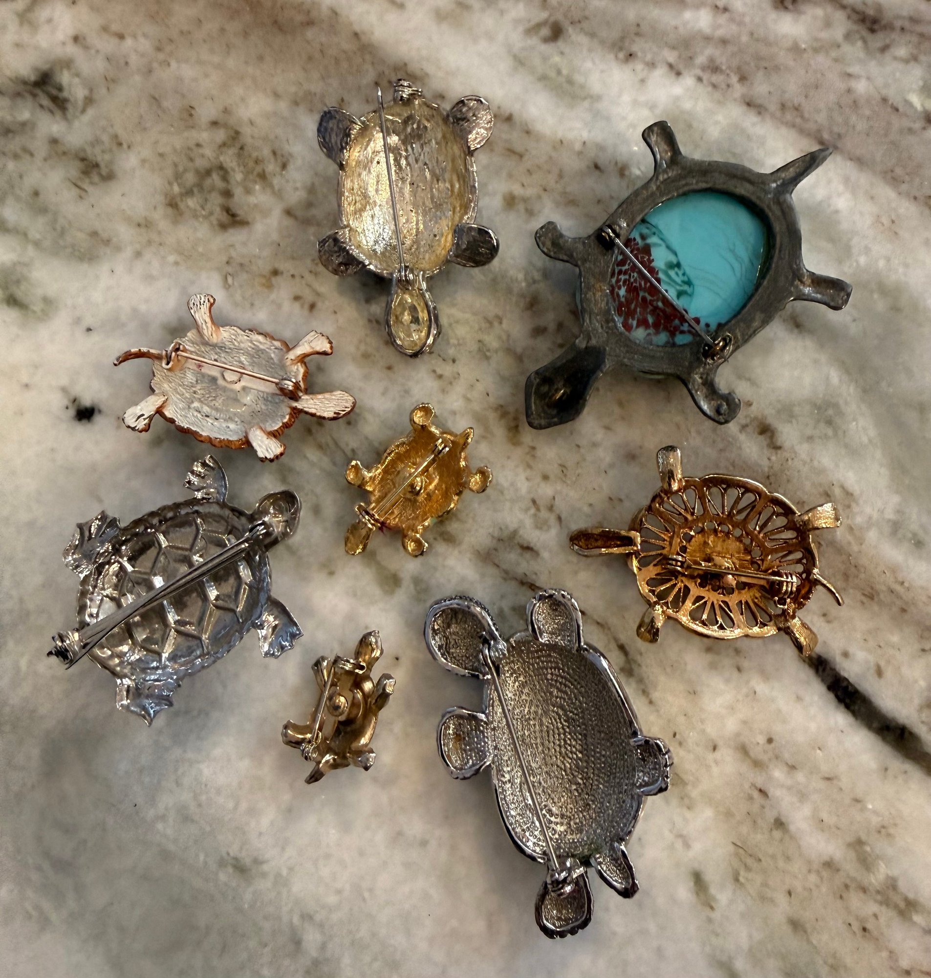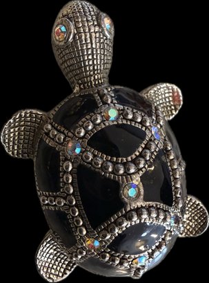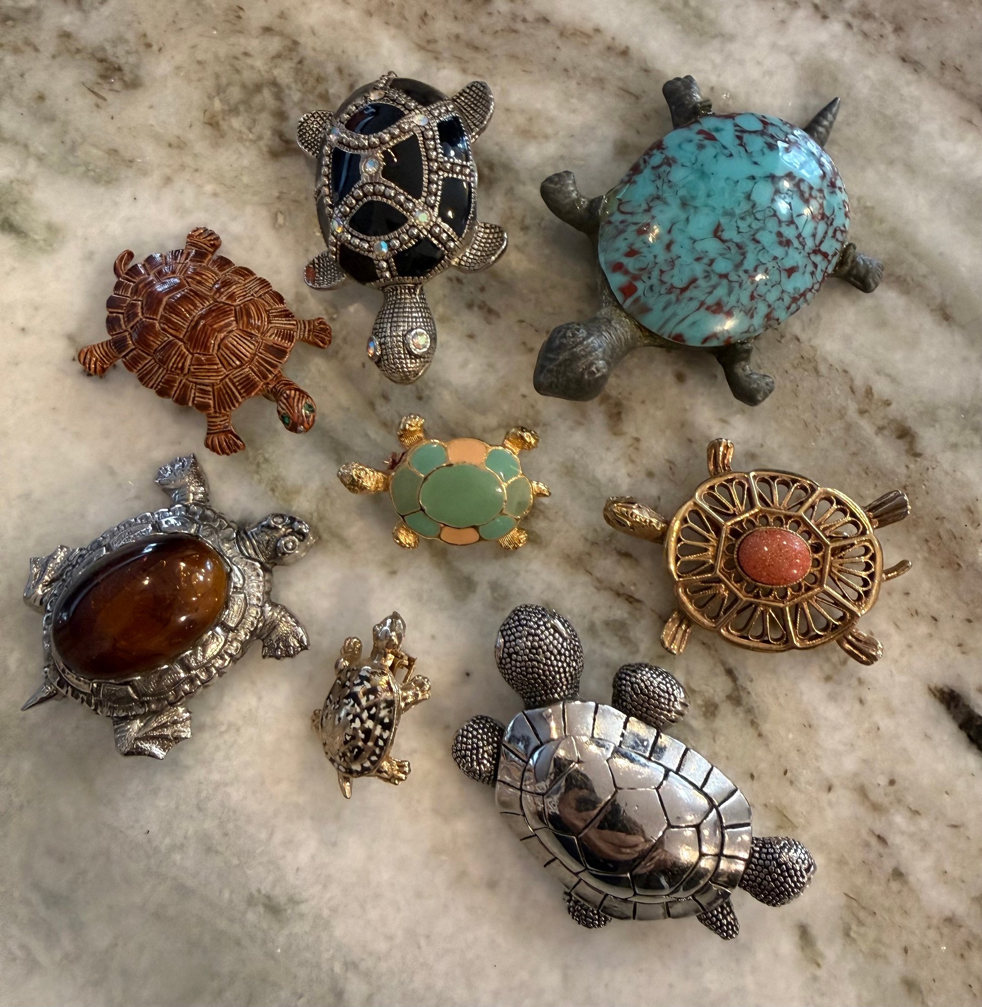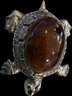 Charming collection of eight vintage turtle brooches featuring a variety of decorative styles and materials. Designs include turtles with cabochon stones, enamel shells, rhinestone accents, filigree openwork, and sculptural metalwork, creating a fun and collectible assortment. Notable pieces include a large turtle with turquoise-tone and red mottled cabochon shell, a rhinestone-accented turtle with black enamel panels, a gold tone turtle with coral-tone cabochon center, a silver tone turtle with large amber-tone cabochon shell, and additional smaller figural turtles with detailed shell patterns and textured finishes. A great grouping for animal jewelry collectors, turtle enthusiasts, or resale as individual brooches.