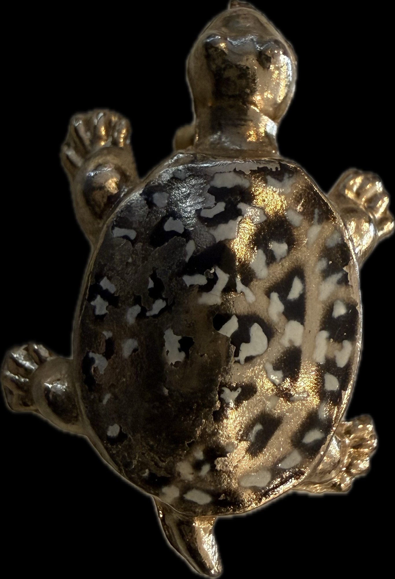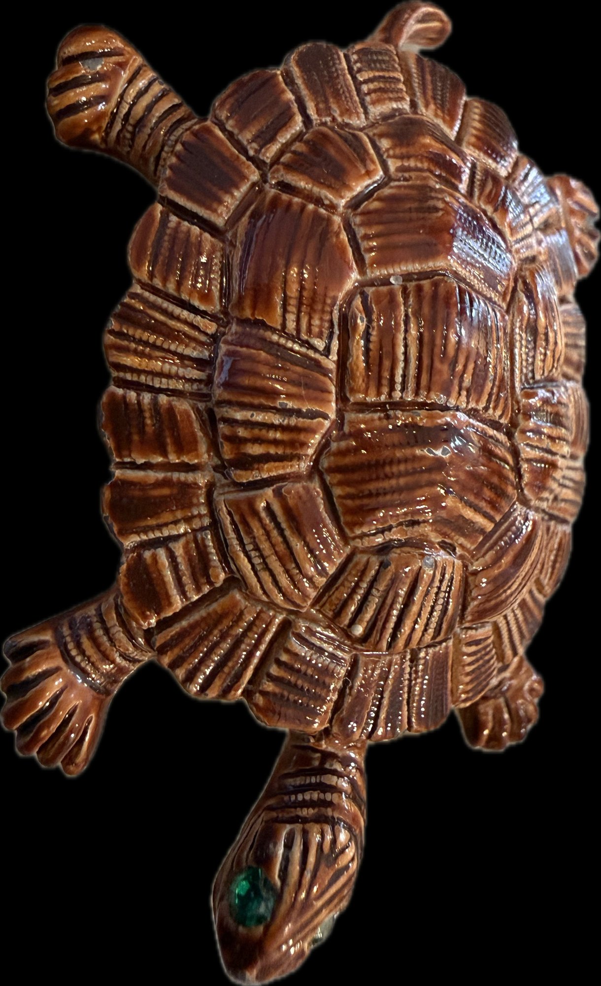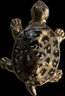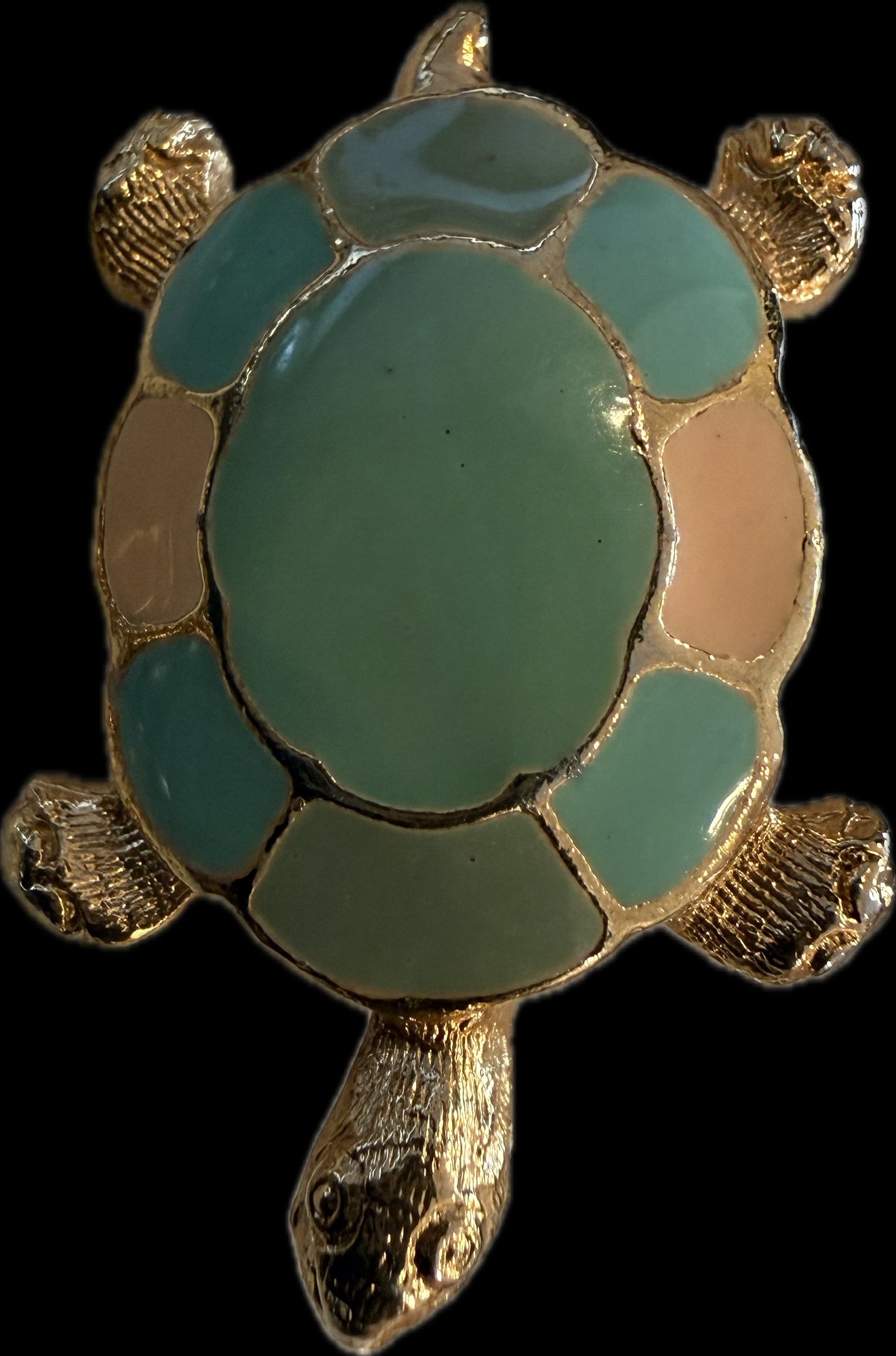 Charming collection of eight vintage turtle brooches featuring a variety of decorative styles and materials. Designs include turtles with cabochon stones, enamel shells, rhinestone accents, filigree openwork, and sculptural metalwork, creating a fun and collectible assortment. Notable pieces include a large turtle with turquoise-tone and red mottled cabochon shell, a rhinestone-accented turtle with black enamel panels, a gold tone turtle with coral-tone cabochon center, a silver tone turtle with large amber-tone cabochon shell, and additional smaller figural turtles with detailed shell patterns and textured finishes. A great grouping for animal jewelry collectors, turtle enthusiasts, or resale as individual brooches.