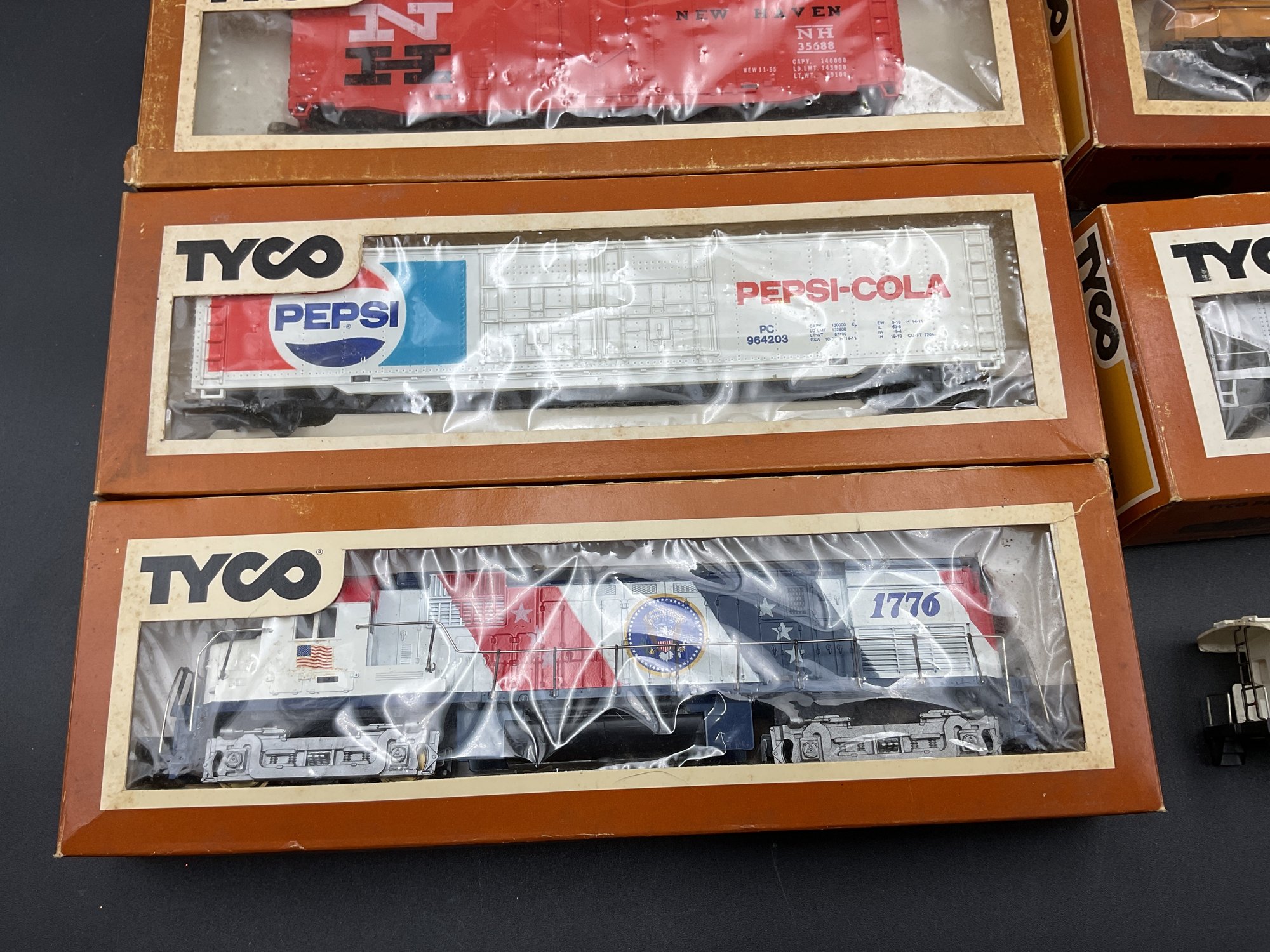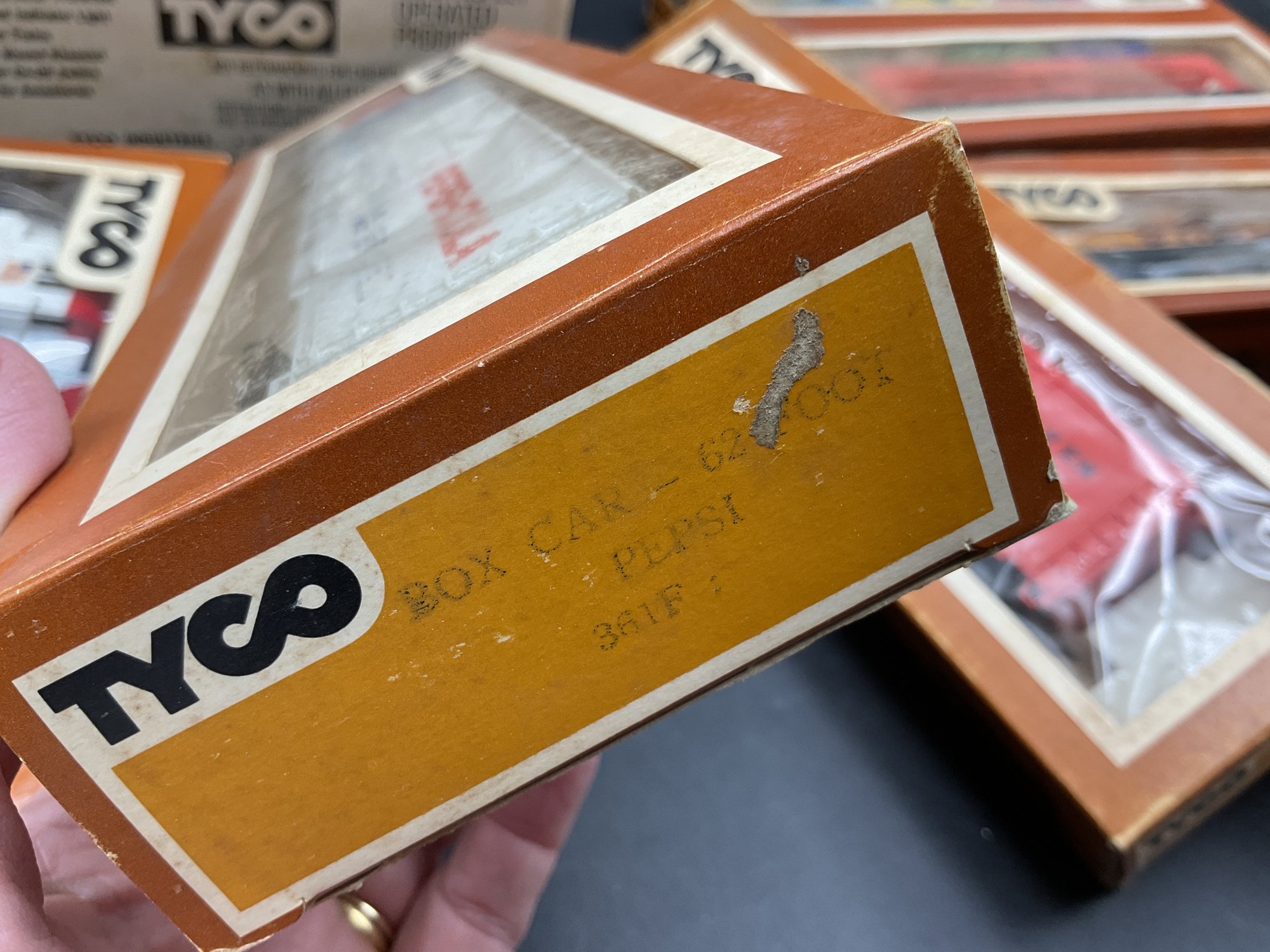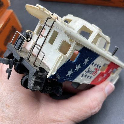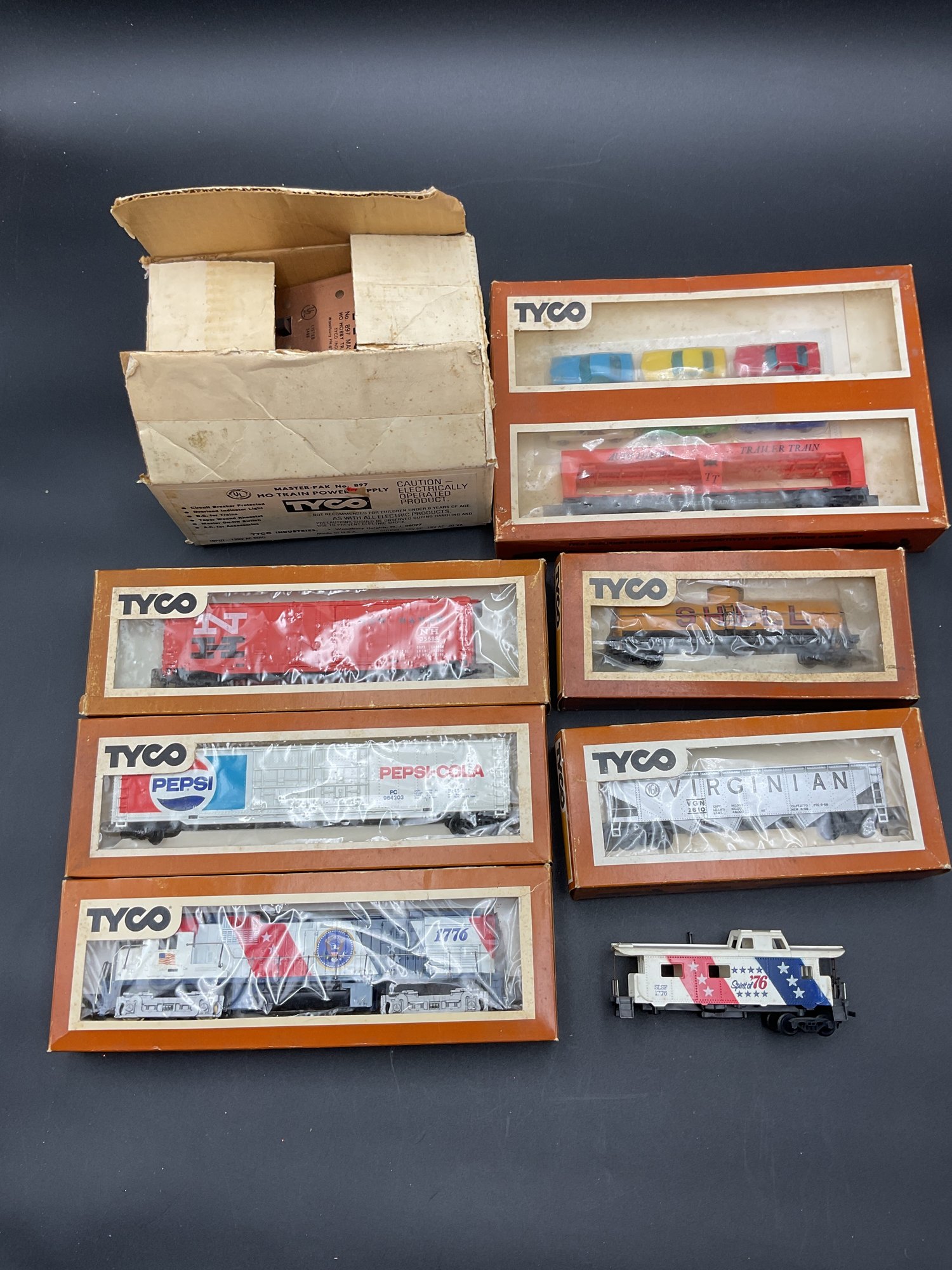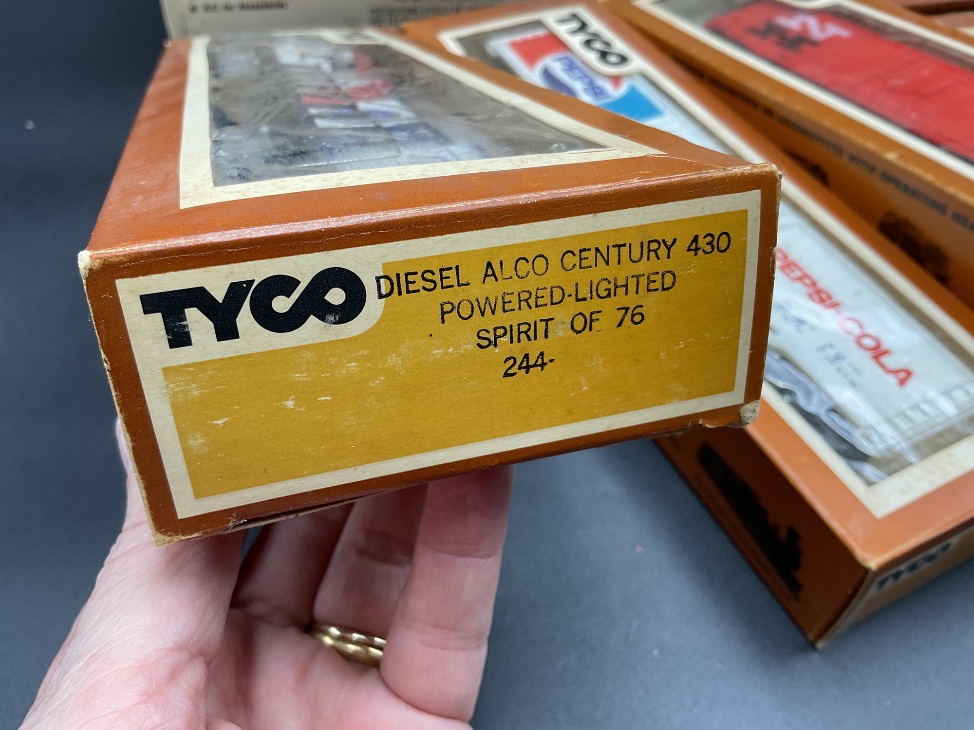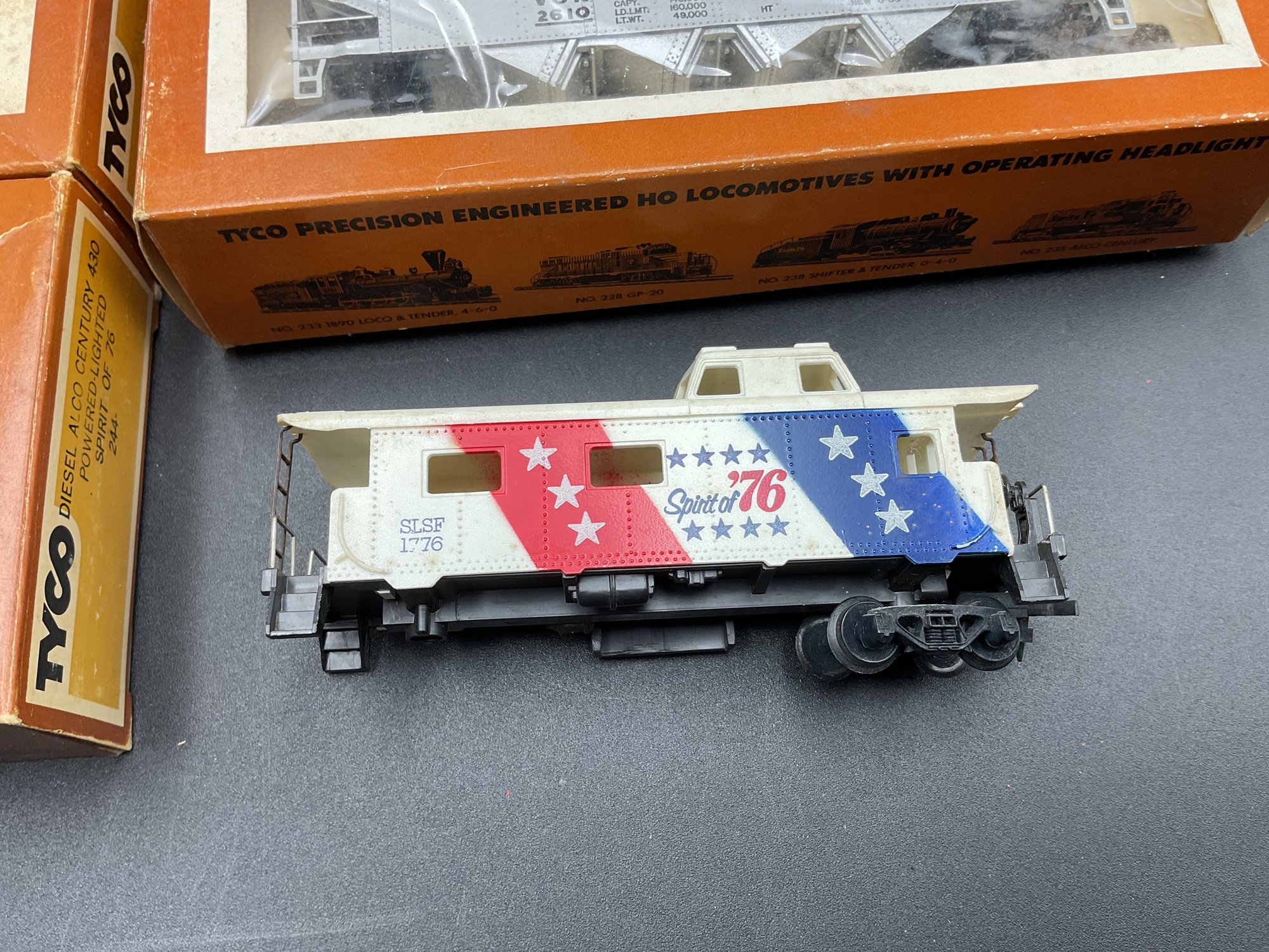 This lot includes 1976 vintage TYCO model trains and power supply. All in original boxes and in excellent condition except the Spirit of '76 caboose car has no box and is missing one set of wheels. Boxes all have dirt and wear from long term storage - these have not been used in 50 years! (no track)