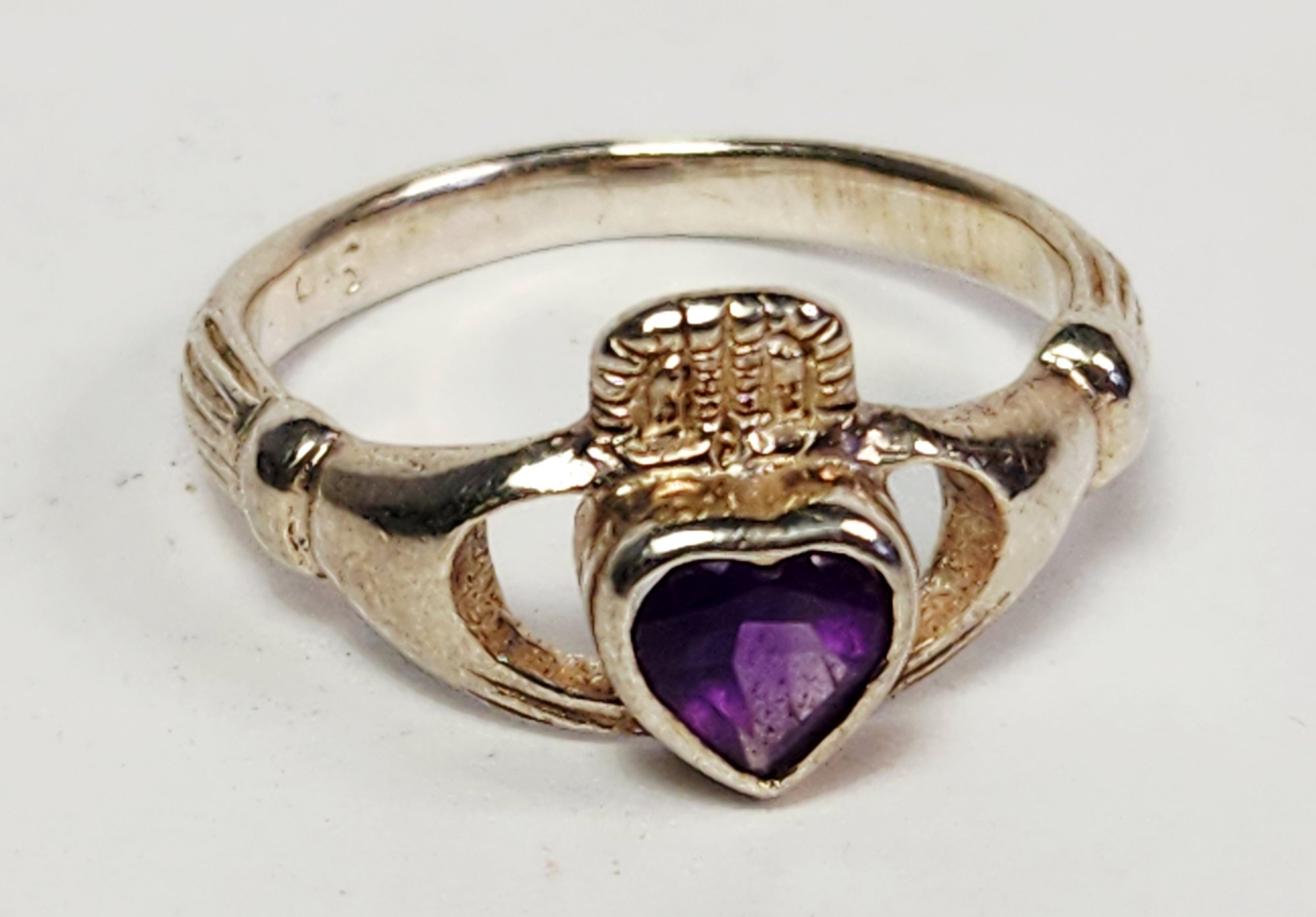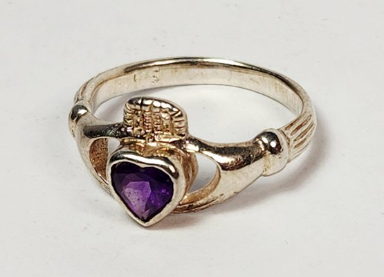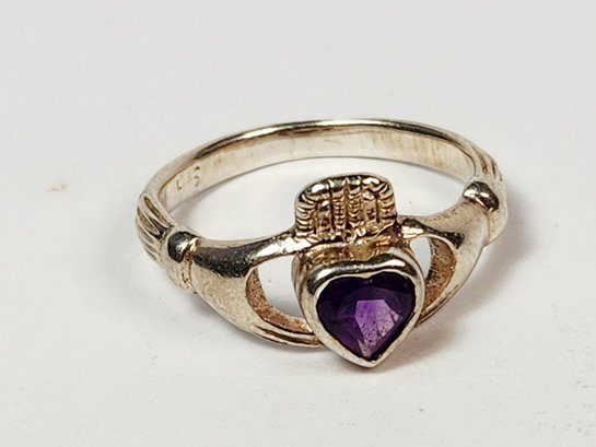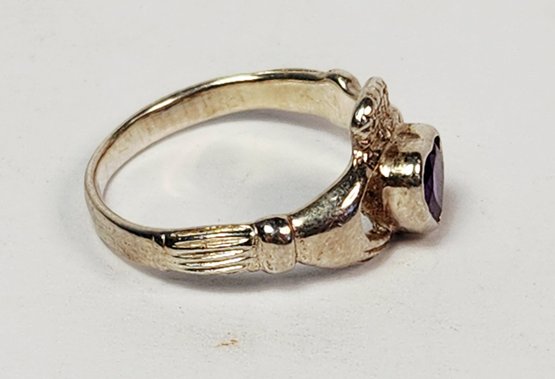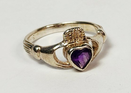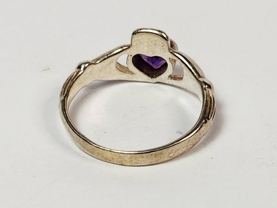 Vintage UNiQUE Sterling silver Amethyst Heart stone Irish Claddagh Ring