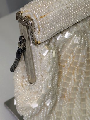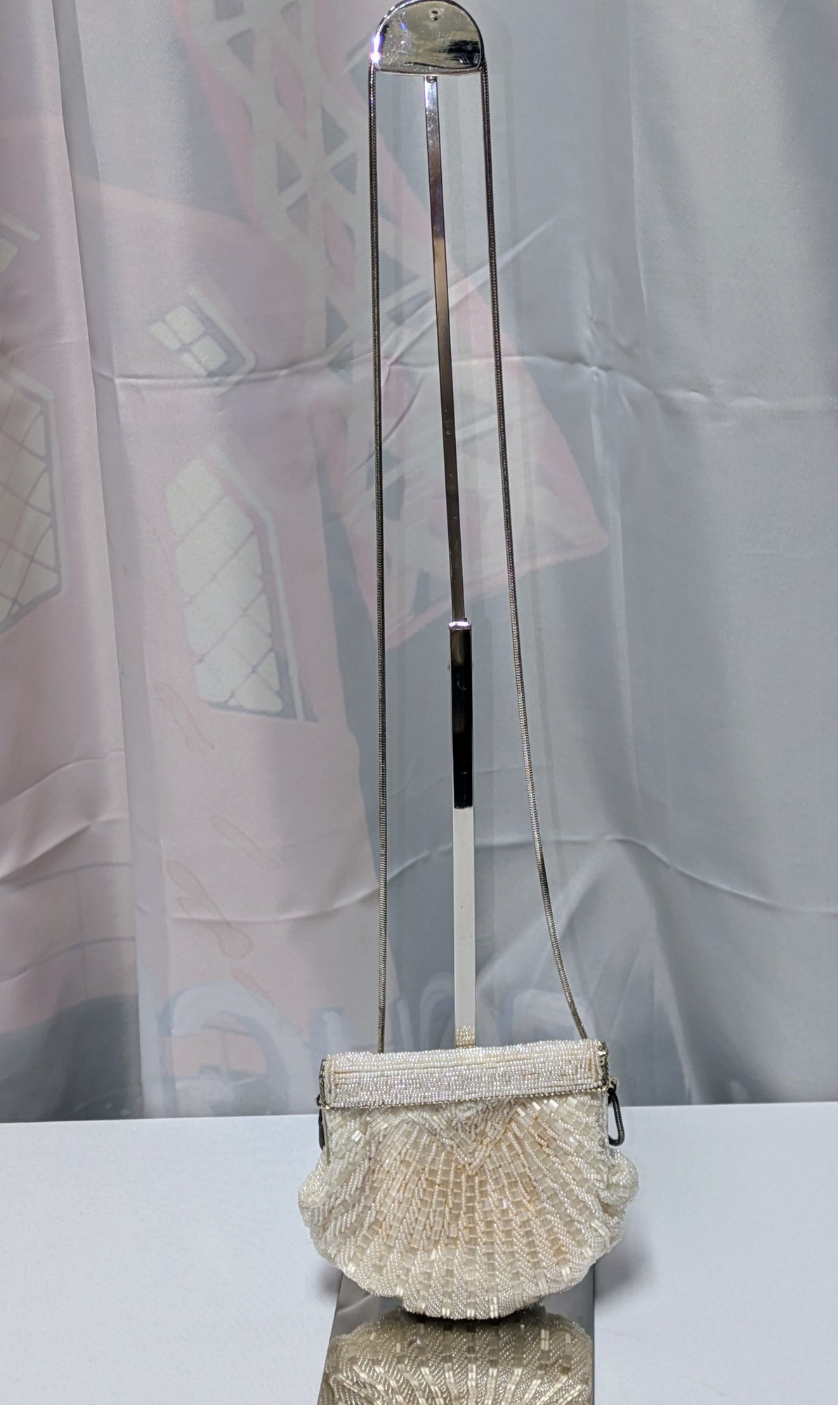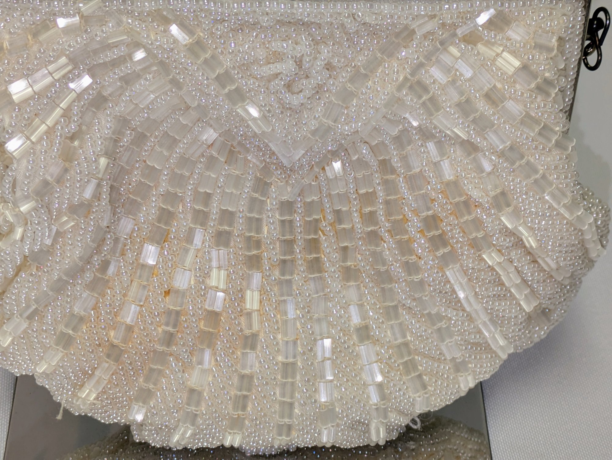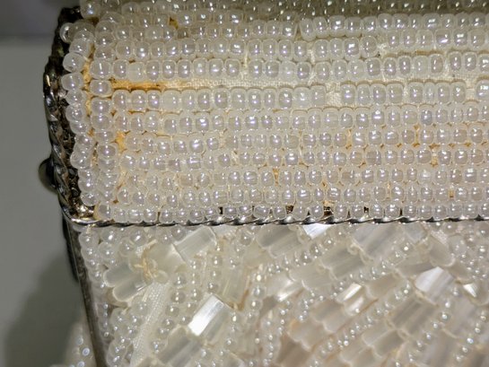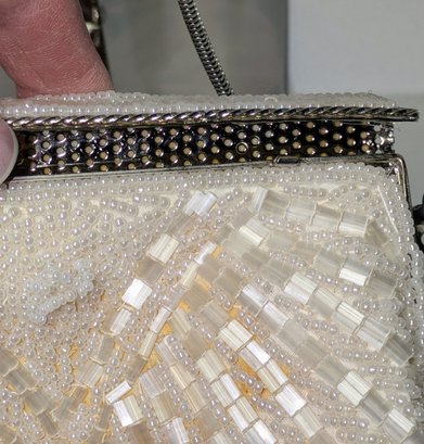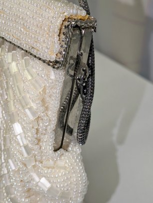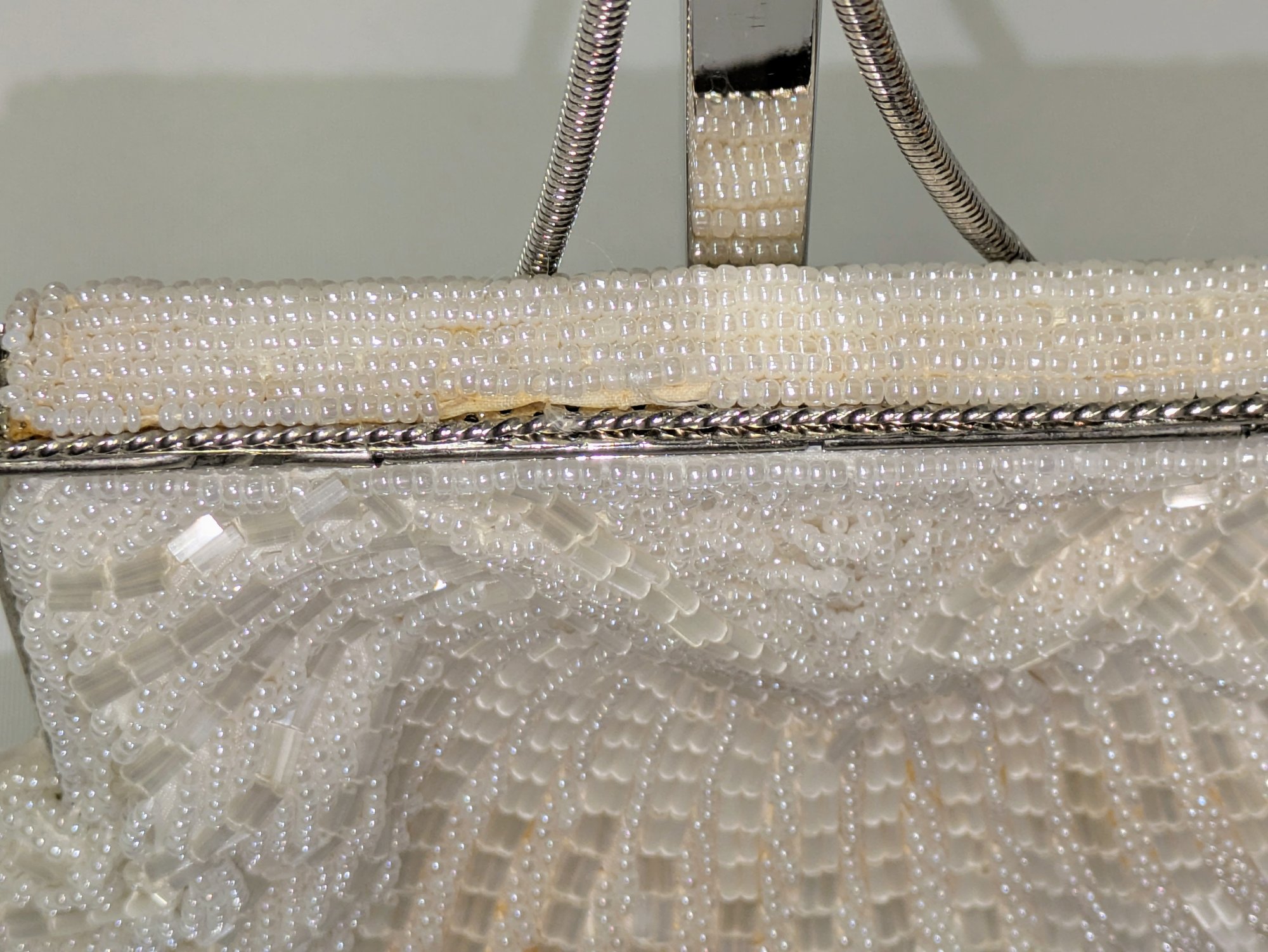 Beautiful Design and Details. Features a Silver Tone Strap, Metal Snap Over Flap, and Satin Lining. There are some missing beads, discoloration, and a mark inside, all consistent with age and use. Please see all photos as part of the description and condition. Drop 21.5" / Bag 5.5" x 6.5" x 1"