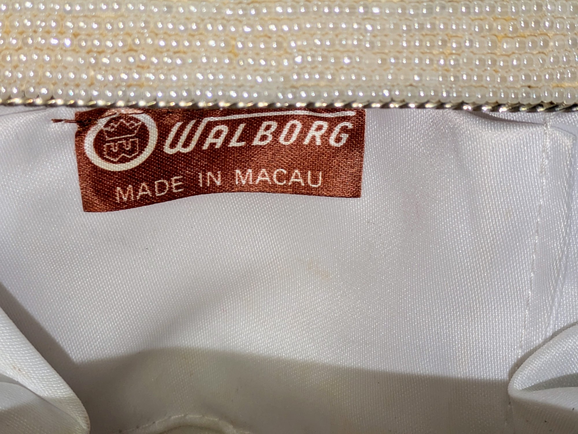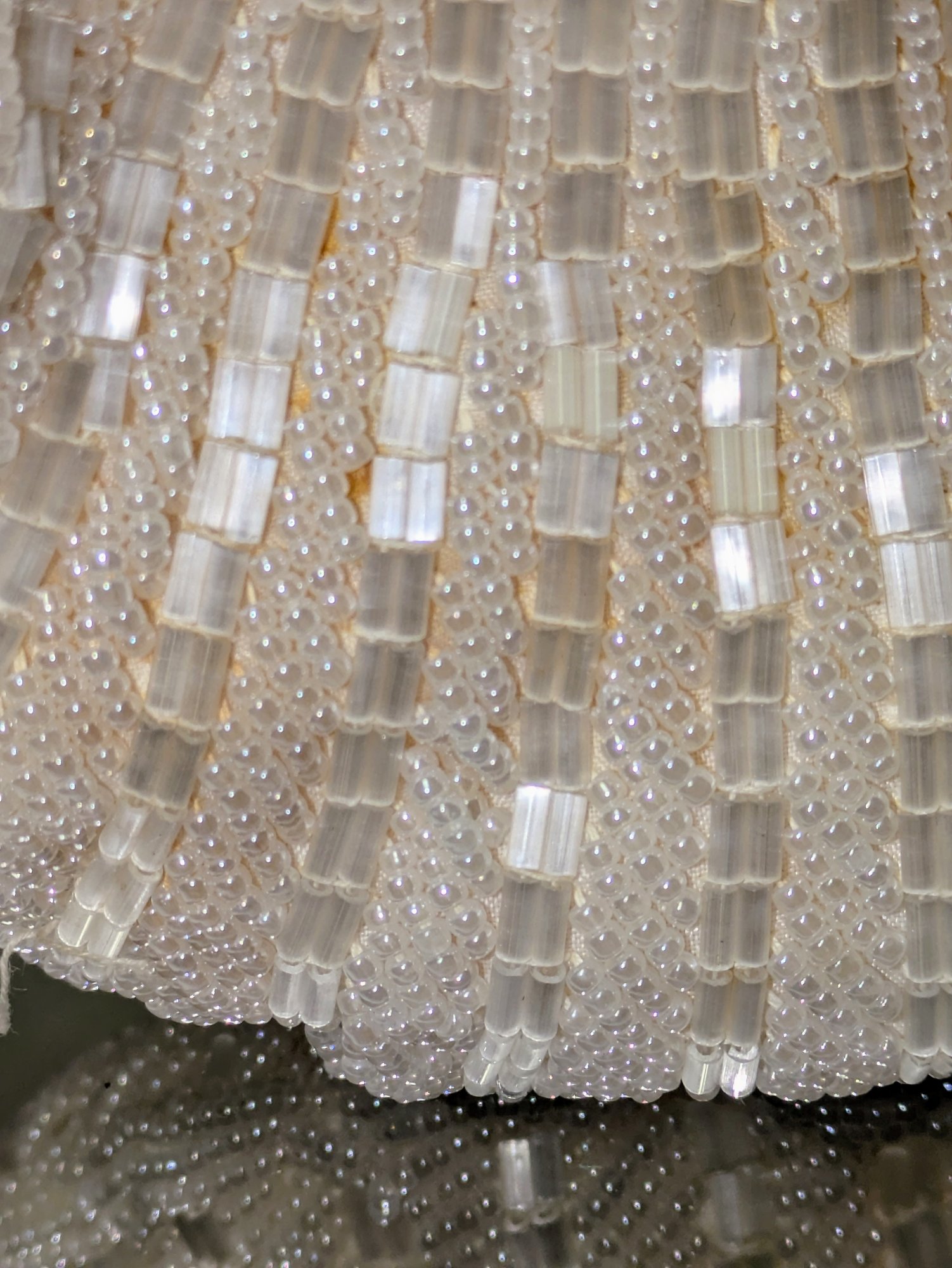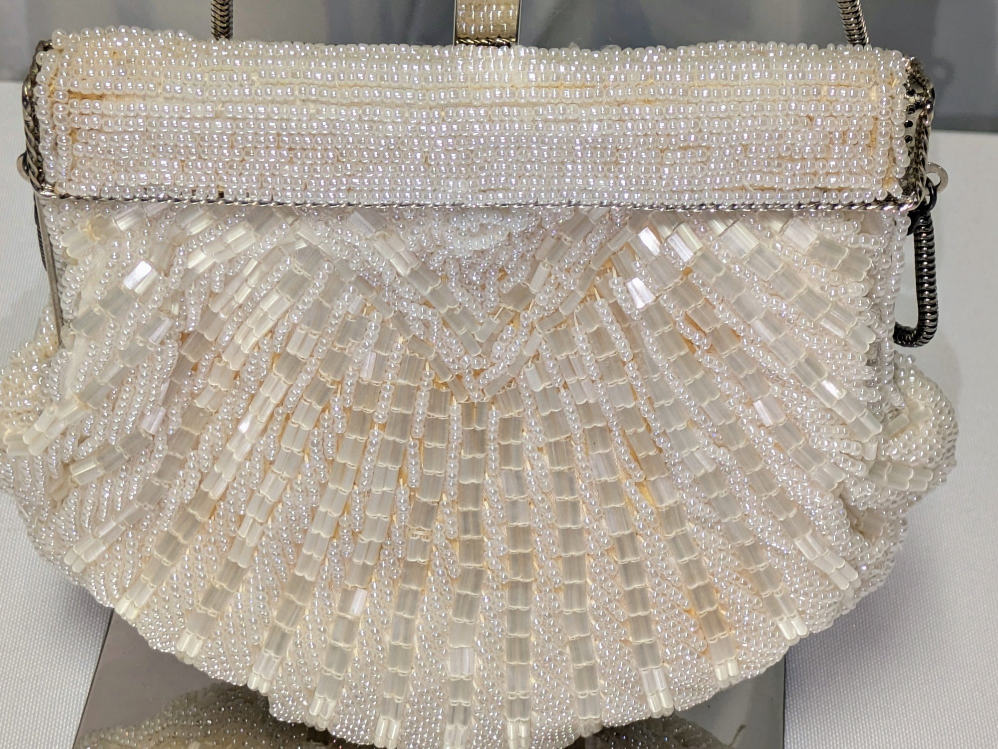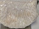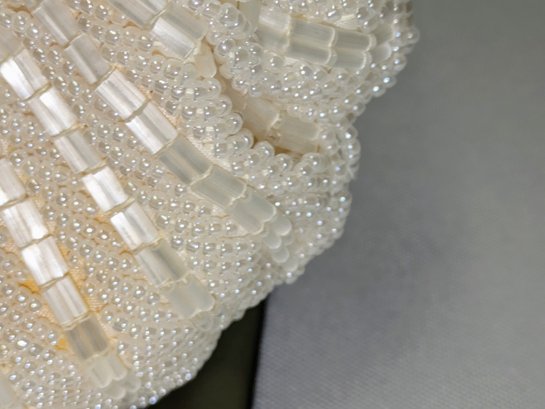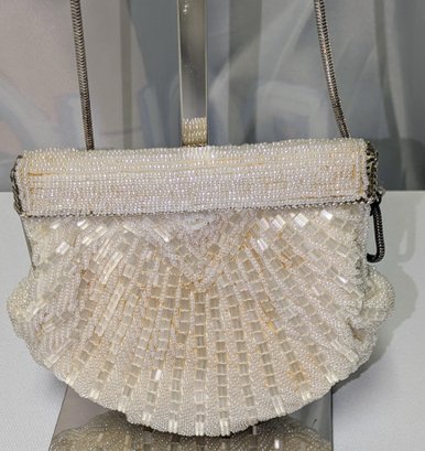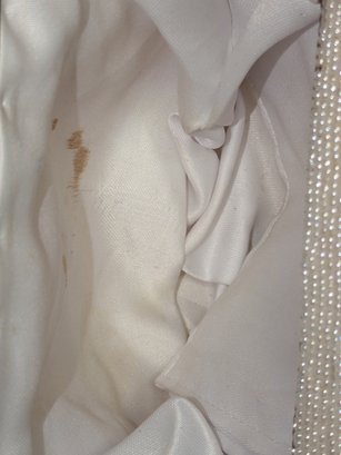 Beautiful Design and Details. Features a Silver Tone Strap, Metal Snap Over Flap, and Satin Lining. There are some missing beads, discoloration, and a mark inside, all consistent with age and use. Please see all photos as part of the description and condition. Drop 21.5" / Bag 5.5" x 6.5" x 1"