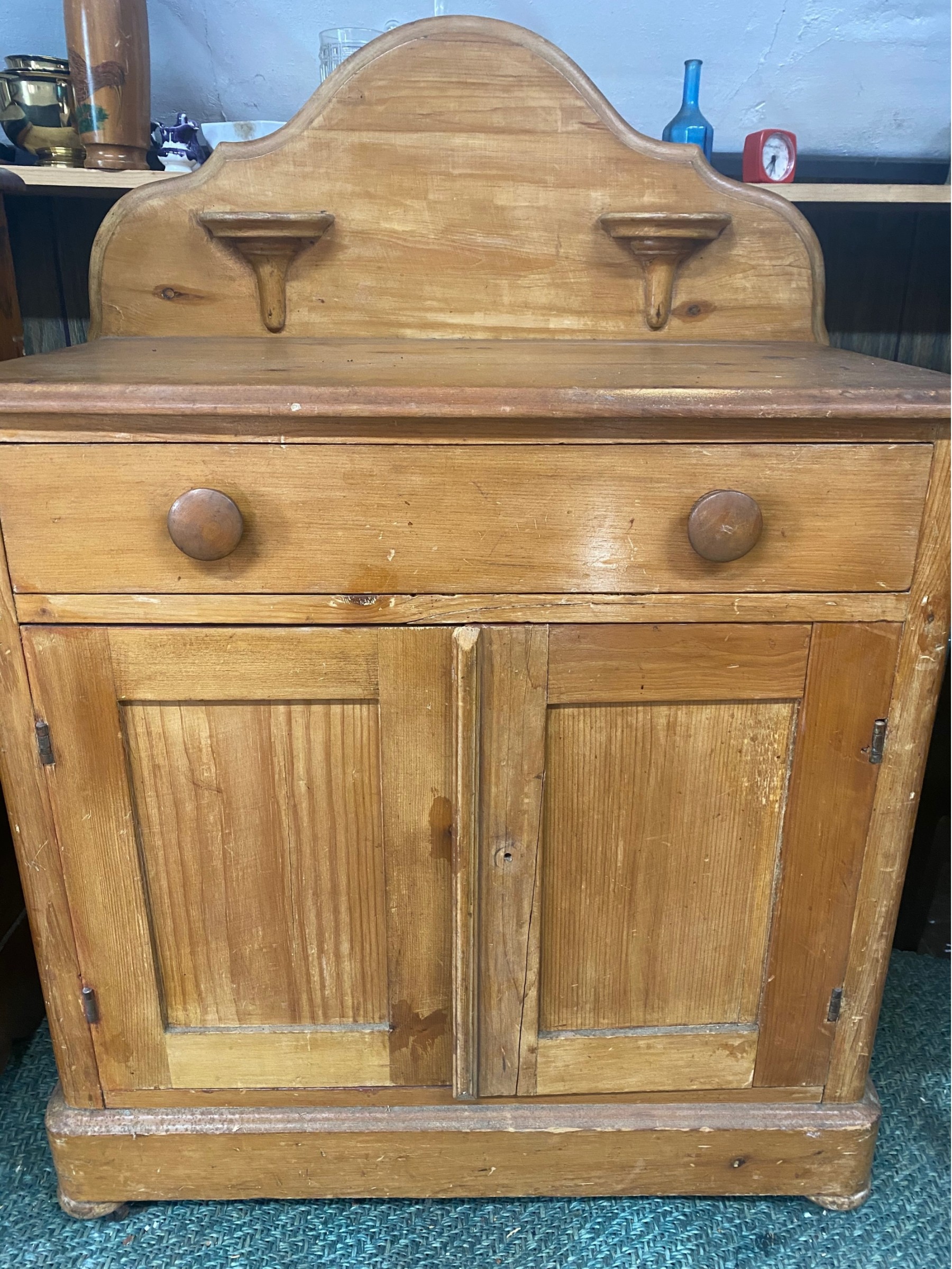 Fair Condition, part of door is broken but it snaps in, just needs glue, scratches, stains, small cracks and finish loss - see all photos. Size is 29 x 44 x 15