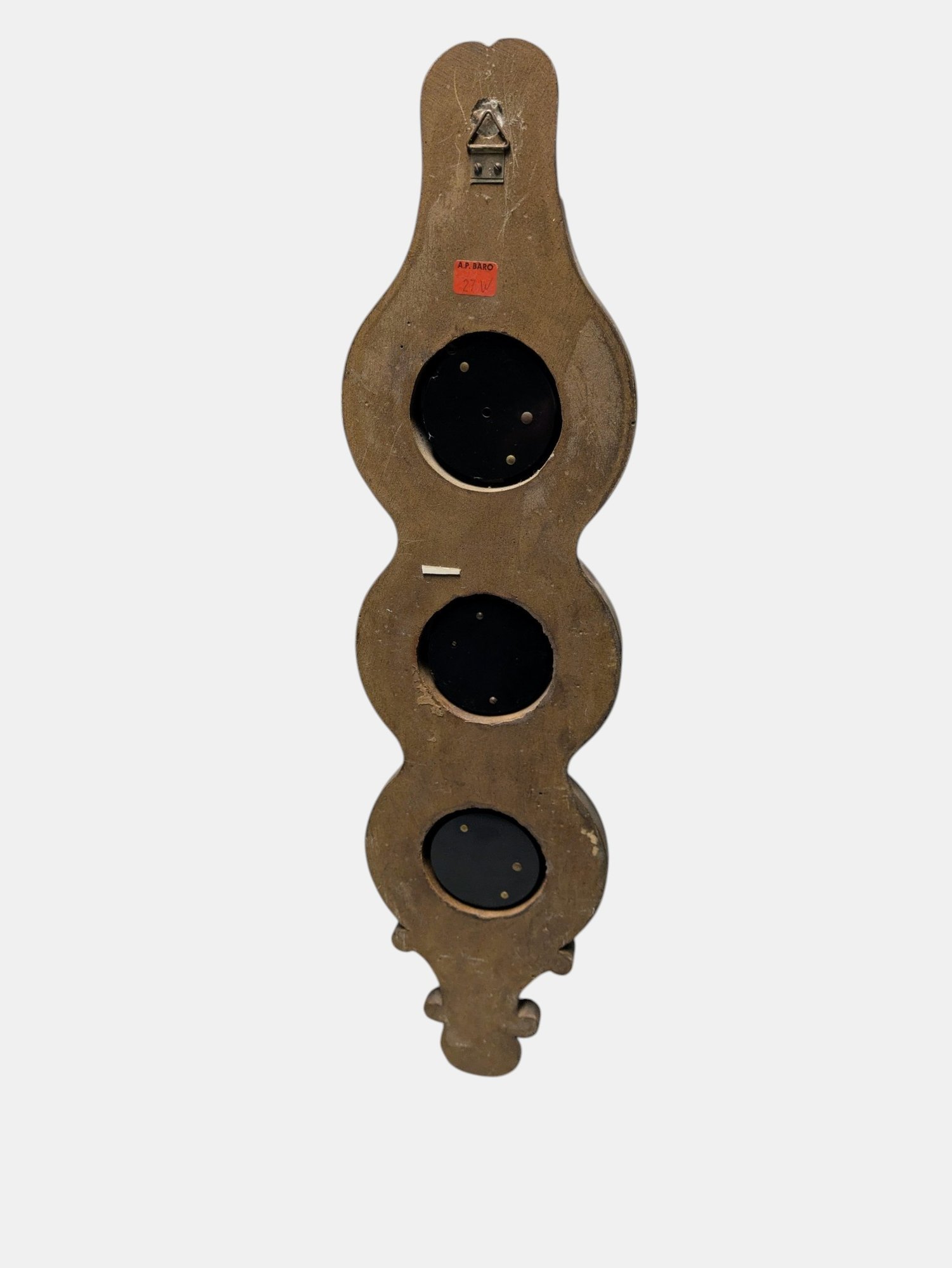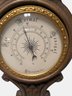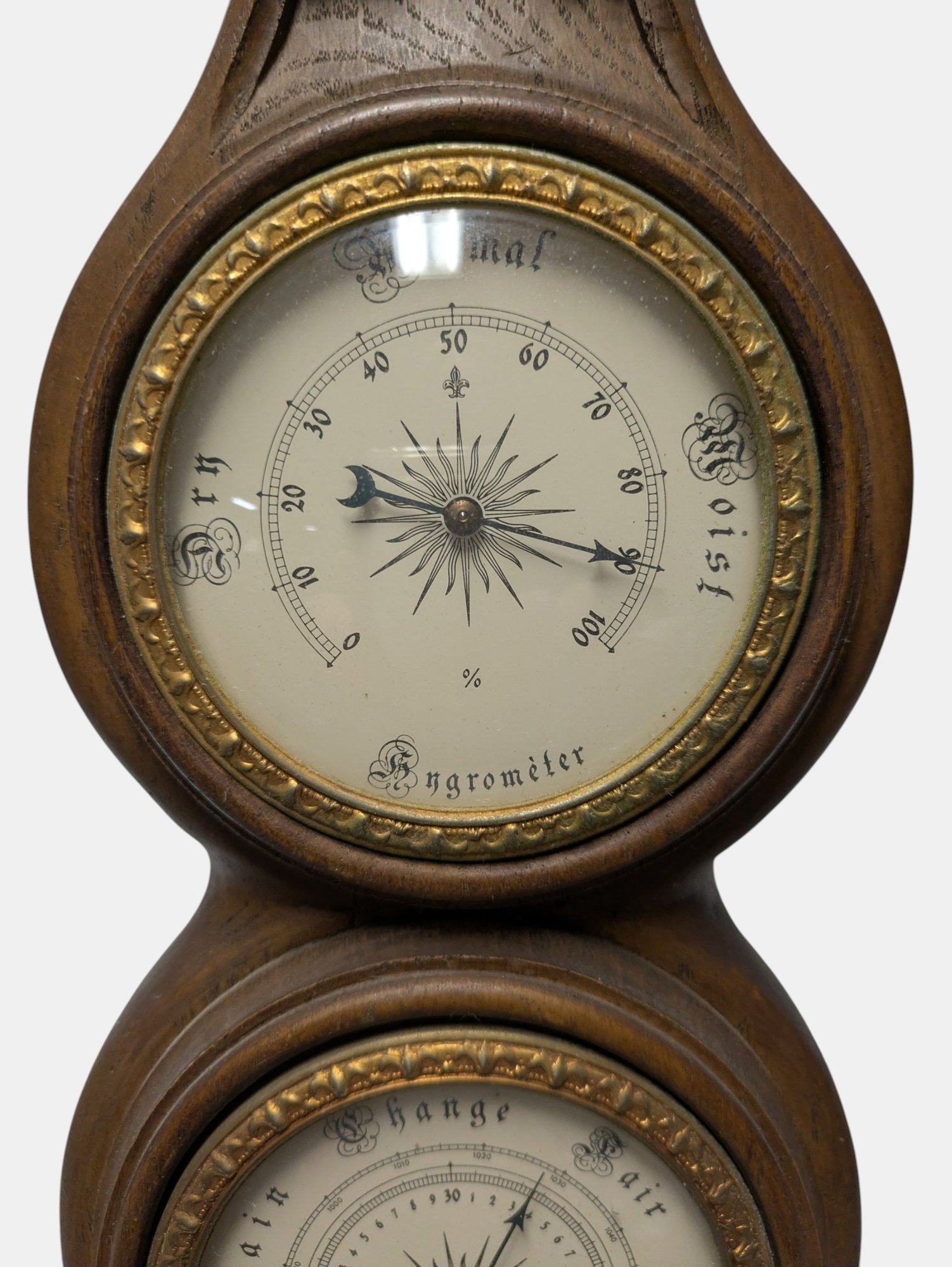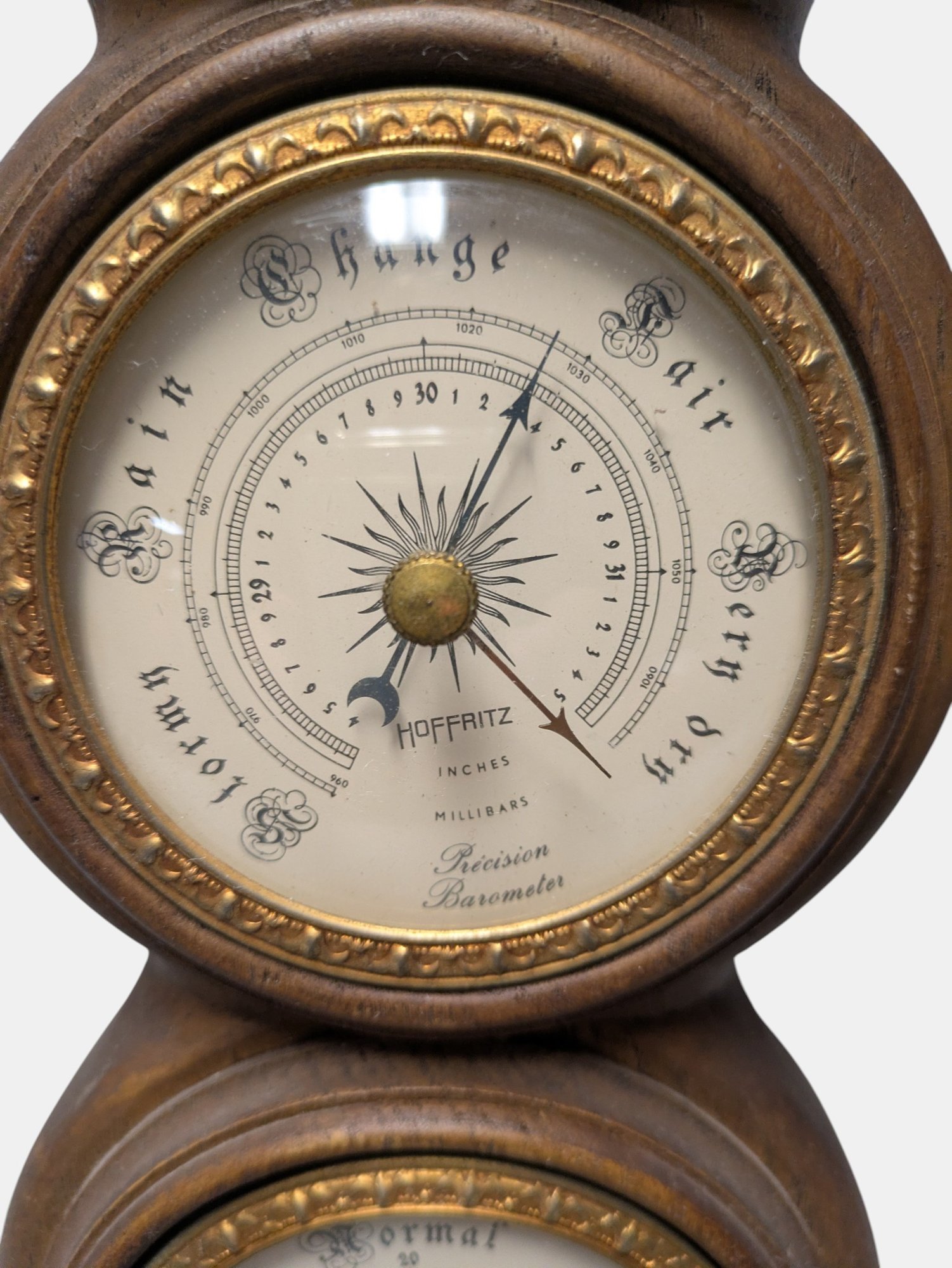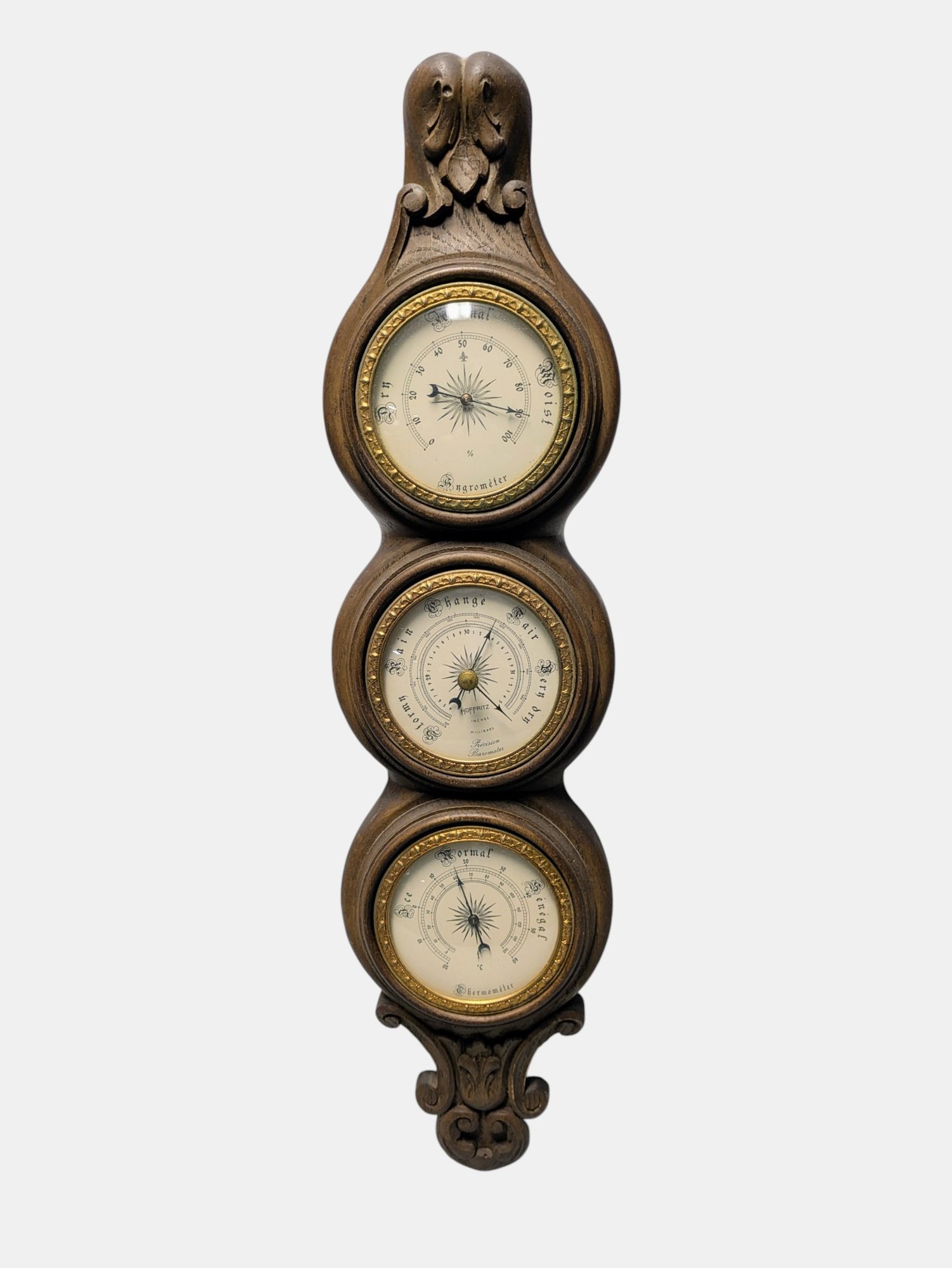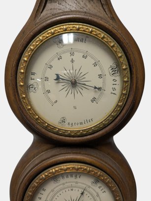 A great circular wood frame encompasses the weather instruments. There is a hook in the back for hanging on a wall. There are some marks on the back of the frame, consistent with age and movement. Overall, Very Good Vintage Condition. Please see all photos as part of the description and condition. 20" x 5.25" x 1.75"