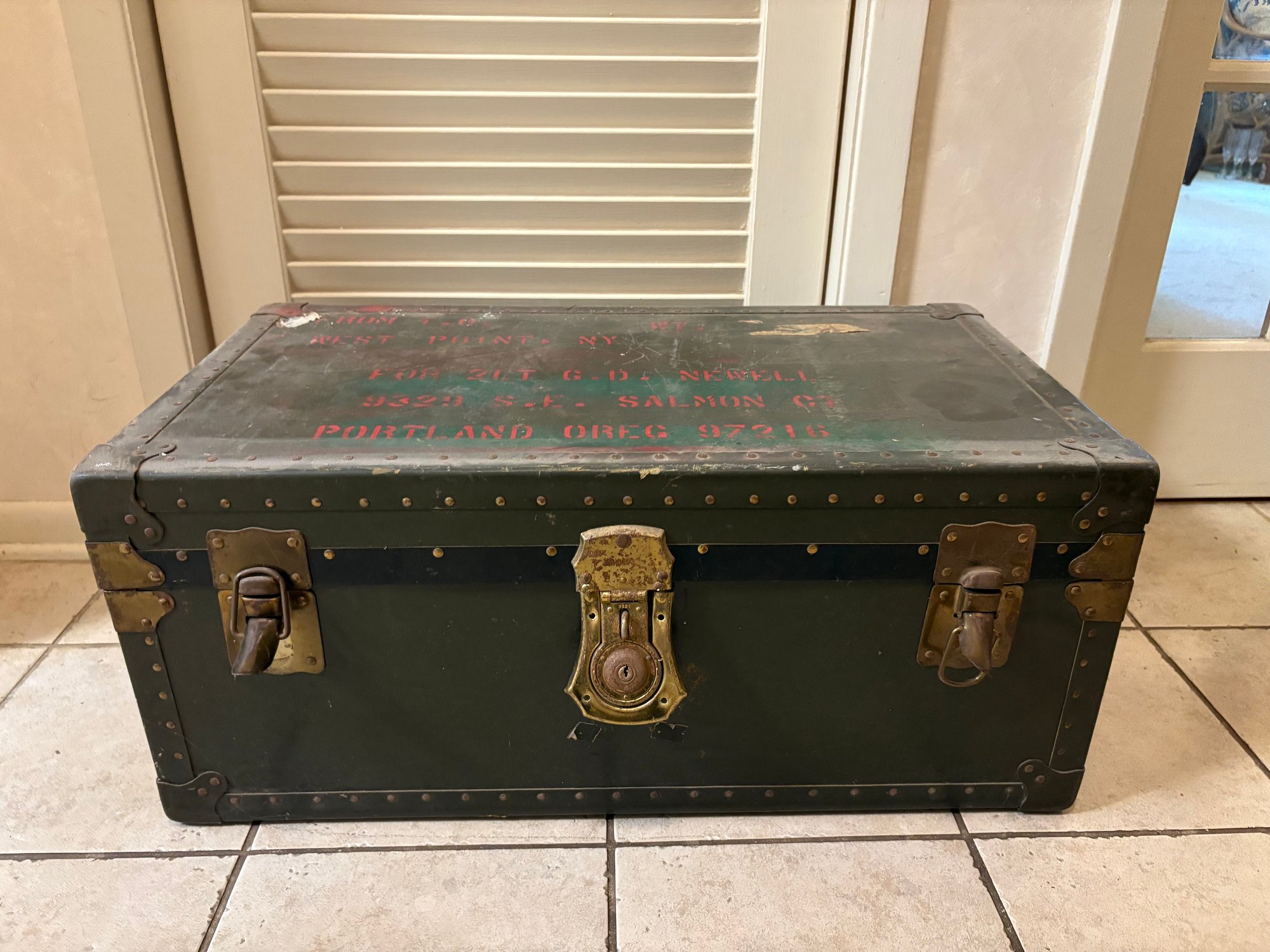 Vintage West Point foot locker/trunk with removable interior shelf.