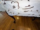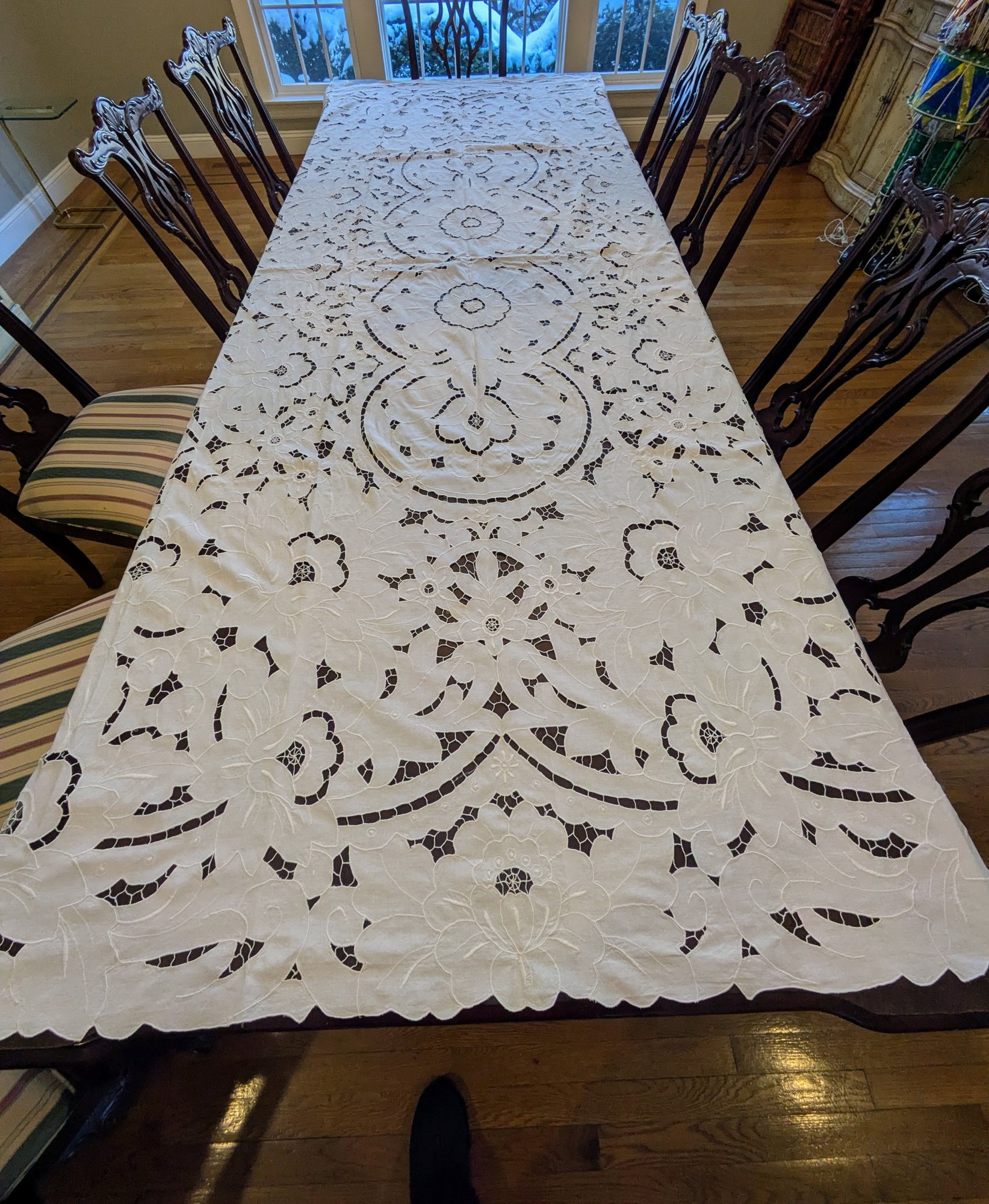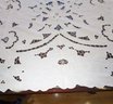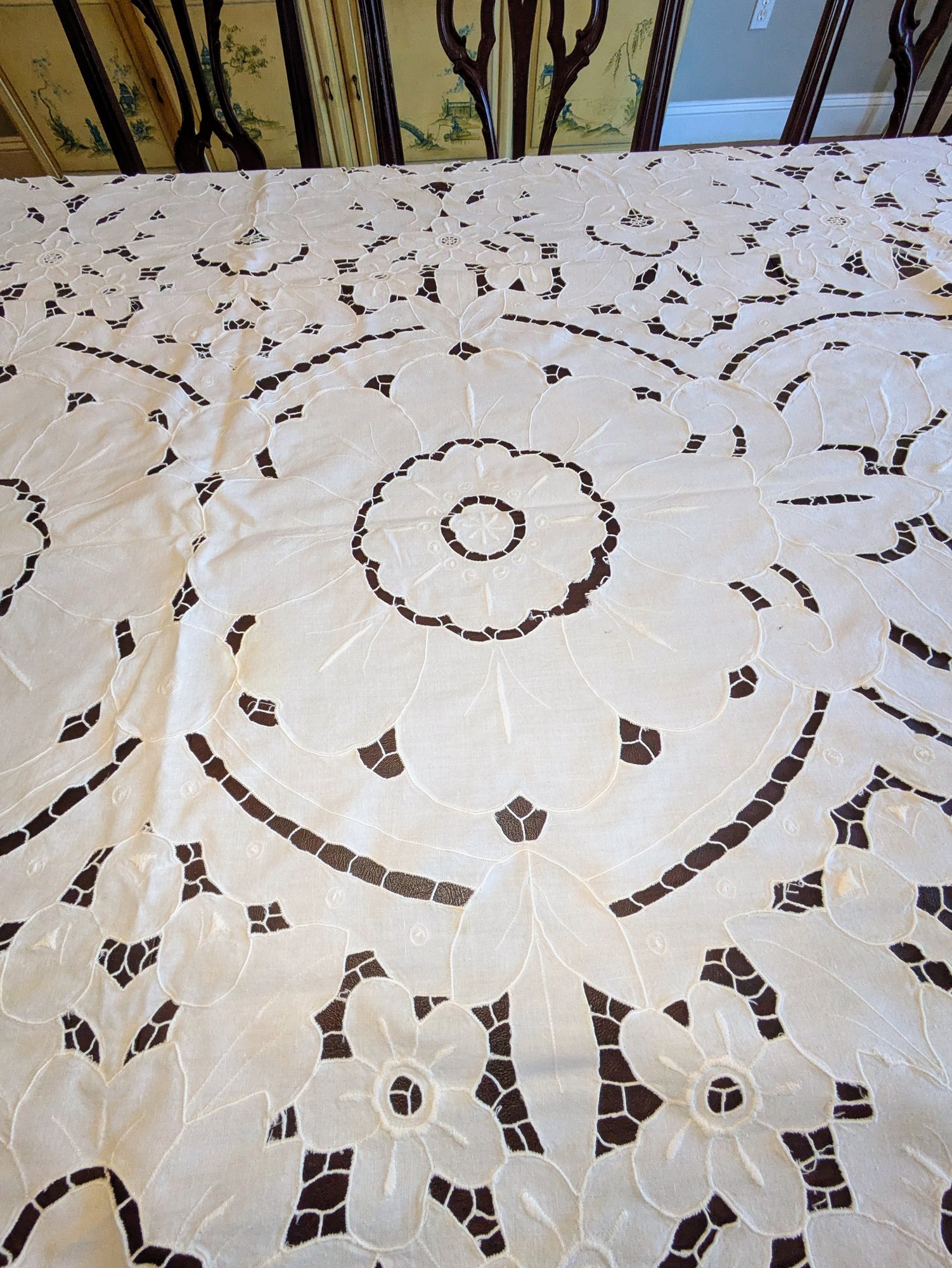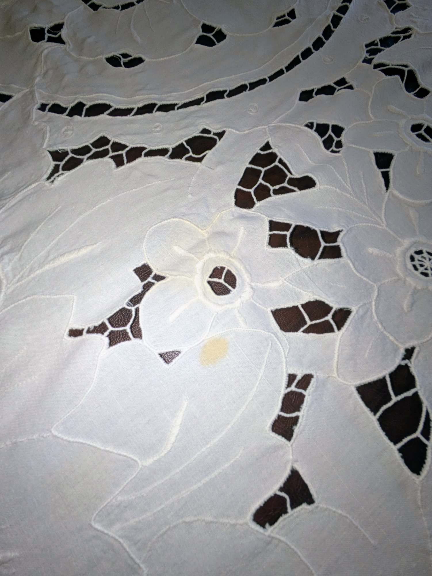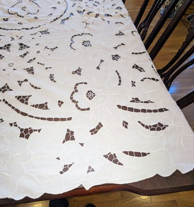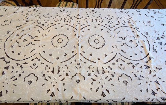 Vintage White Heavy Embroidered & Lace Rectangular Tablecloth. Beautiful floral print design and detailing. There is a small stain (see photos), consistent with age and use. Please see all photos as part of the description and condition. 113" x 62"