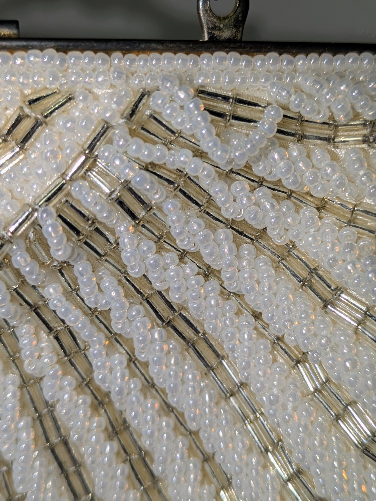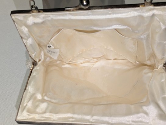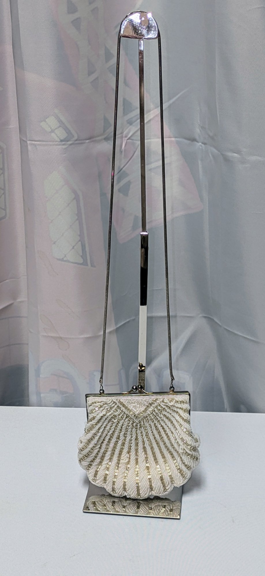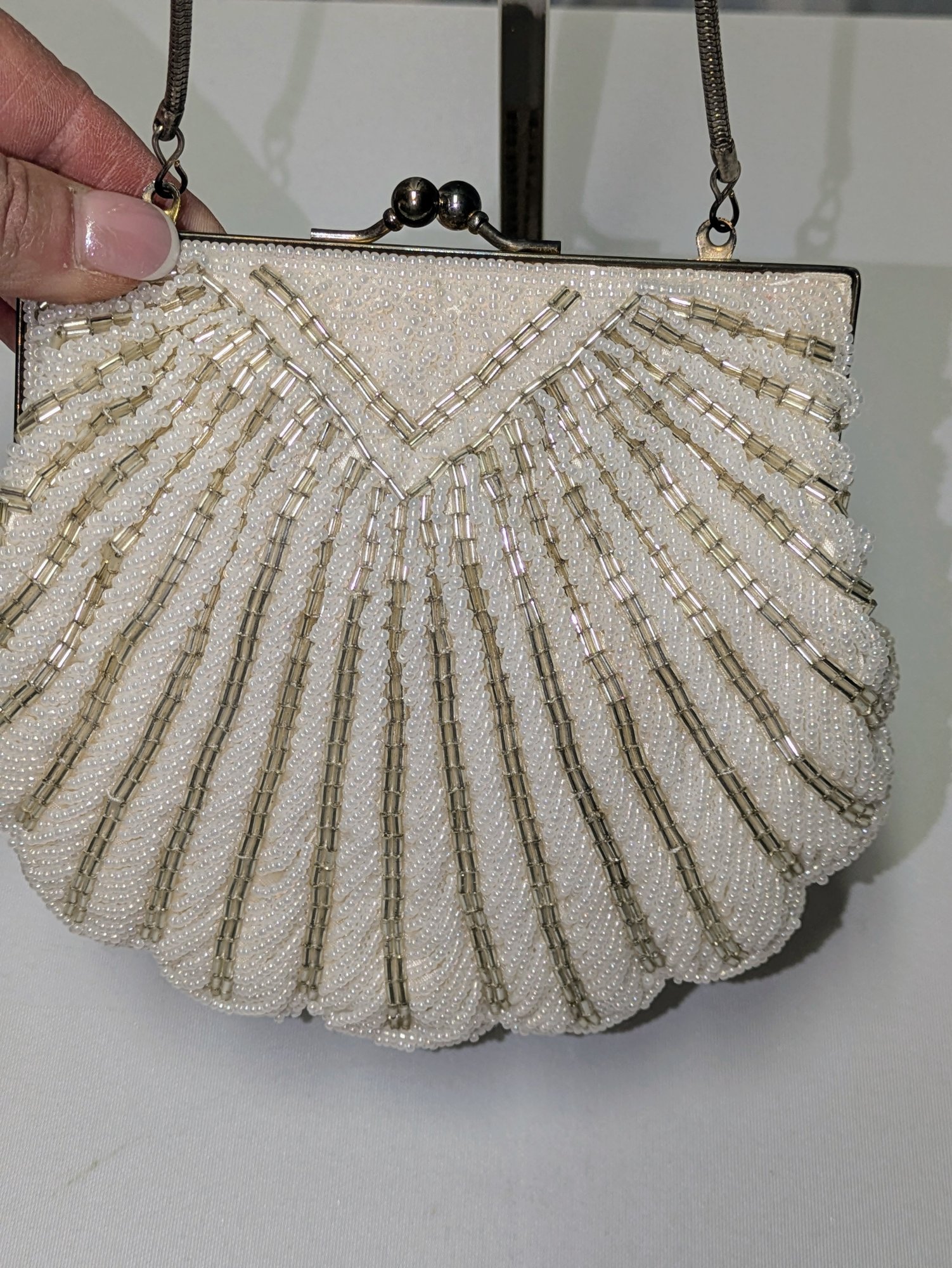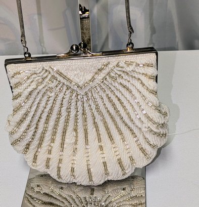 Beautiful Detail and Design in White and Silver Accented Beaded Clam Shell Design. Kiss Clasp Lock and Silver-Tone Strap. Some missing beads are consistent with age and use. Please see all photos as part of the description and condition. Drop 18" / Bag 6" x 6.5" x 1"
