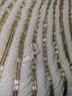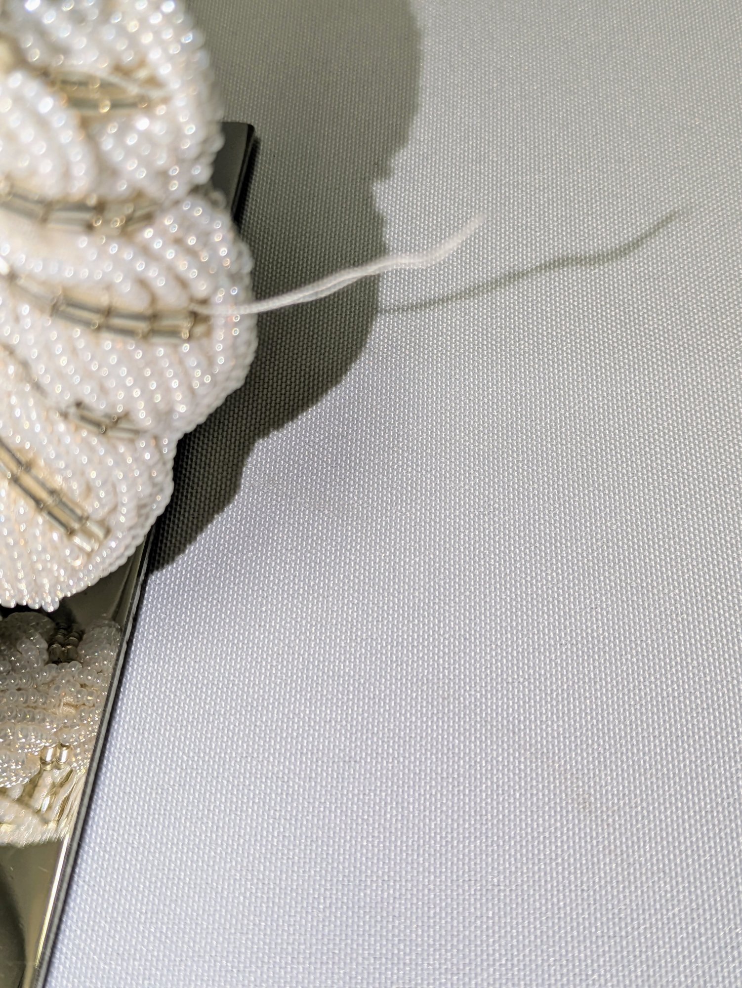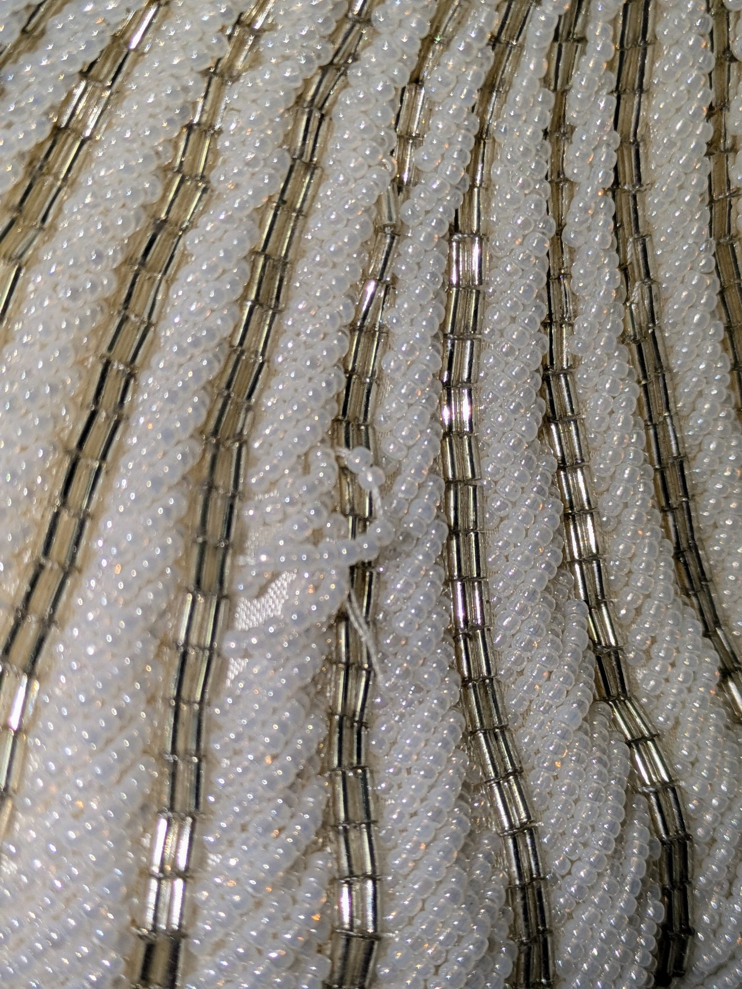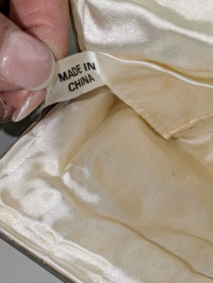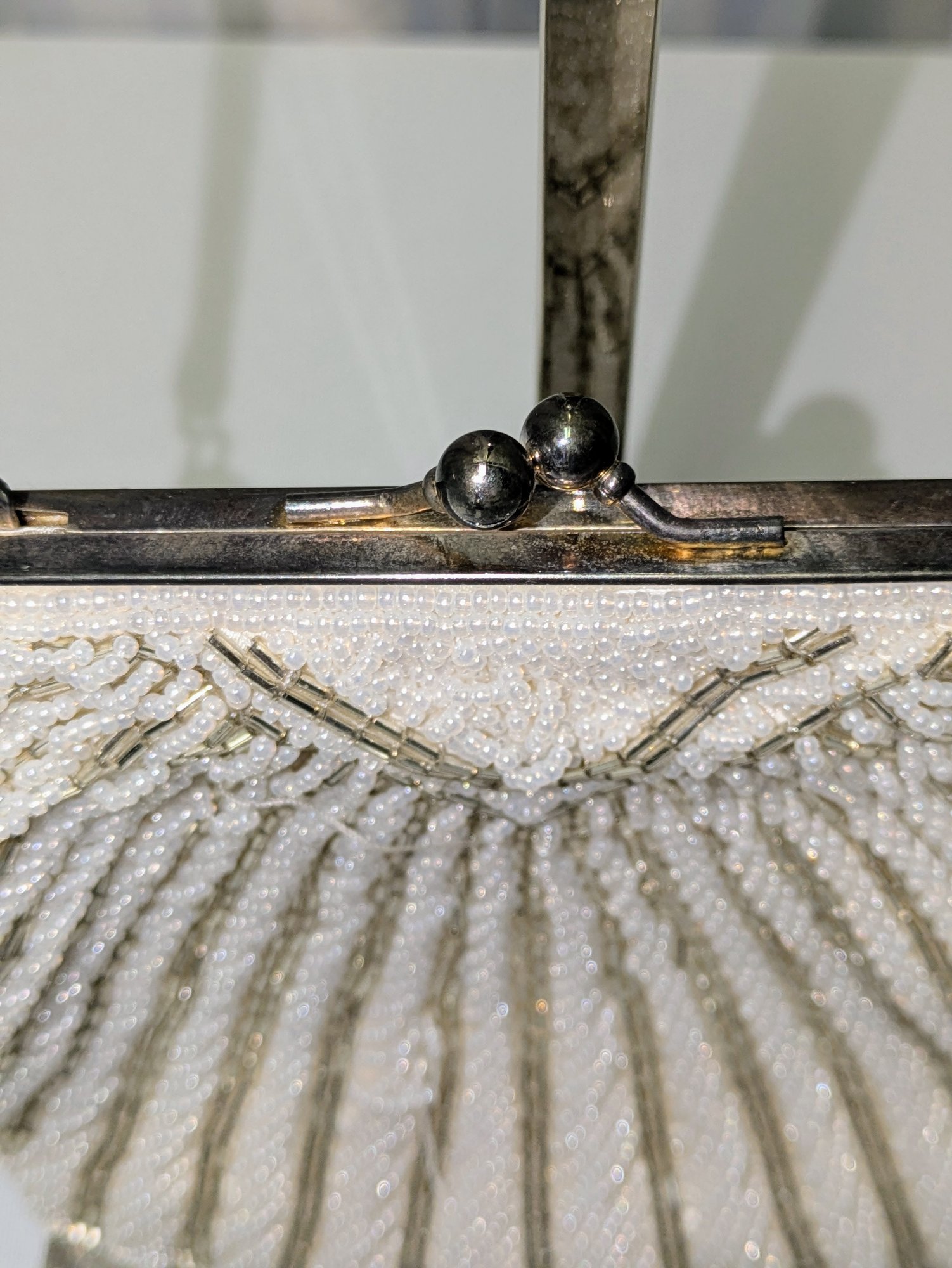 Beautiful Detail and Design in White and Silver Accented Beaded Clam Shell Design. Kiss Clasp Lock and Silver-Tone Strap. Some missing beads are consistent with age and use. Please see all photos as part of the description and condition. Drop 18" / Bag 6" x 6.5" x 1"