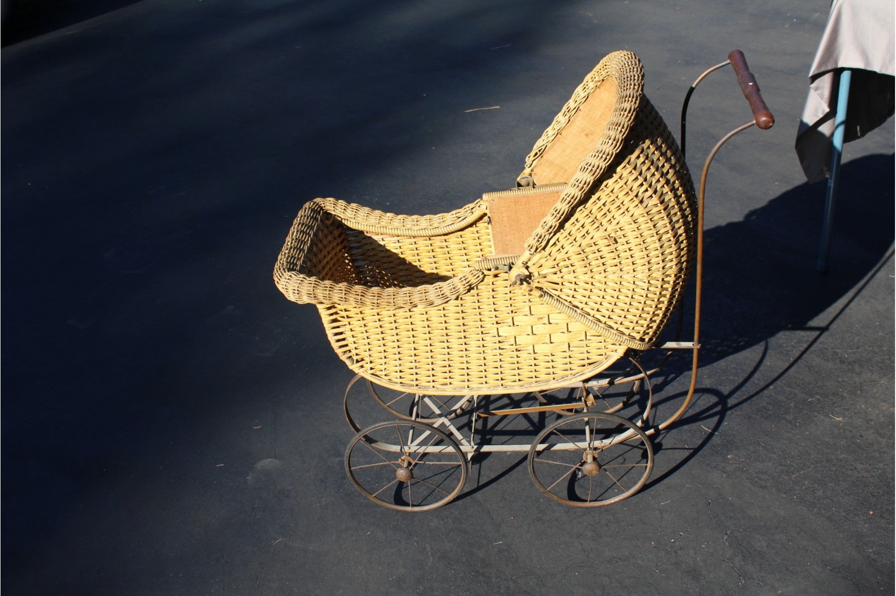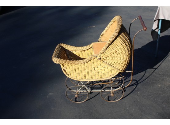 I hesitate to call it Antique implying over 100 years old but it could be. I get the sense of 1930's but could be late 1920's. Solid wheels (one has some sections missing see pic), wicker is in good shape, fabric with slight tears here and there but generally intact. Leather strap has deteriorated. Framework is very good. 30" L, 14"W 33"H