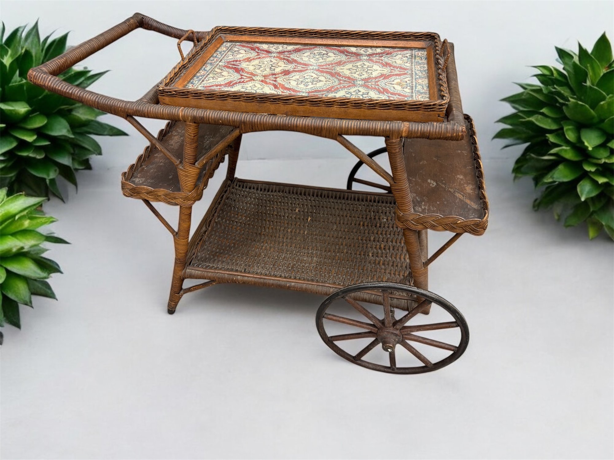 Cart is circa 1920. The top is a removable glass tray. The cart edges are wrapped in wicker, a there are 4" wide wood trays on the sides. The bottom shelf is caned. A small area of cane is missing on one leg. Approximate measurements are: 29" high, 3' long, and 17 1/2" wide.