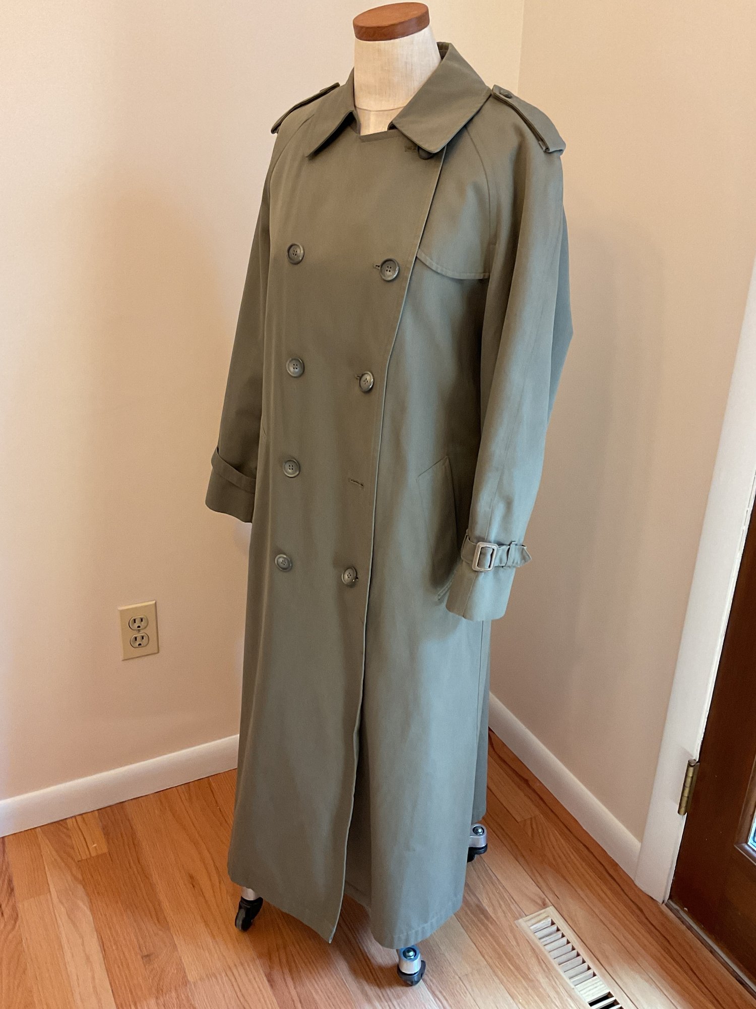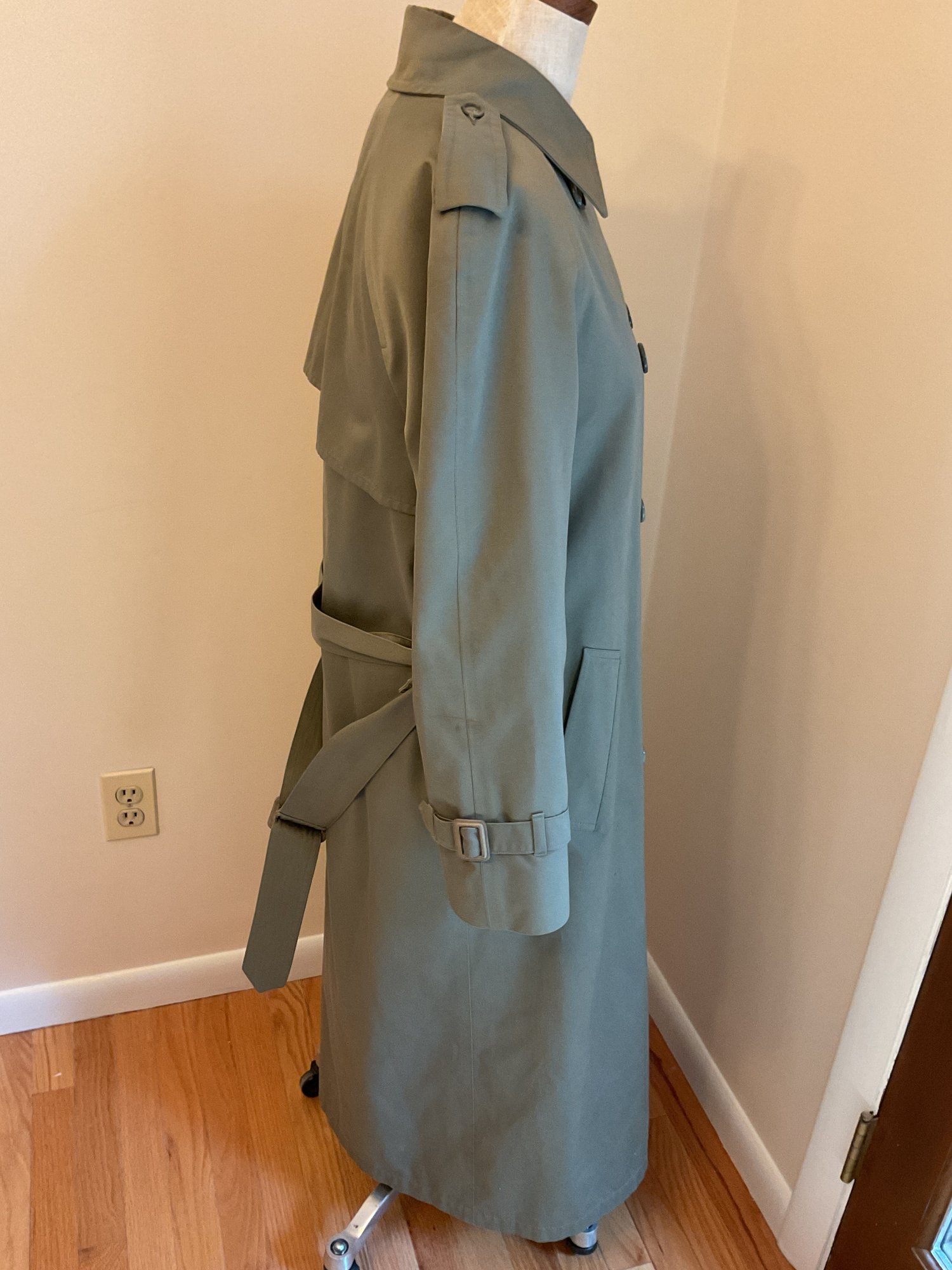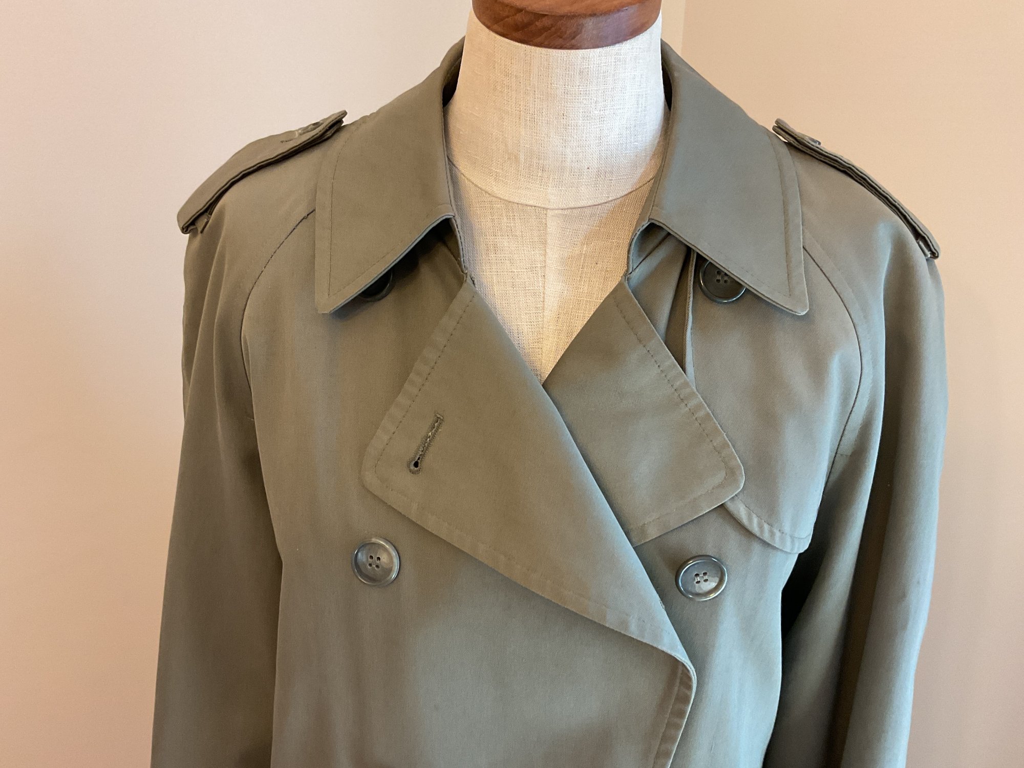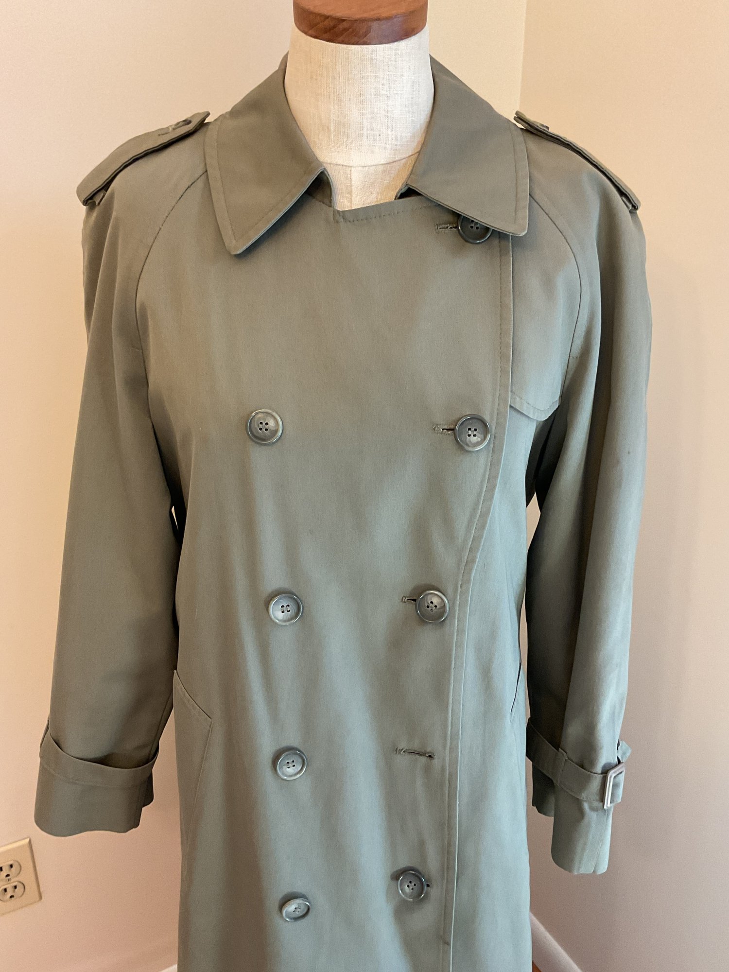 Classic women's double breasted trench coat in taupe, likely 80's vintage and in very good condition. Zip out wool liner, adjustable cuffs and original belt all present. One missing button on the front has replacement on the inside and one small spot of dirt on the sleeve as shown. Timeless style!