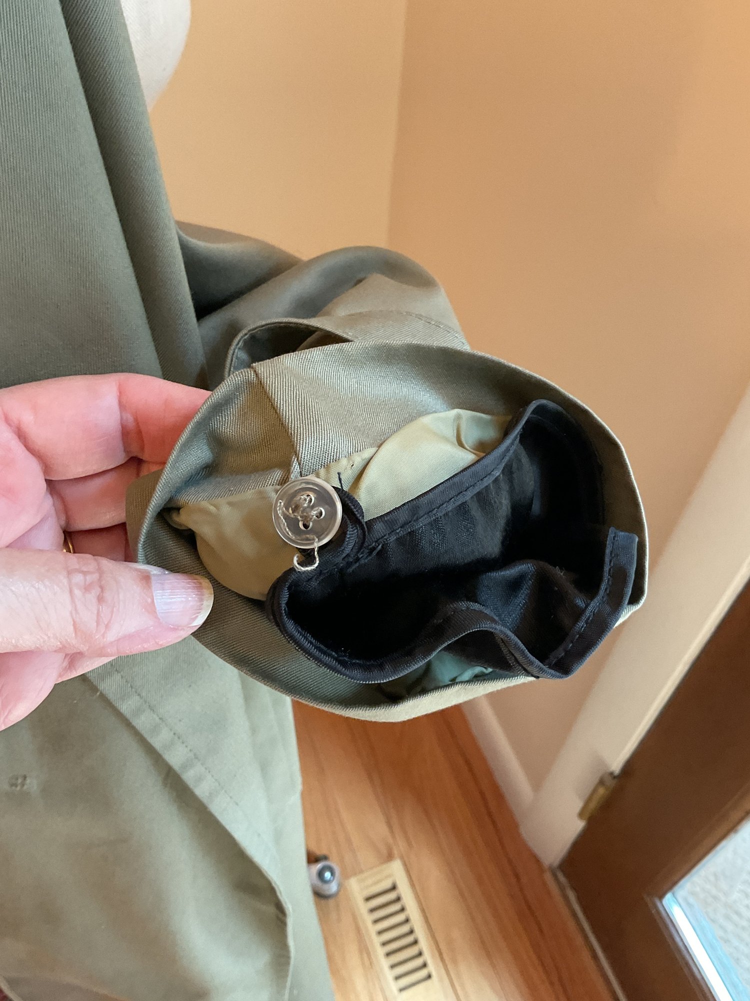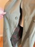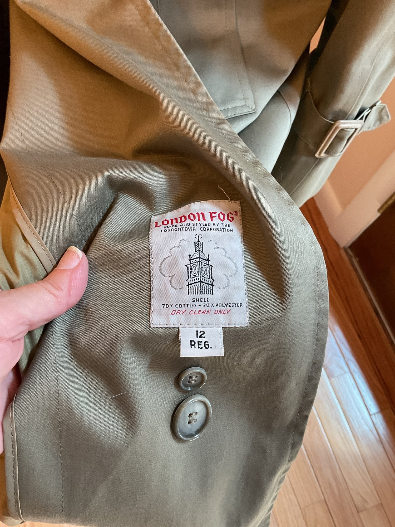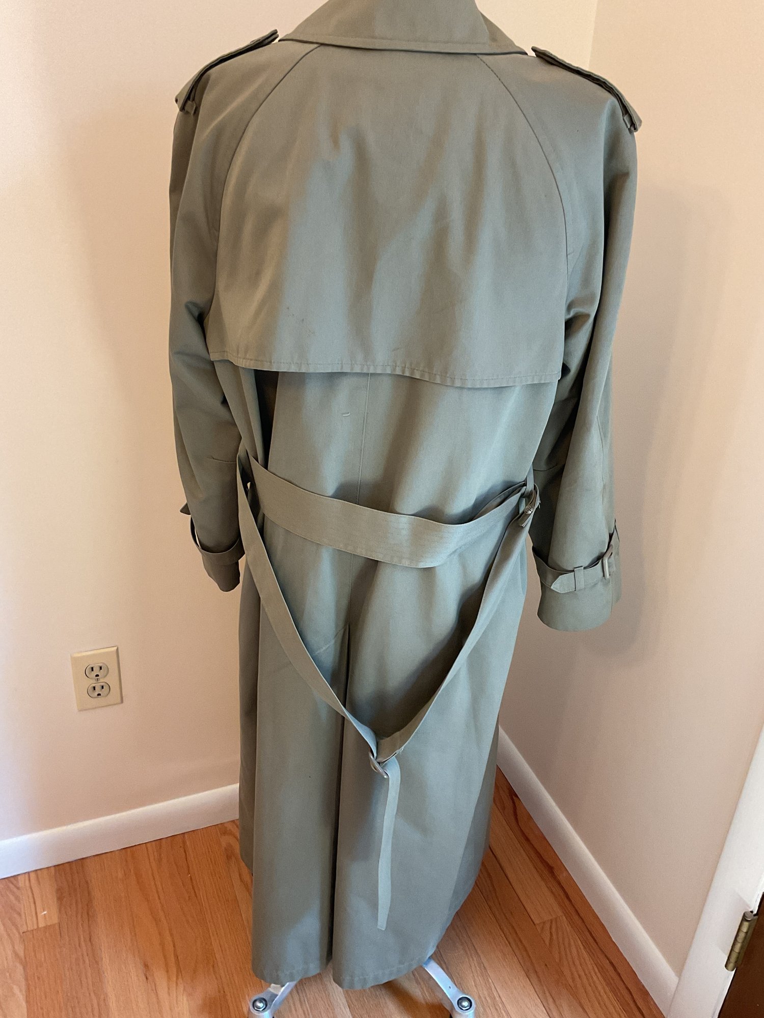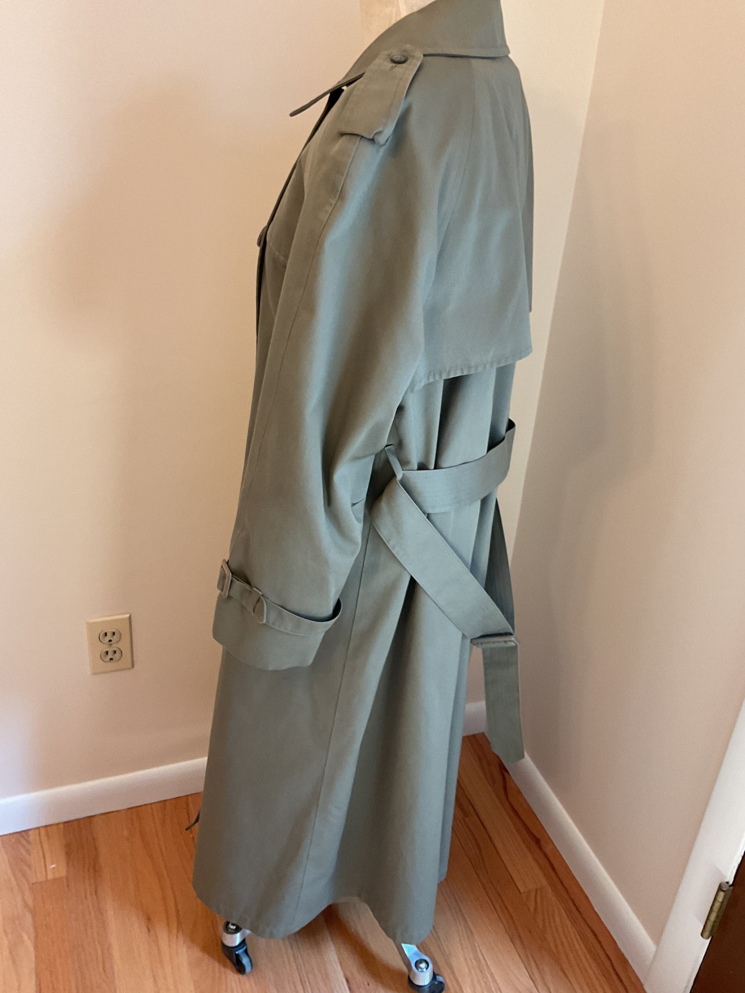 Classic women's double breasted trench coat in taupe, likely 80's vintage and in very good condition. Zip out wool liner, adjustable cuffs and original belt all present. One missing button on the front has replacement on the inside and one small spot of dirt on the sleeve as shown. Timeless style!