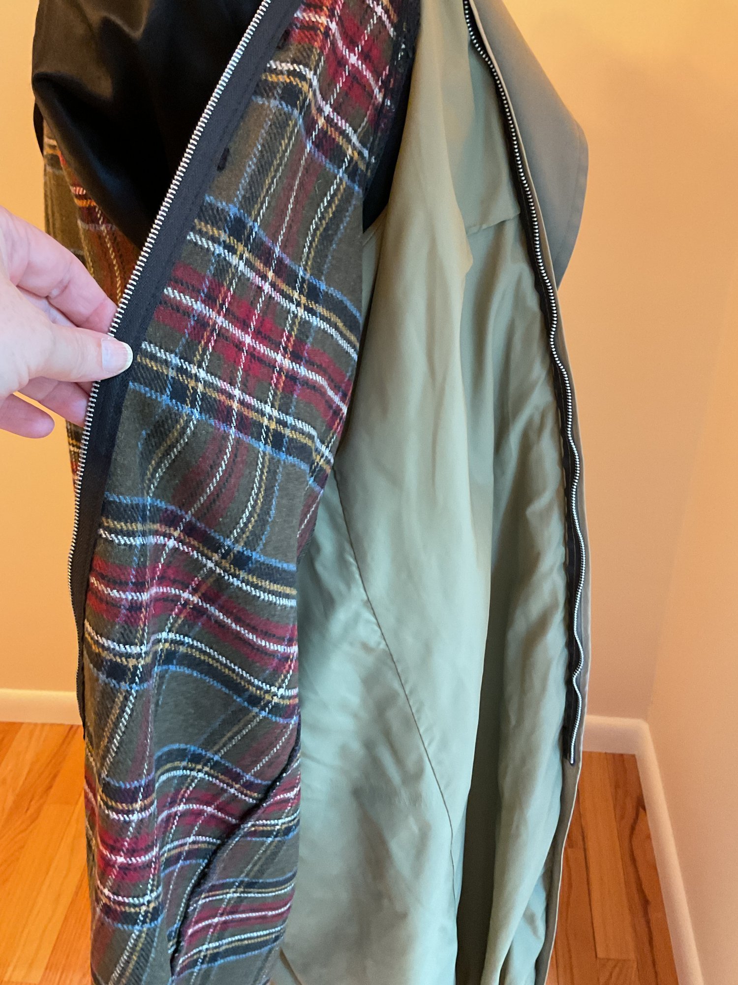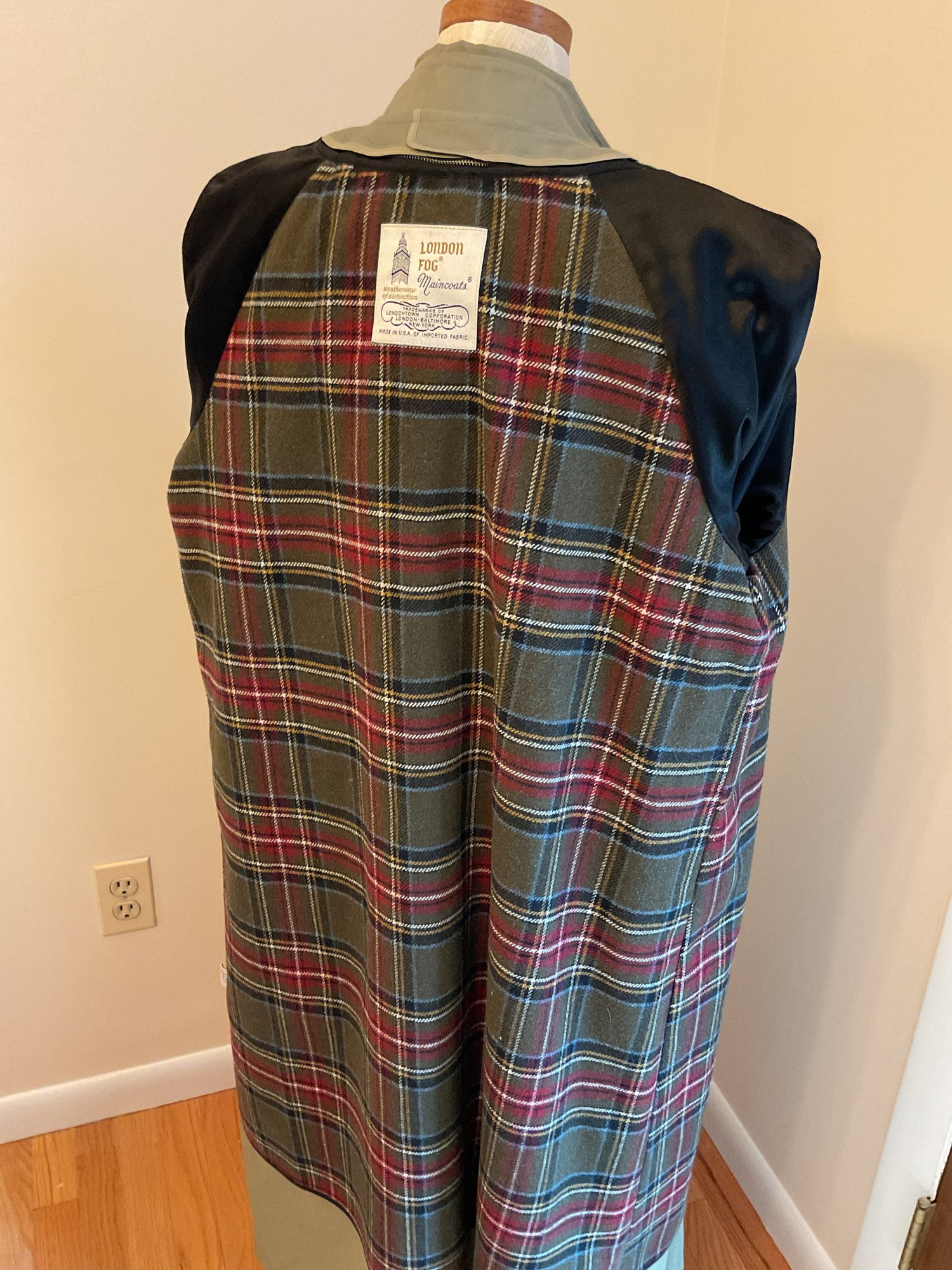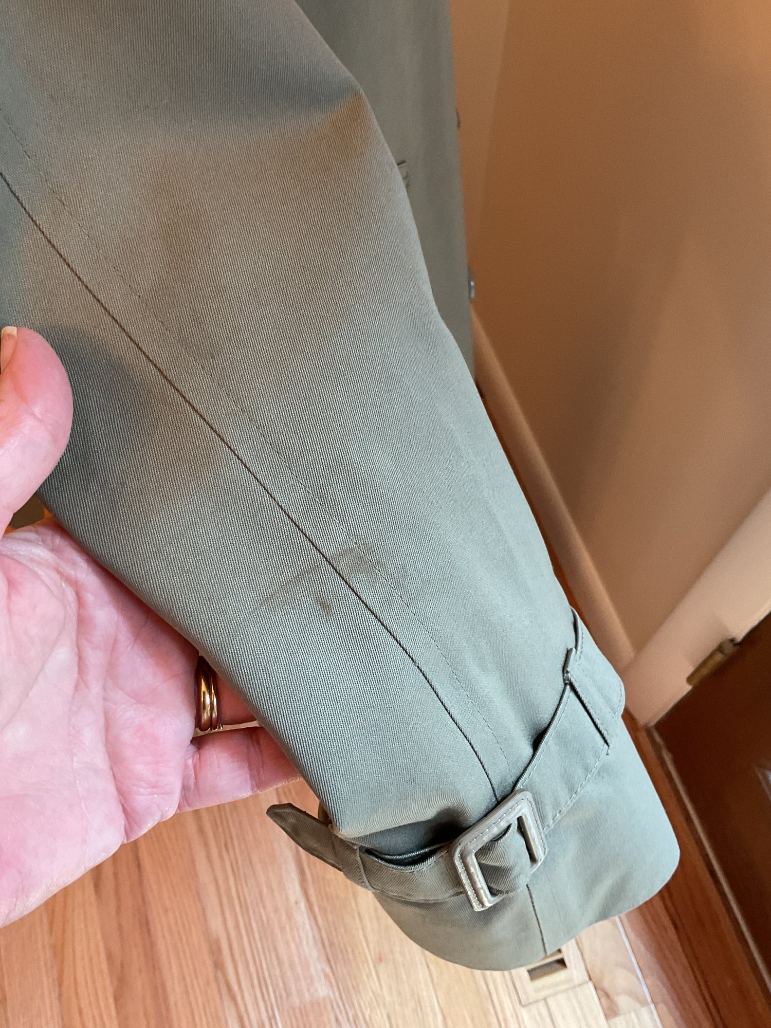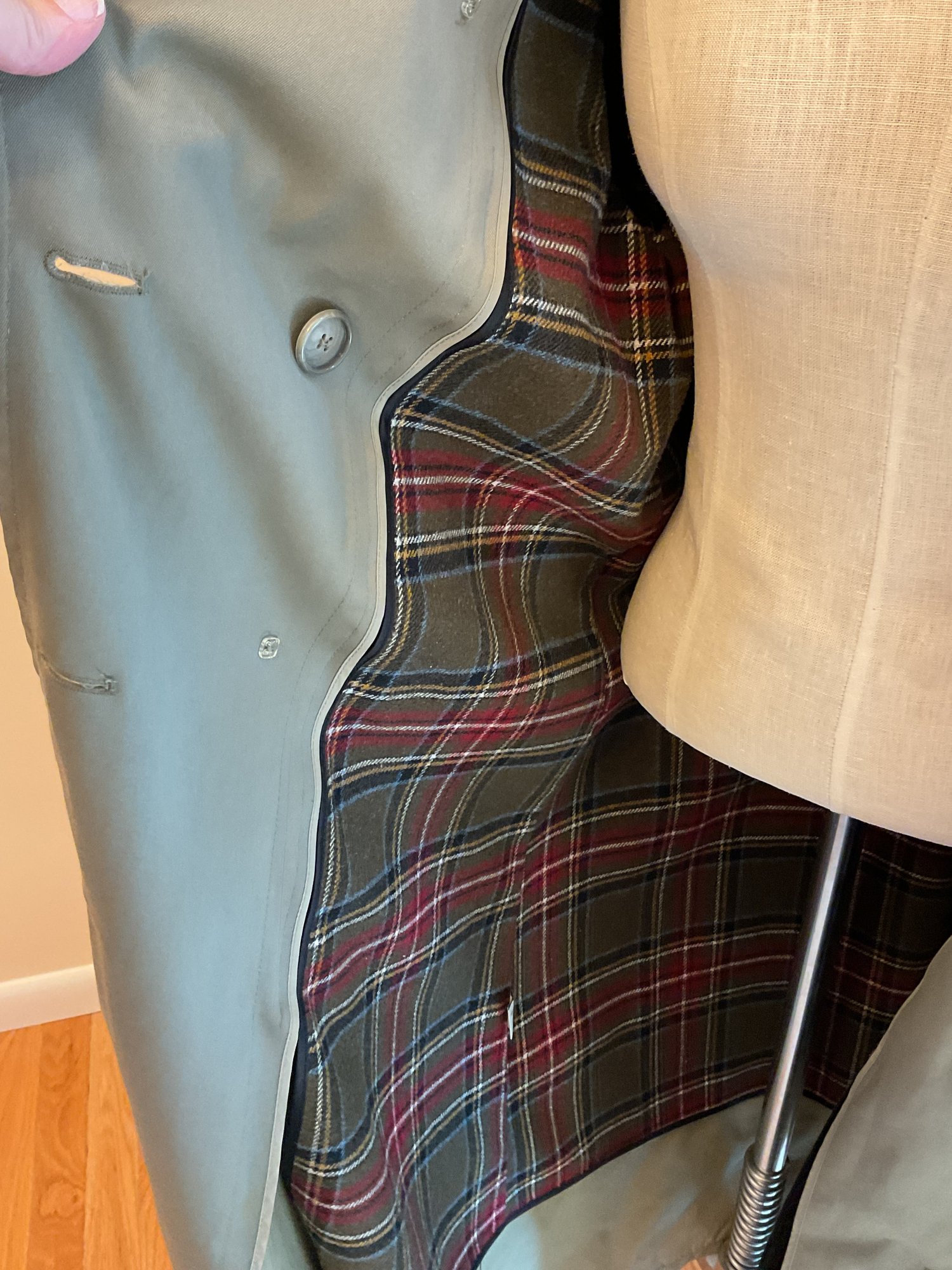 Classic women's double breasted trench coat in taupe, likely 80's vintage and in very good condition. Zip out wool liner, adjustable cuffs and original belt all present. One missing button on the front has replacement on the inside and one small spot of dirt on the sleeve as shown. Timeless style!