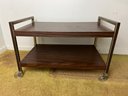 Vintage two-tier faux wood grain finish "TV cart" with square modern lines and aluminum accents on either end.